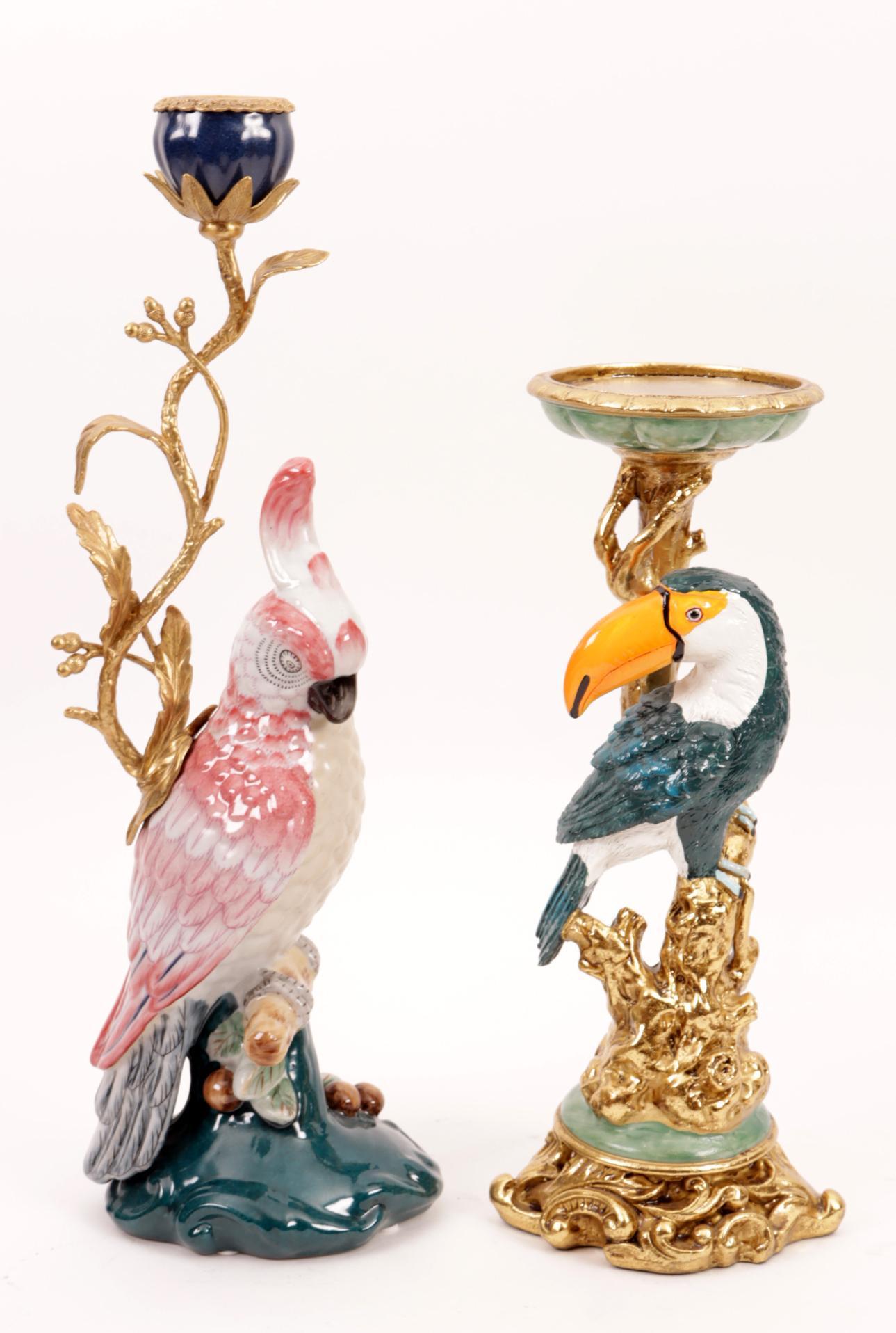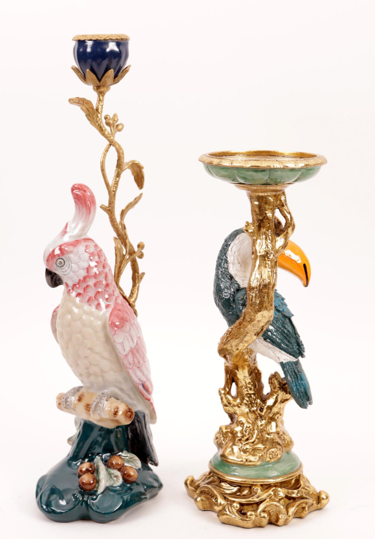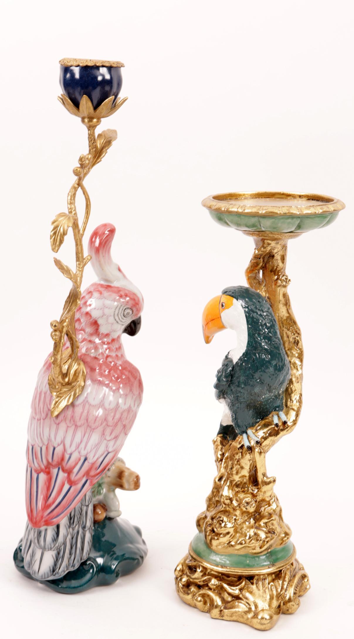 2 Koperen met porseleinen kandelaars i.v.v. vogels