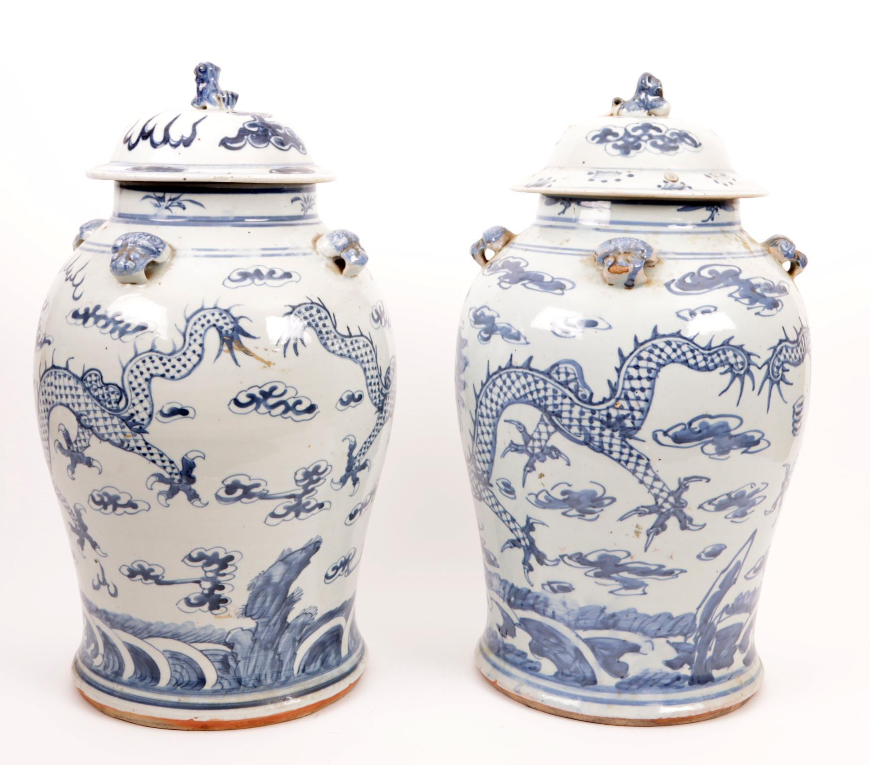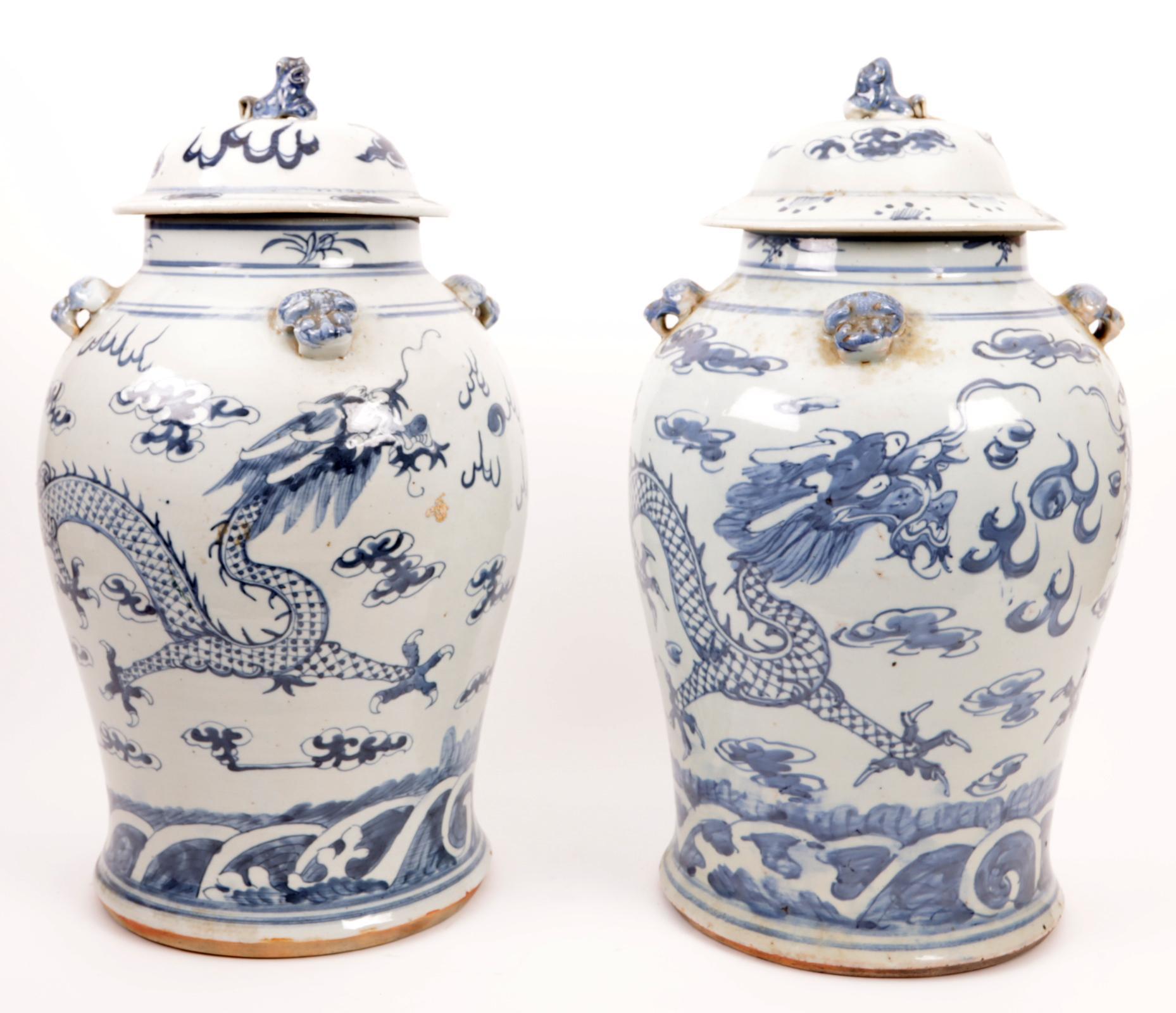 2 Oude blauw/wit met draken gedecoreerde Chinees porseleinen dekselvazen, h.47 cm.