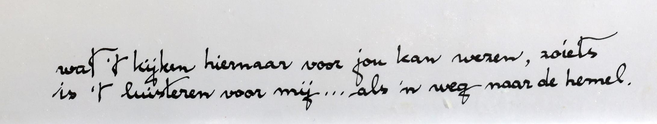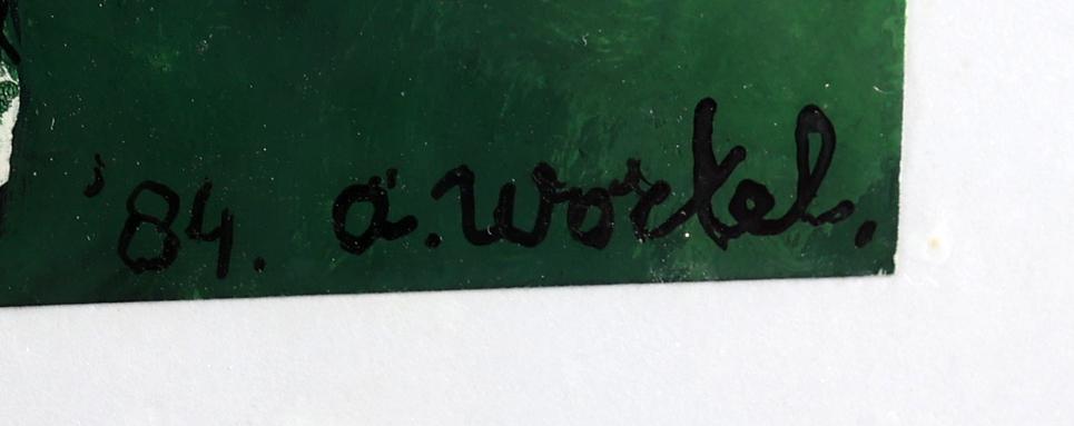 Ans Wortel (1929), "Wat het kijken hier naar voor jou kan wezen, zoiets is het luisteren voor mij ... als 'm weg naar de hemel", gemengde techniek op papier, 28 x 30,5 cm., gesigneerd en gedateerd 4/1984