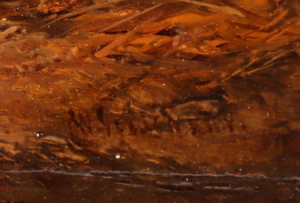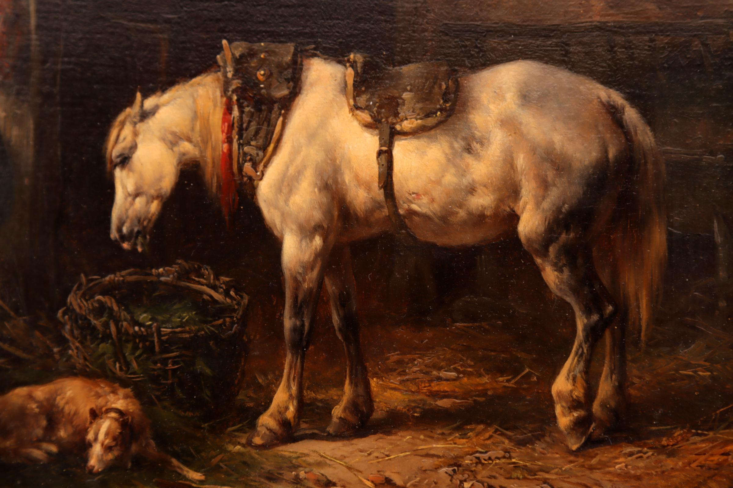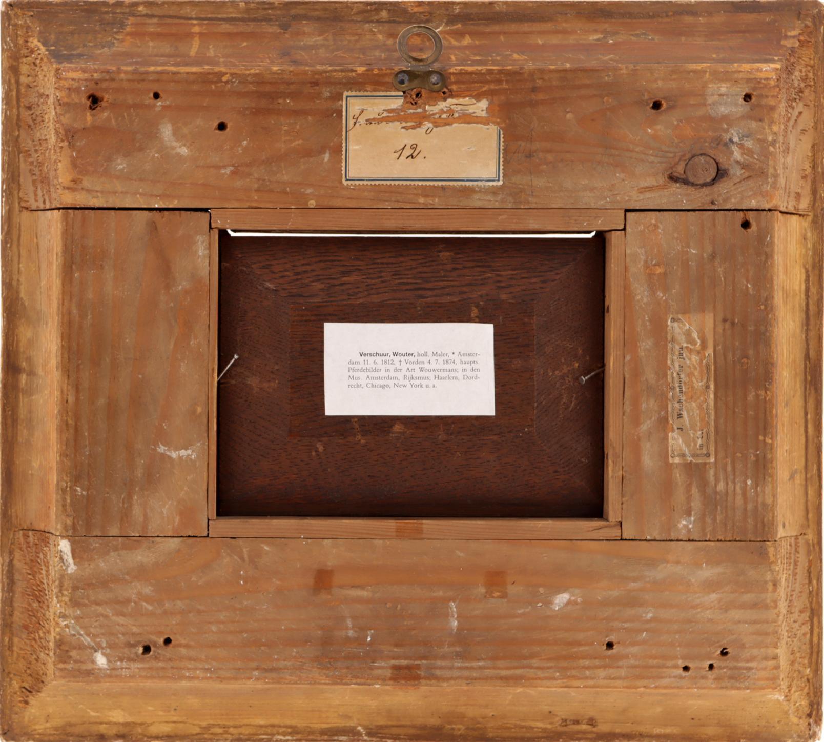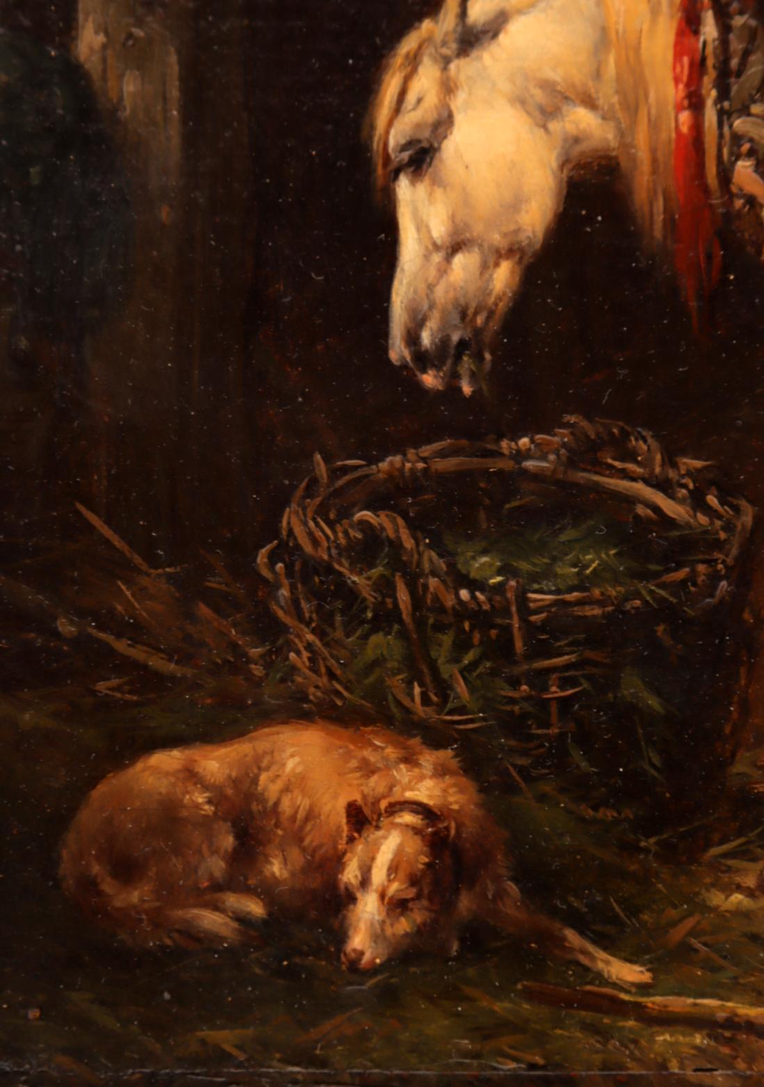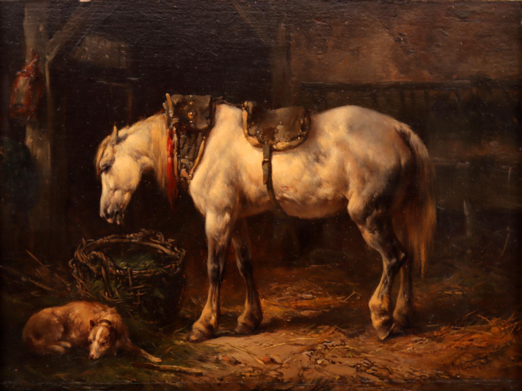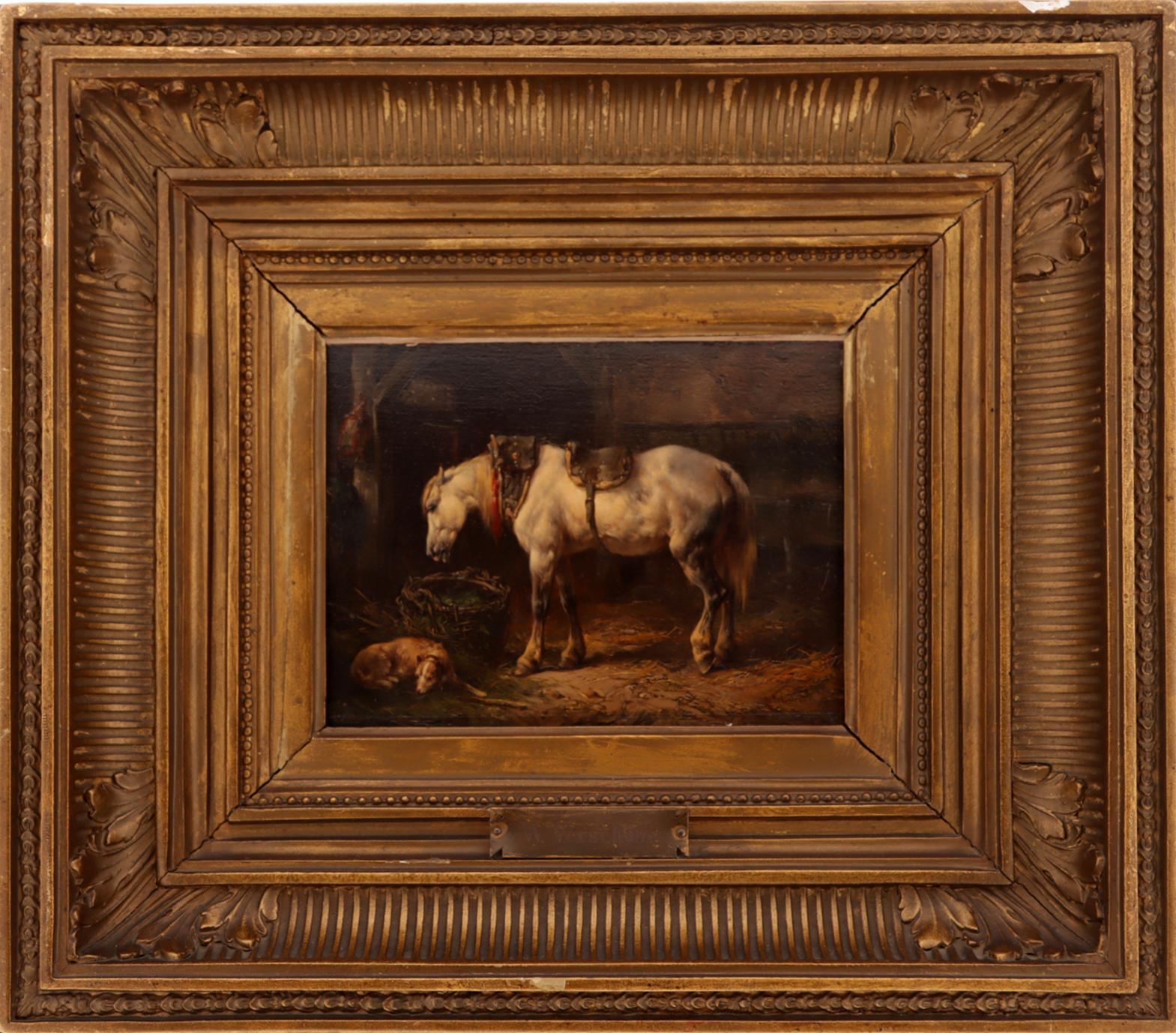 Wouterus Verschuur sr. (1812-1874), Stalinterieur met grazend paard en hond, olieverf op paneel, 17,5 x 12,5 cm.