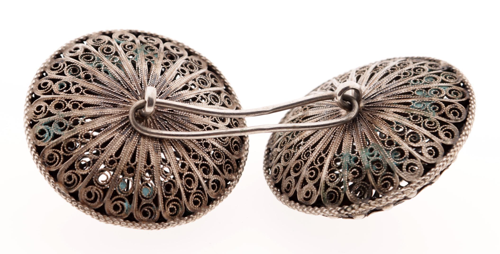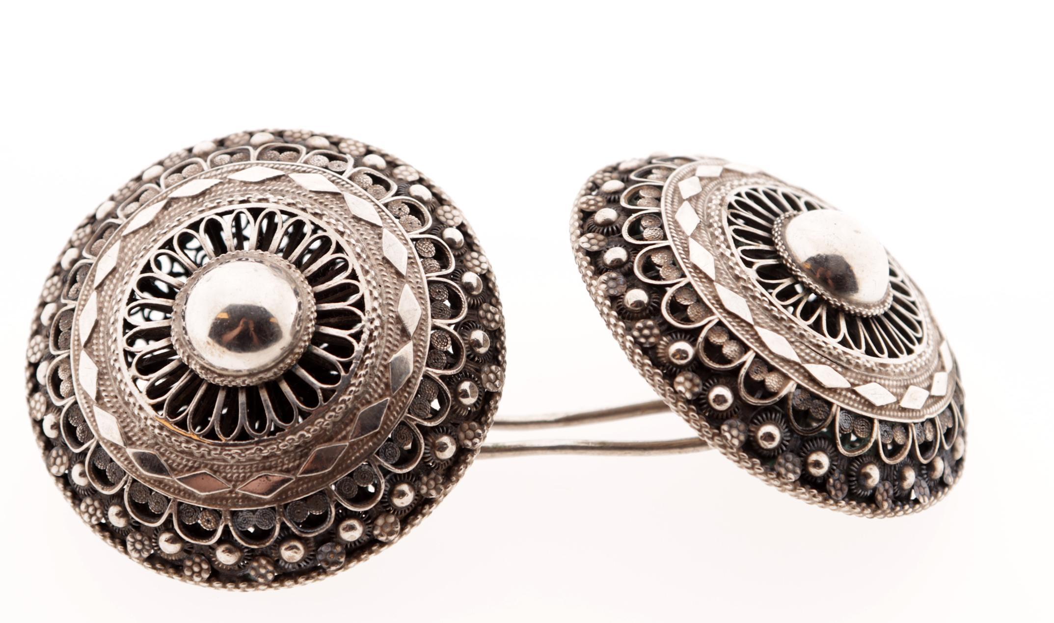 Twee grote 2e gehalte zilveren Zeeuwse knopen, diam.8 cm., 225 gram