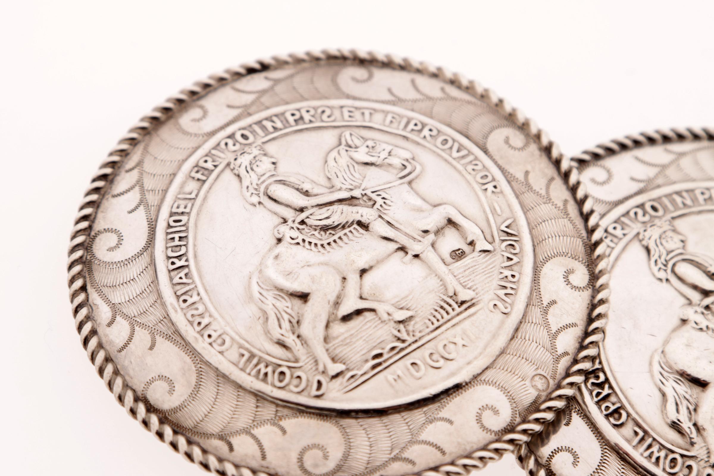 Twee 2e gehalte zilveren knopen met voorstelling van ruiters te paard, diam.9 cm., 108 gram