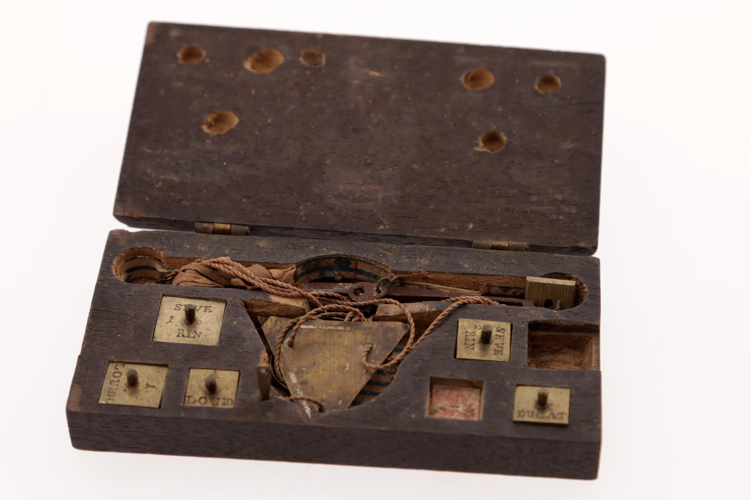 Antieke gewichtendoosje met weegschaaltje en gewichtjes
