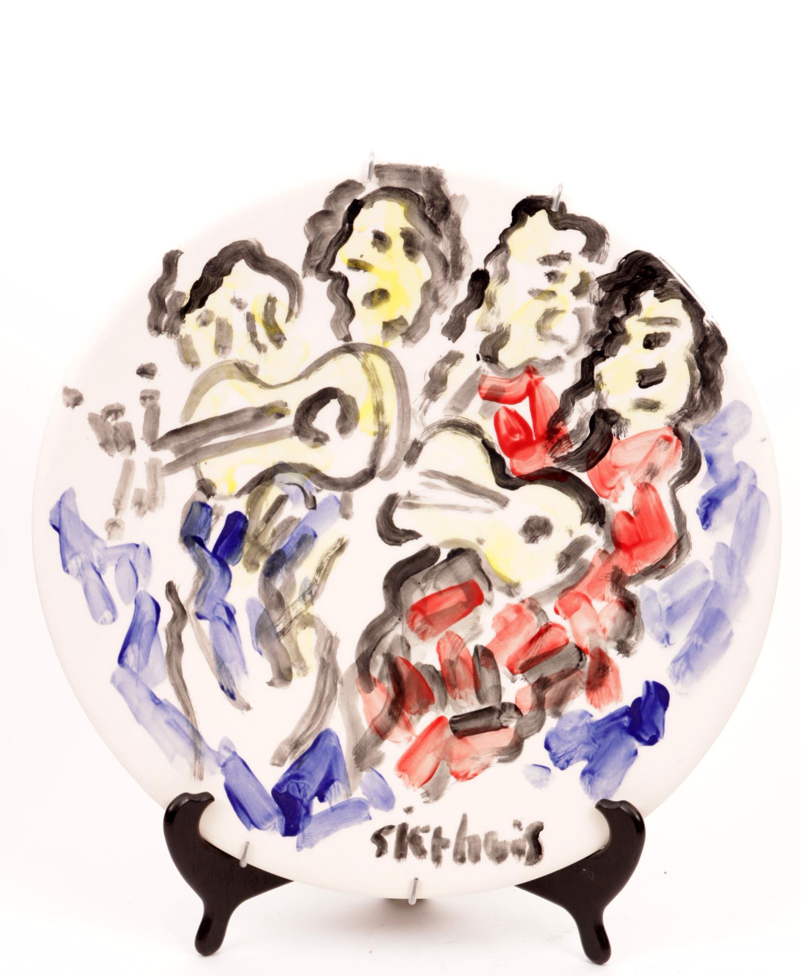 Johannes Alphonsus (Jan) Sierhuis (1928-2023), keramiek schotel met afbeelding van Spaanse danseres met gitaristen, diam.36 cm., provenance particuliere collectie
