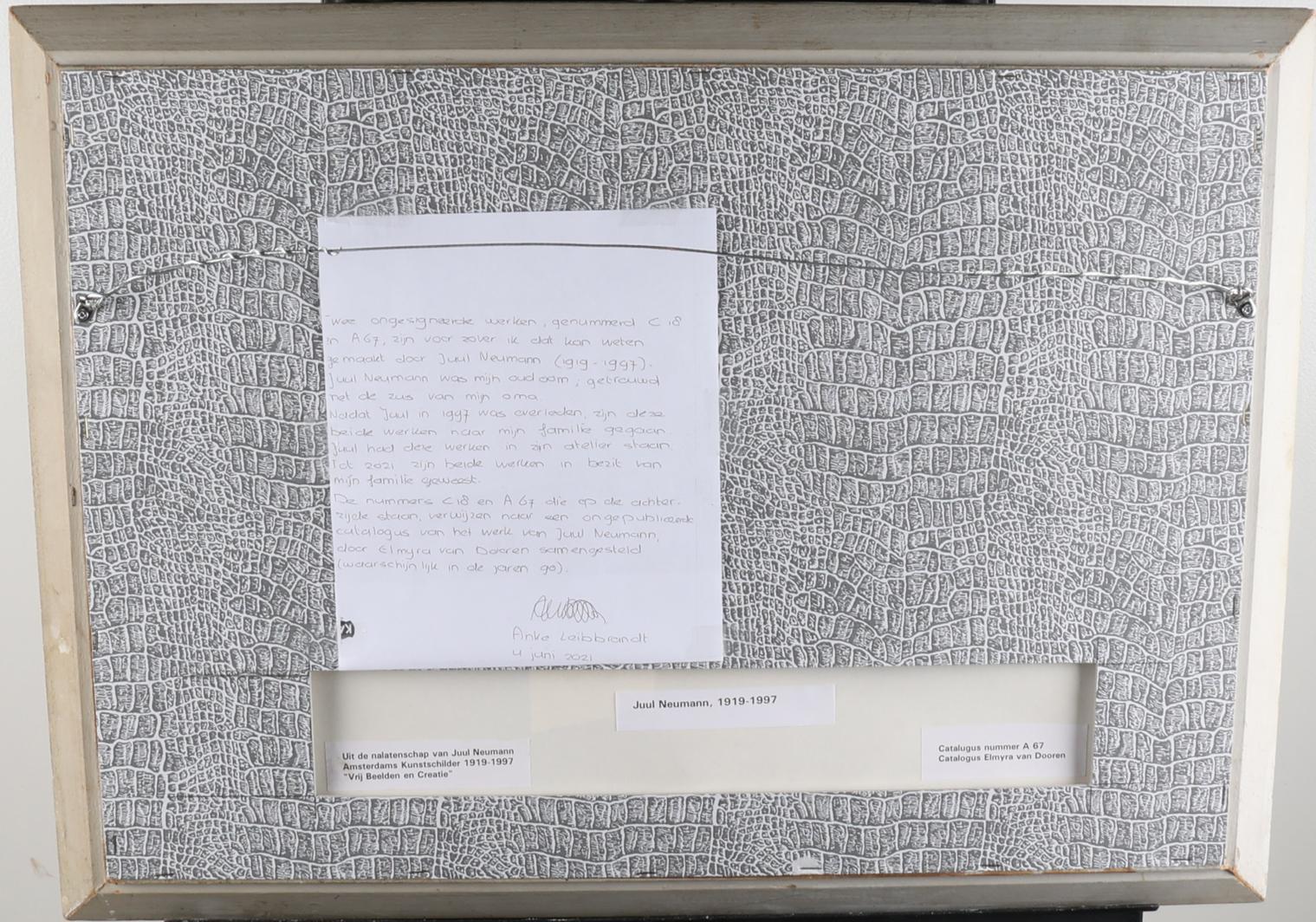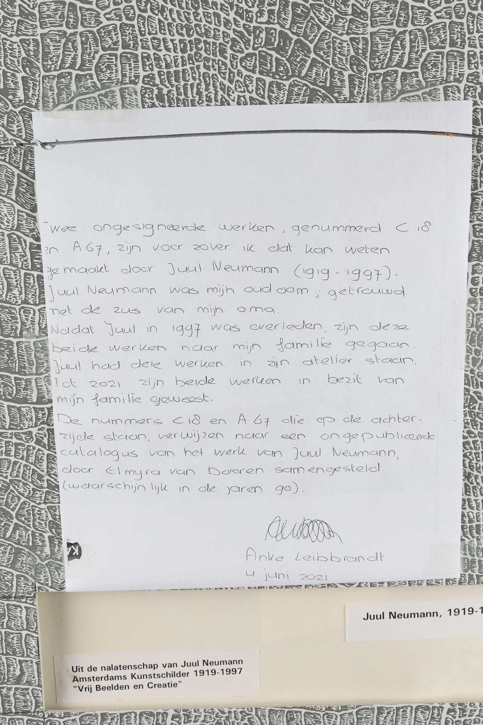 Juul Neumann (1919-1997), Abstract, catalogus nummer A67 uit de catalogus van Elmyra van Doorn, olieverf op papier, 50 x 35 cm., met authenticiteitsverklaring aan achterzijde. Provenance: particuliere collectie