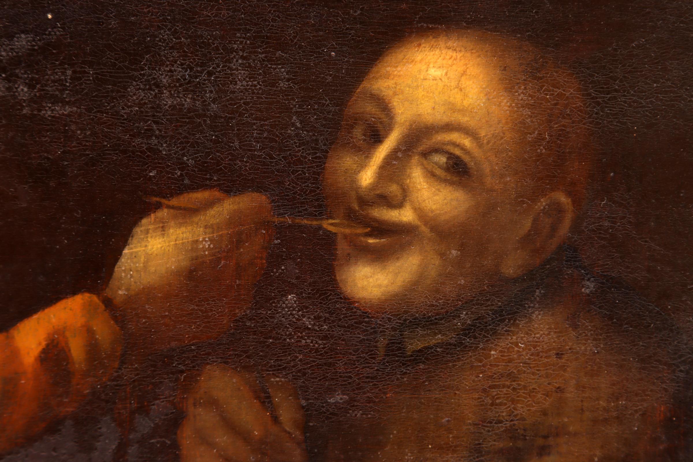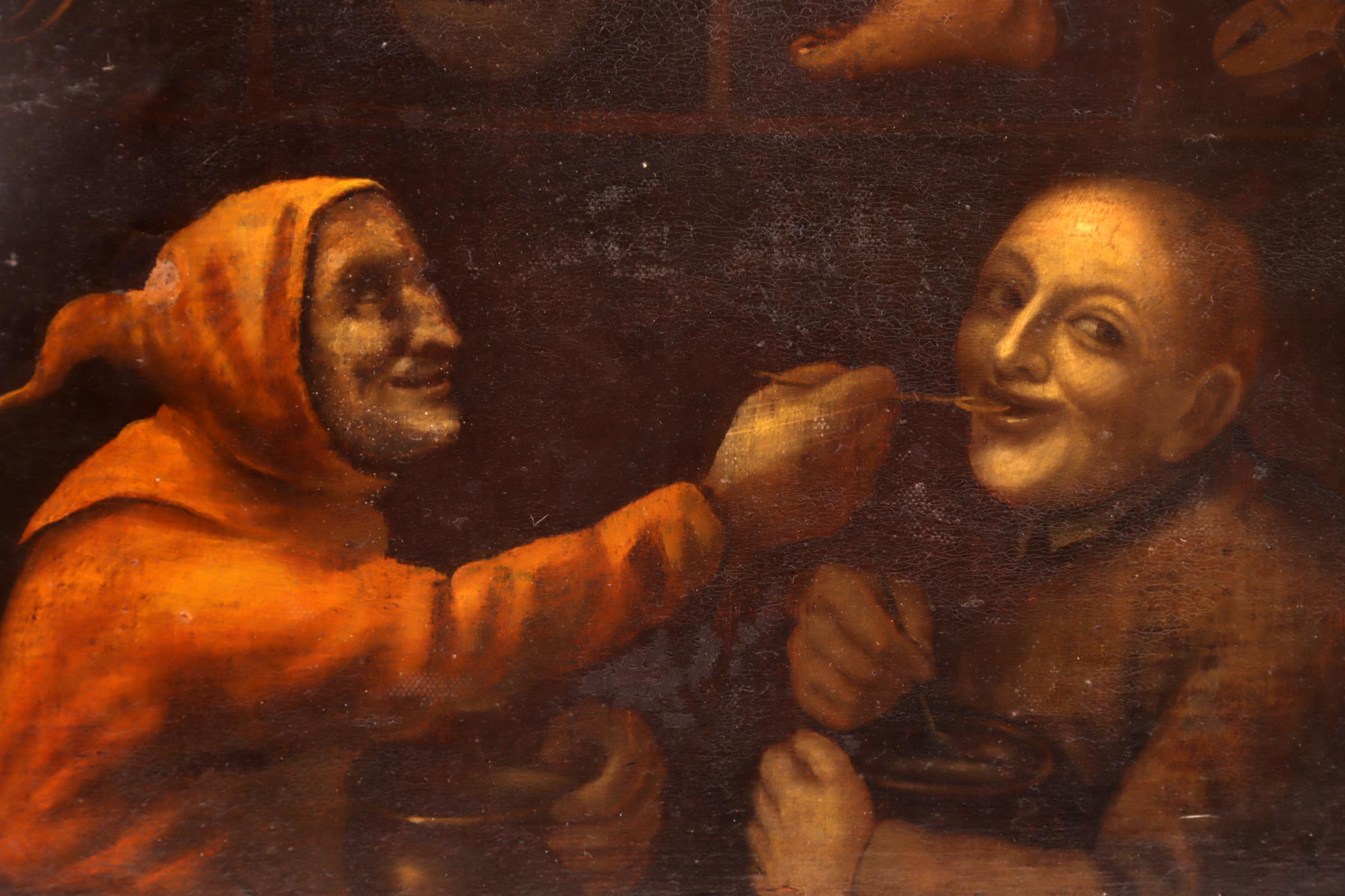 Omgeving Cornelis Jacobsz. Delff (1571-1643), Twee koks: vrij naar zestiende-eeuwse rebus 'De Werelt Voet Ve[d]el Sotten', olieverf op paneel, 17,5 x 24 cm. Provenance: privé collectie Museo Raset, Spanje