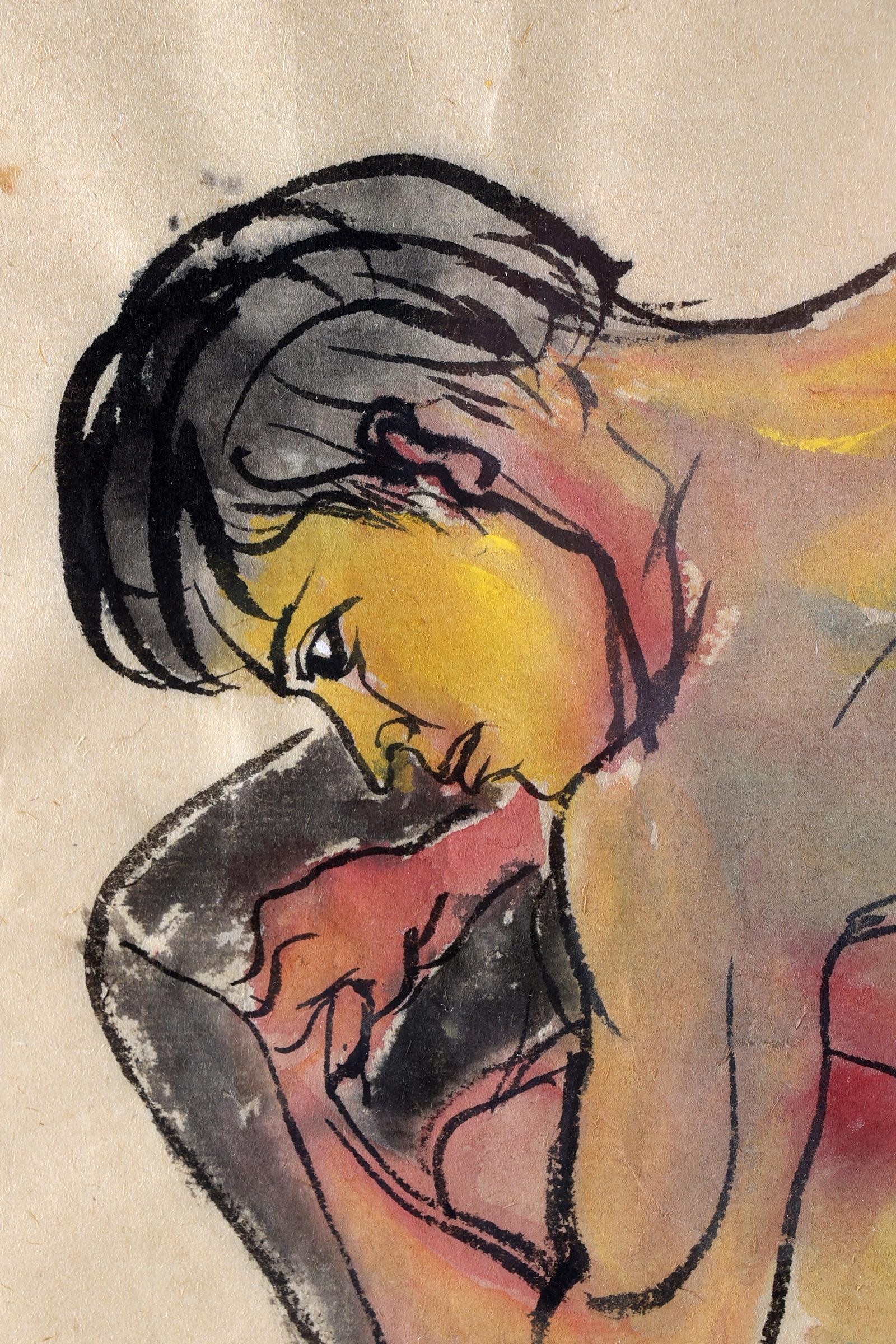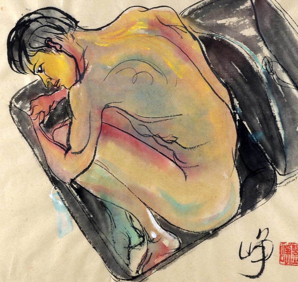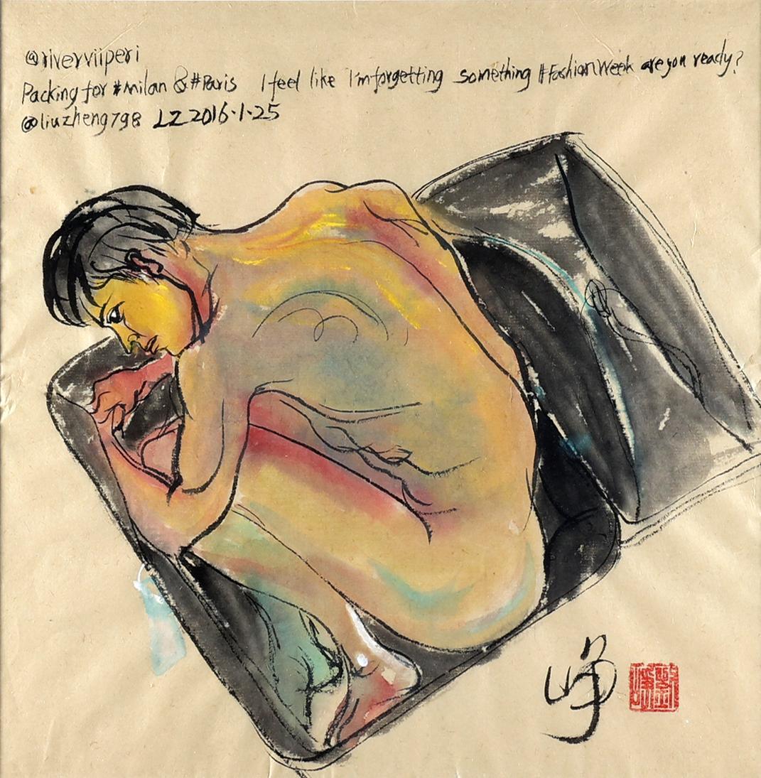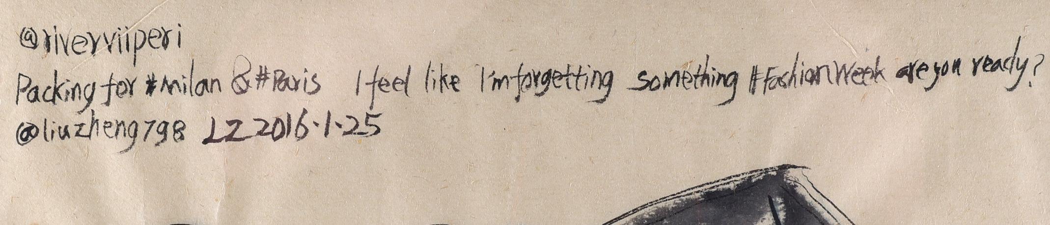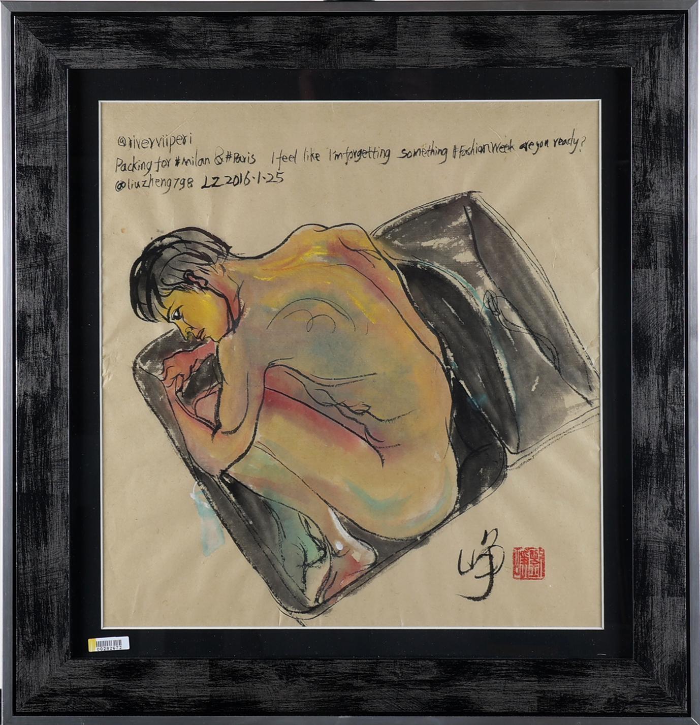 Liu Zheng (1972), Instagrammed Packing for Milan, Chinese inkt op bamboe papier, 42 x 40 cm. Nota bene: de hedendaagse kunstenaar Liu Zheng vertaalt beelden van sociale media in levendige aquarellen op handgemaakt bamboepapier, geïnspireerd door het alledaagse digitale leven. Zijn Instagram-gebaseerde werken combineren traditie en actualiteit in een herkenbare, dynamische stijl