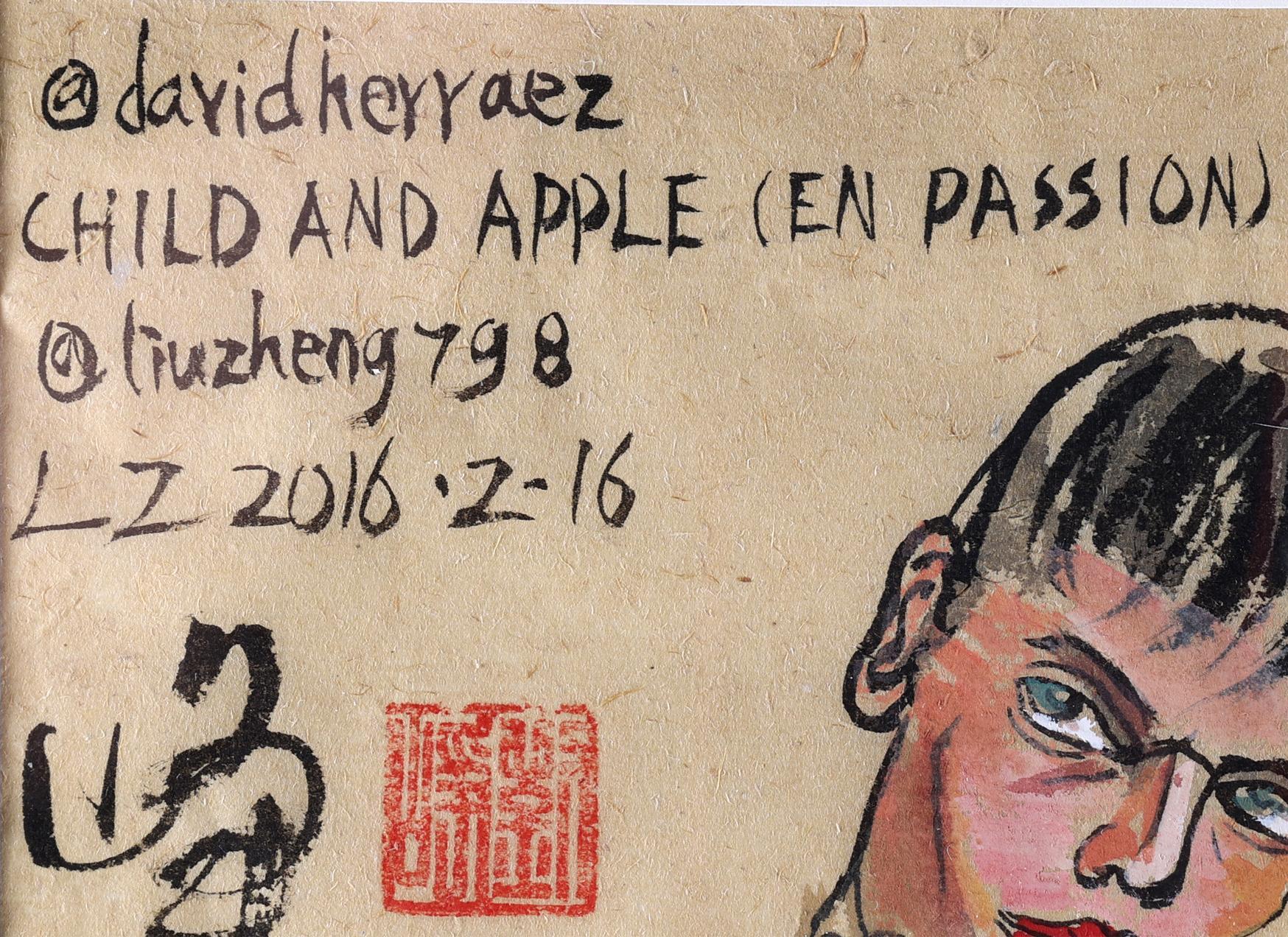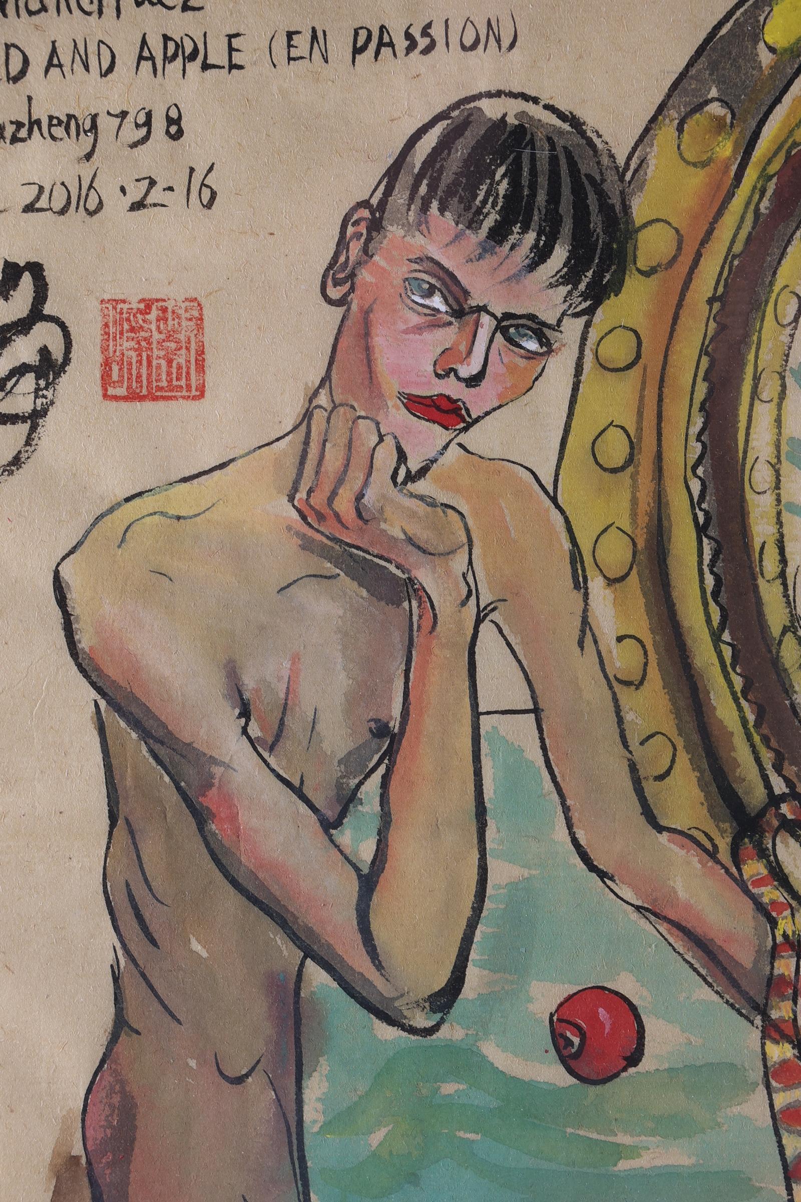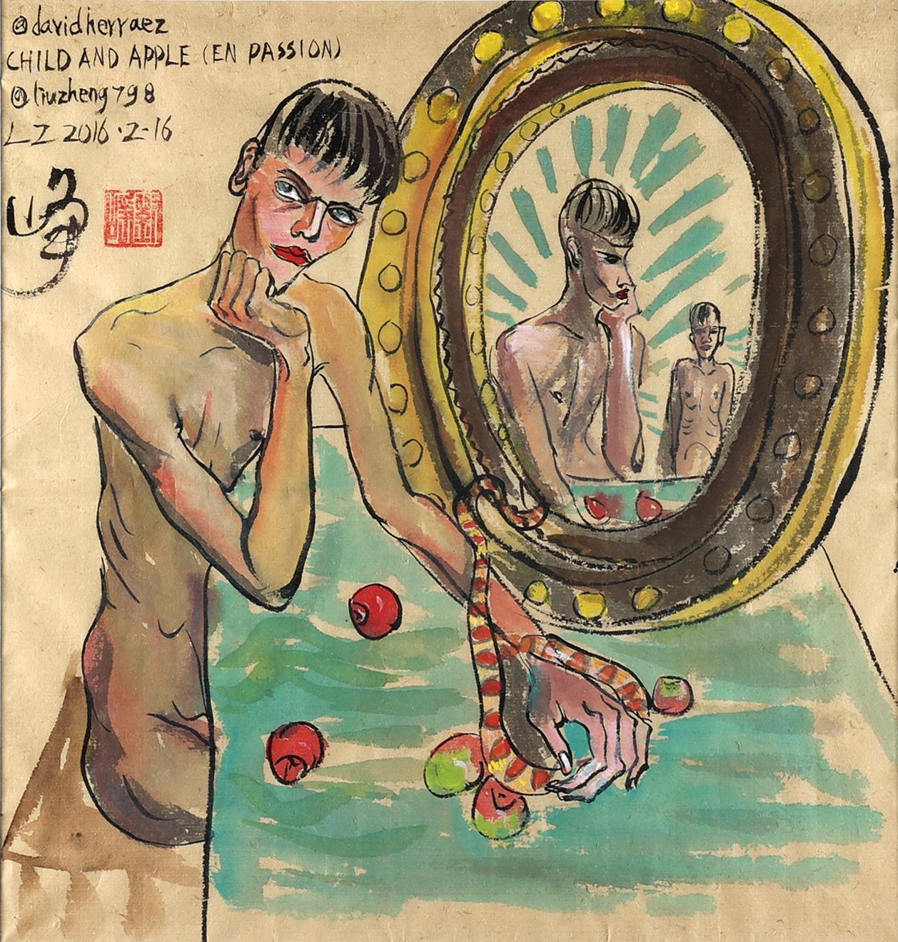 Liu Zheng (1972), Instagrammed jongen bij spiegel, Chinese inkt op bamboe papier, 42 x 40 cm. Nota bene: de hedendaagse kunstenaar Liu Zheng vertaalt beelden van sociale media in levendige aquarellen op handgemaakt bamboepapier, geïnspireerd door het alledaagse digitale leven. Zijn Instagram-gebaseerde werken combineren traditie en actualiteit in een herkenbare, dynamische stijl