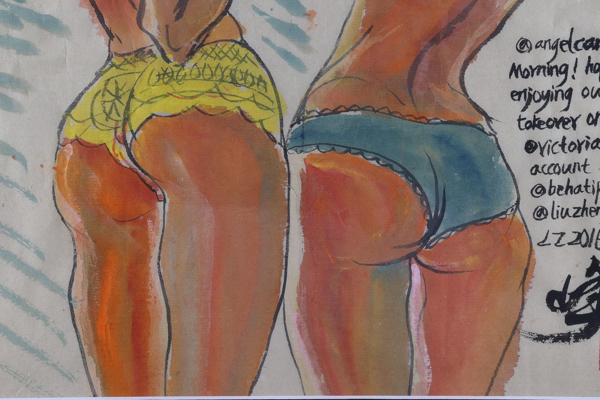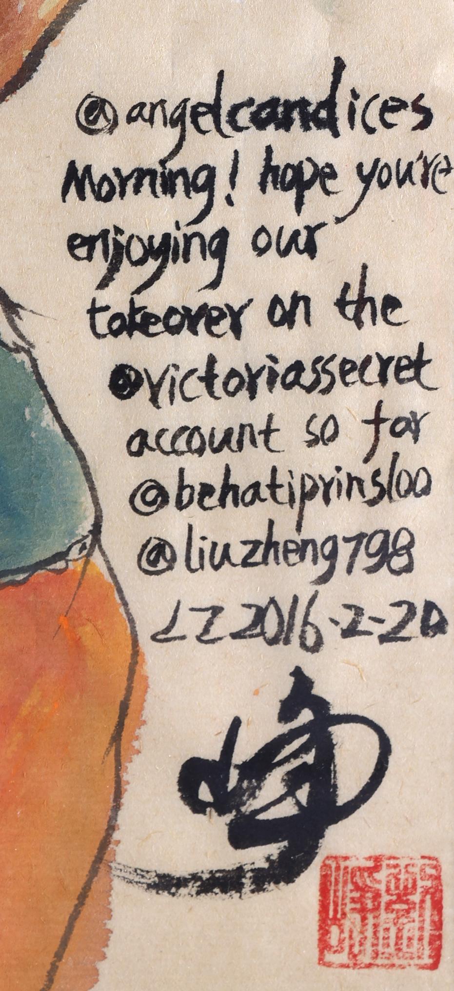 Liu Zheng (1972), Instagrammed Angel Candices, Chinese inkt op bamboe papier, 42 x 40 cm. Nota bene: de hedendaagse kunstenaar Liu Zheng vertaalt beelden van sociale media in levendige aquarellen op handgemaakt bamboepapier, geïnspireerd door het alledaagse digitale leven. Zijn Instagram-gebaseerde werken combineren traditie en actualiteit in een herkenbare, dynamische stijl