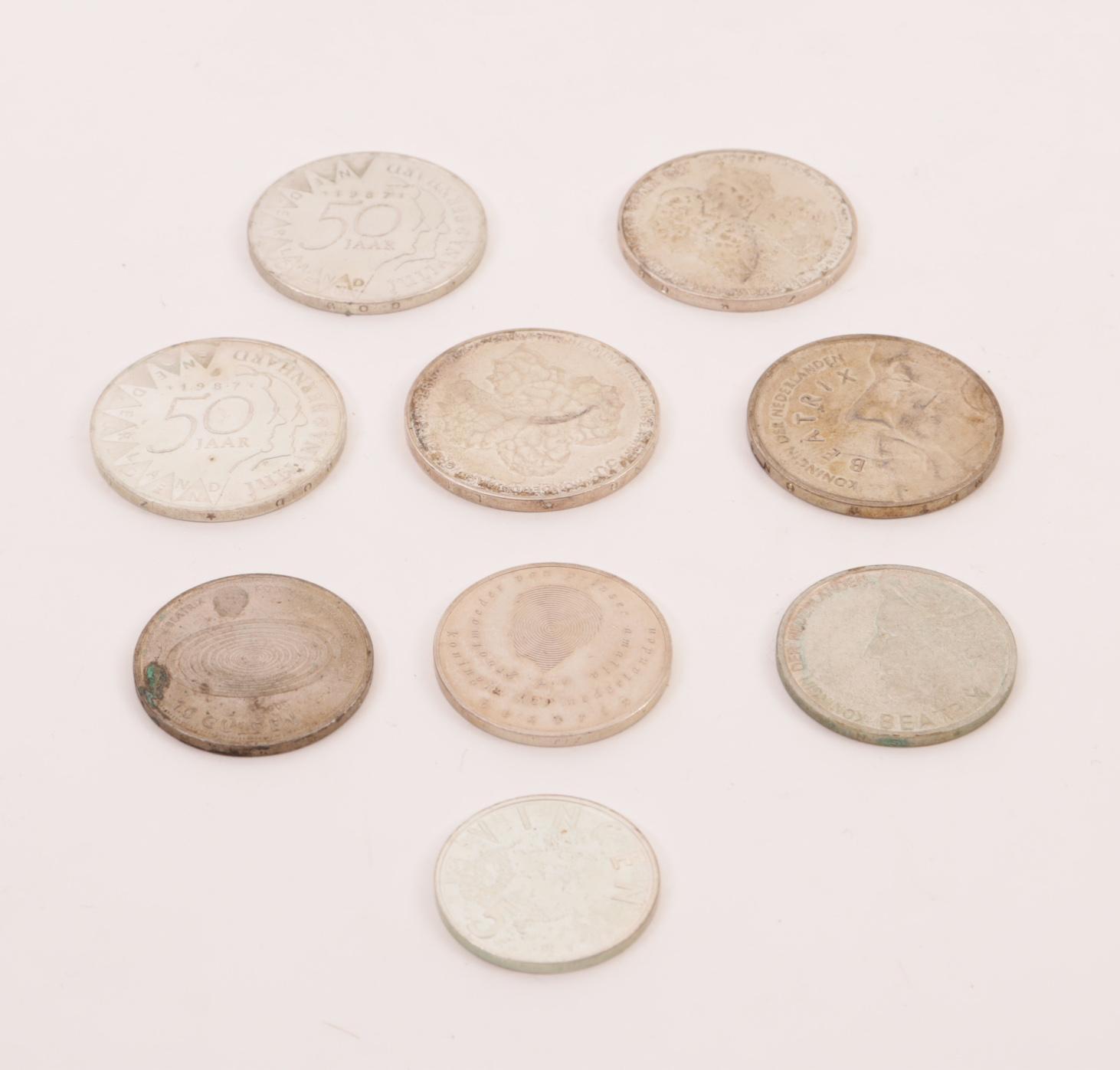 Koopje muntstukken van 5 vijftigguldens, 3 tienguldens en 5 euro munt, Beatrix