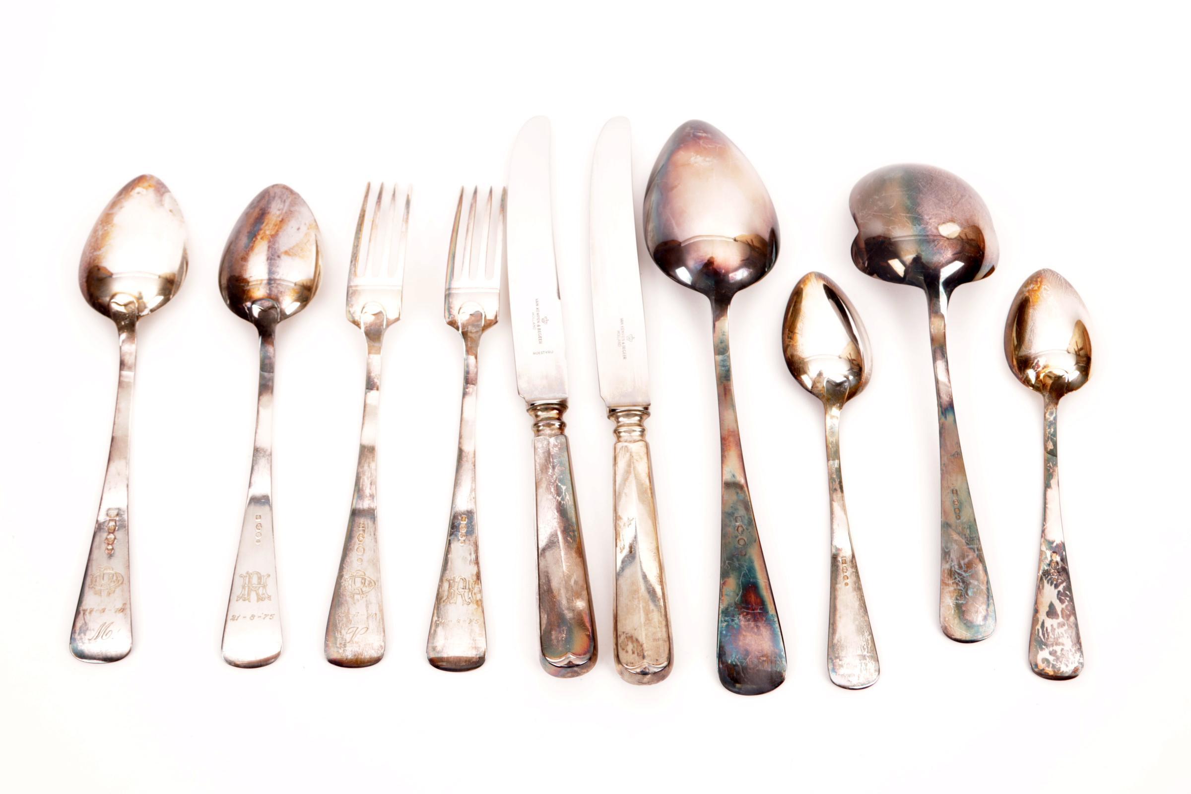 Zes 2e gehalte zilveren lepels, 2 vorken (zilvergewicht 516 gram) en 2 messen met zilveren heften