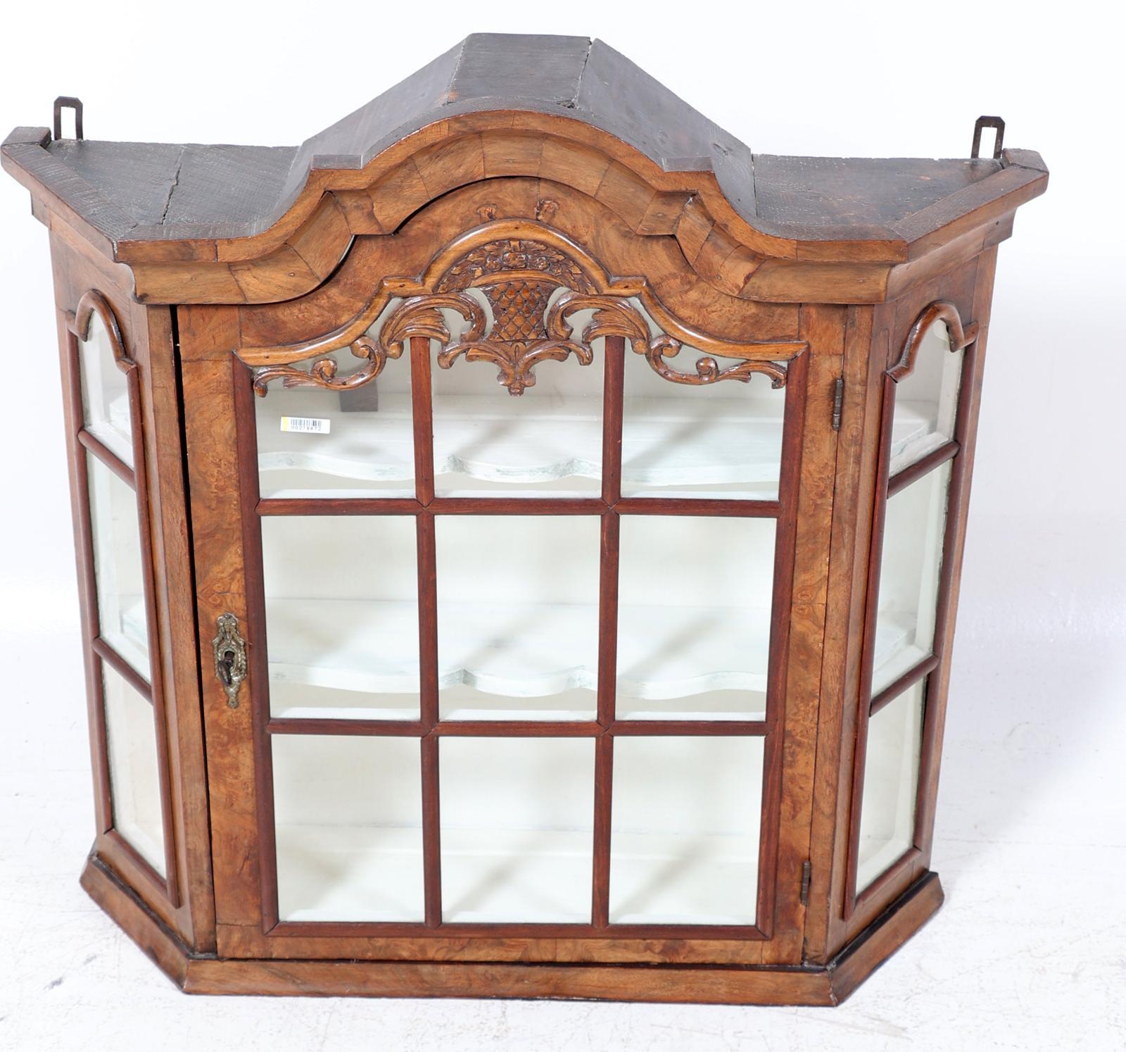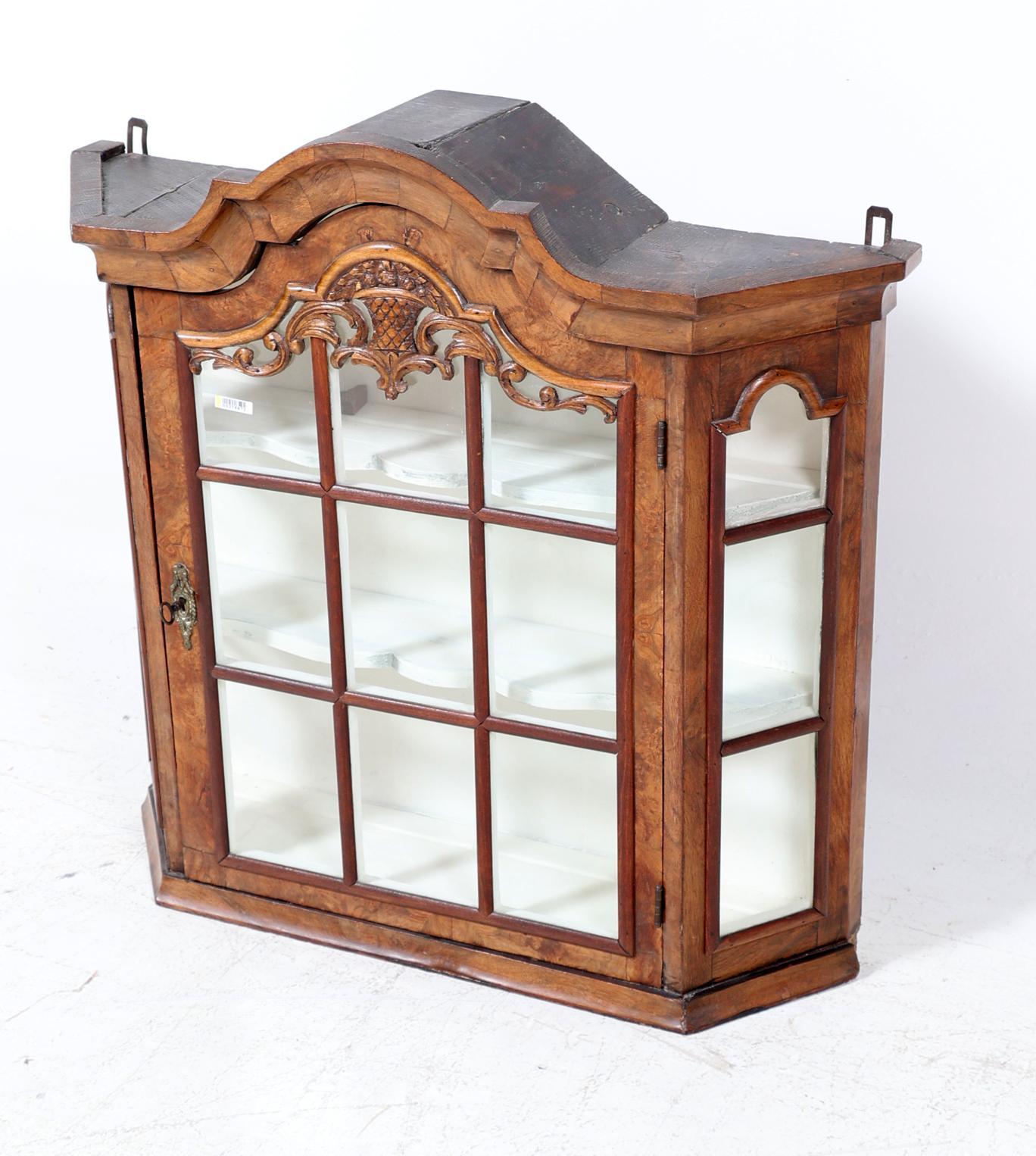 Antiek wortelnotenhouten wand/hangvitrineksst, h.70 x b.72 x d.19 cm.