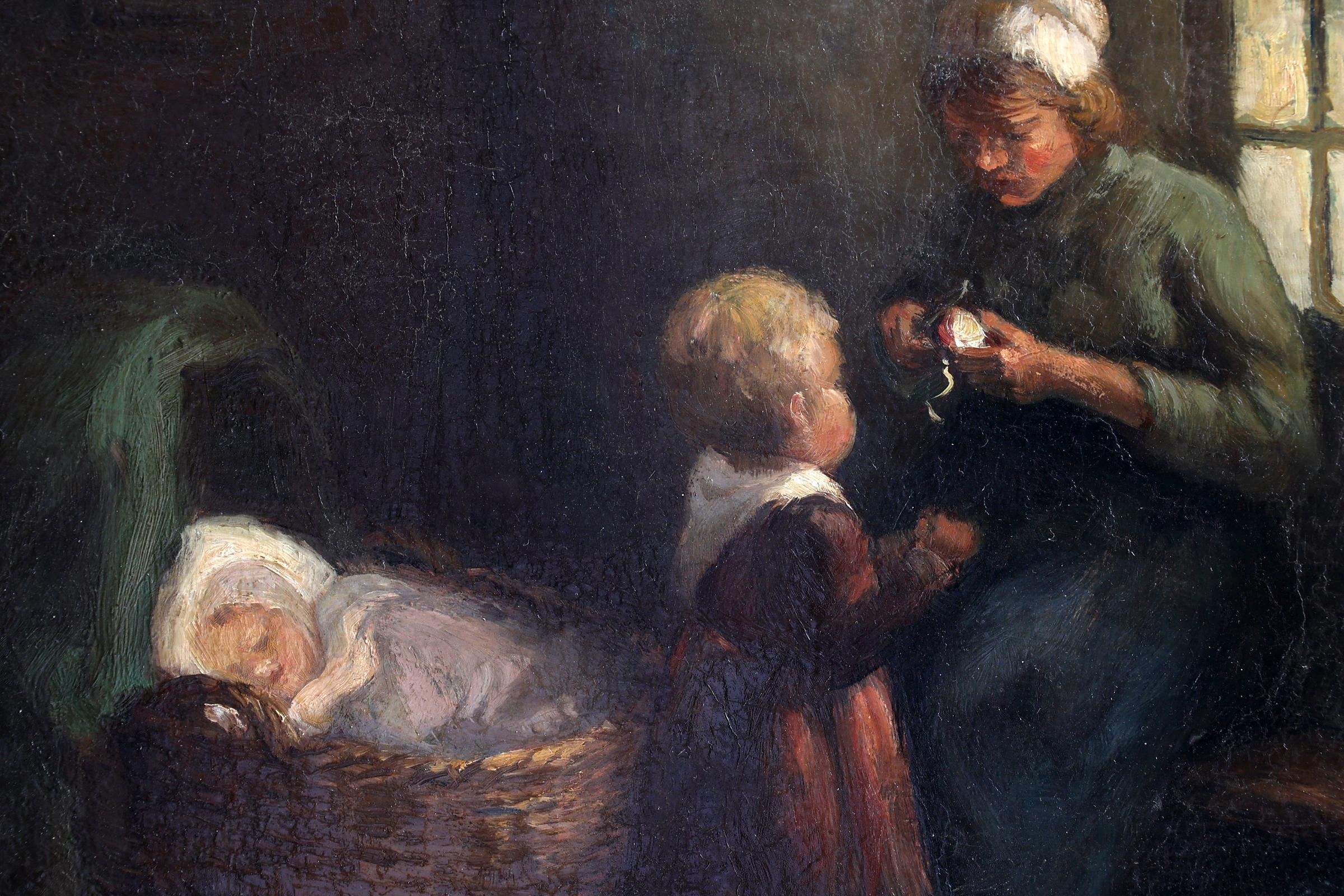 Monogram P.J.F., Larens interieur met moeder en kinderen, olieverf op paneel, 39 x 29 cm.
