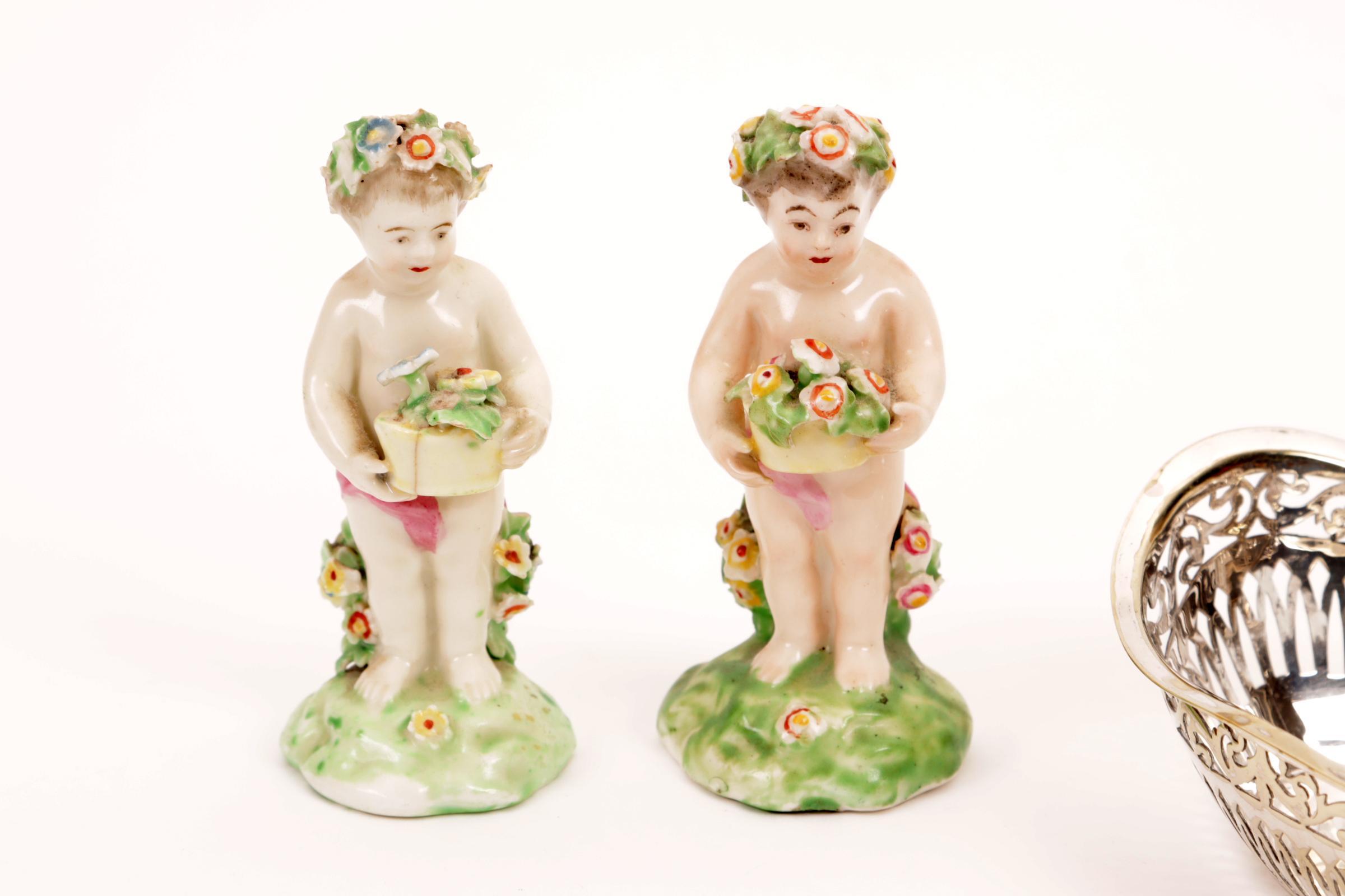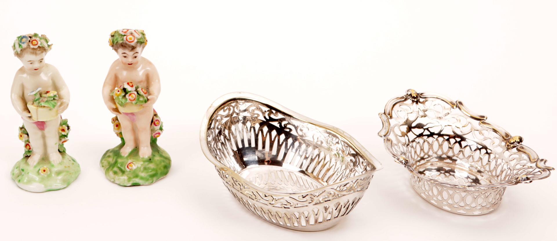 2 Porseleinen beeldjes van bloemenmeisjes en 2 pleet schaaltjes