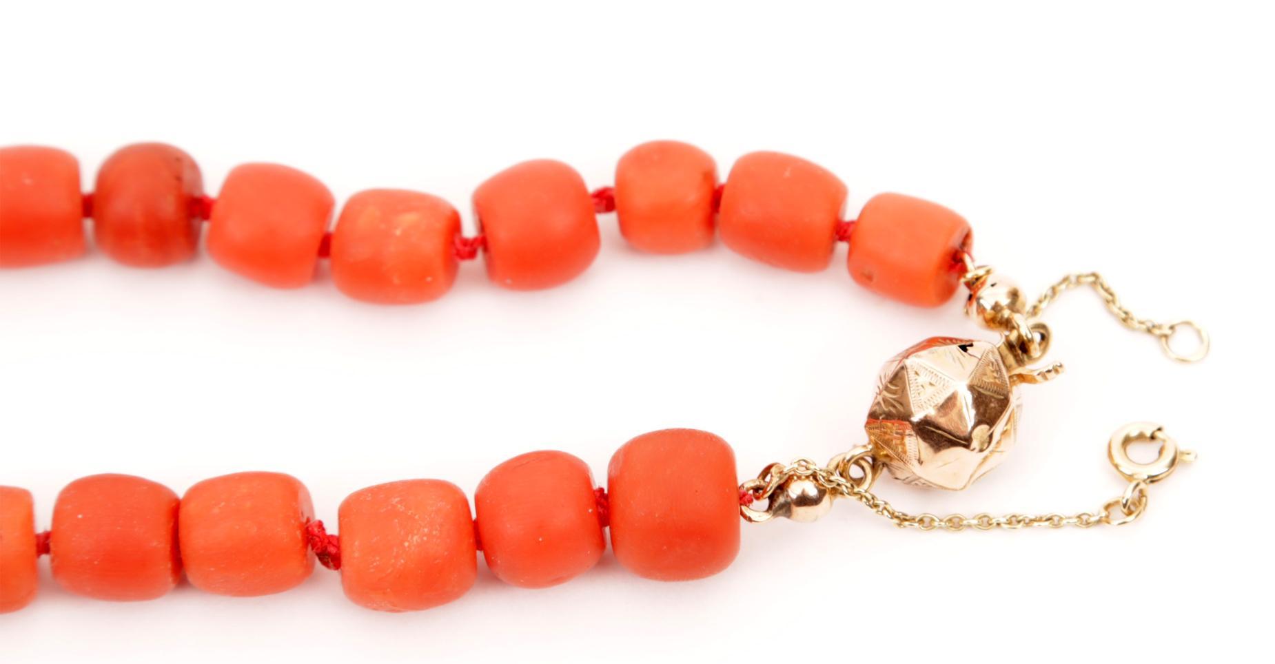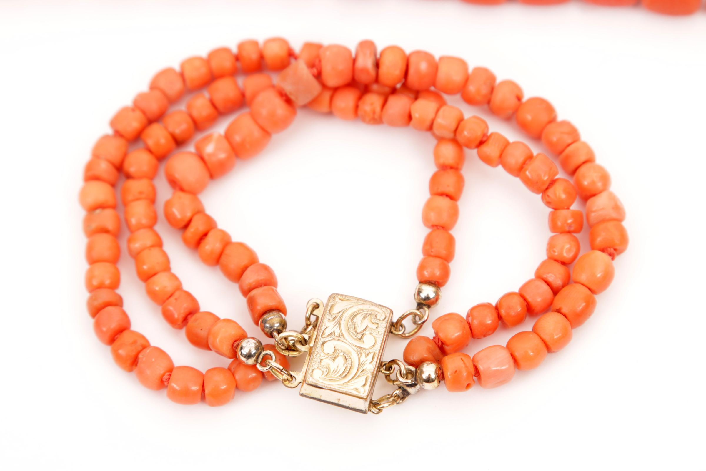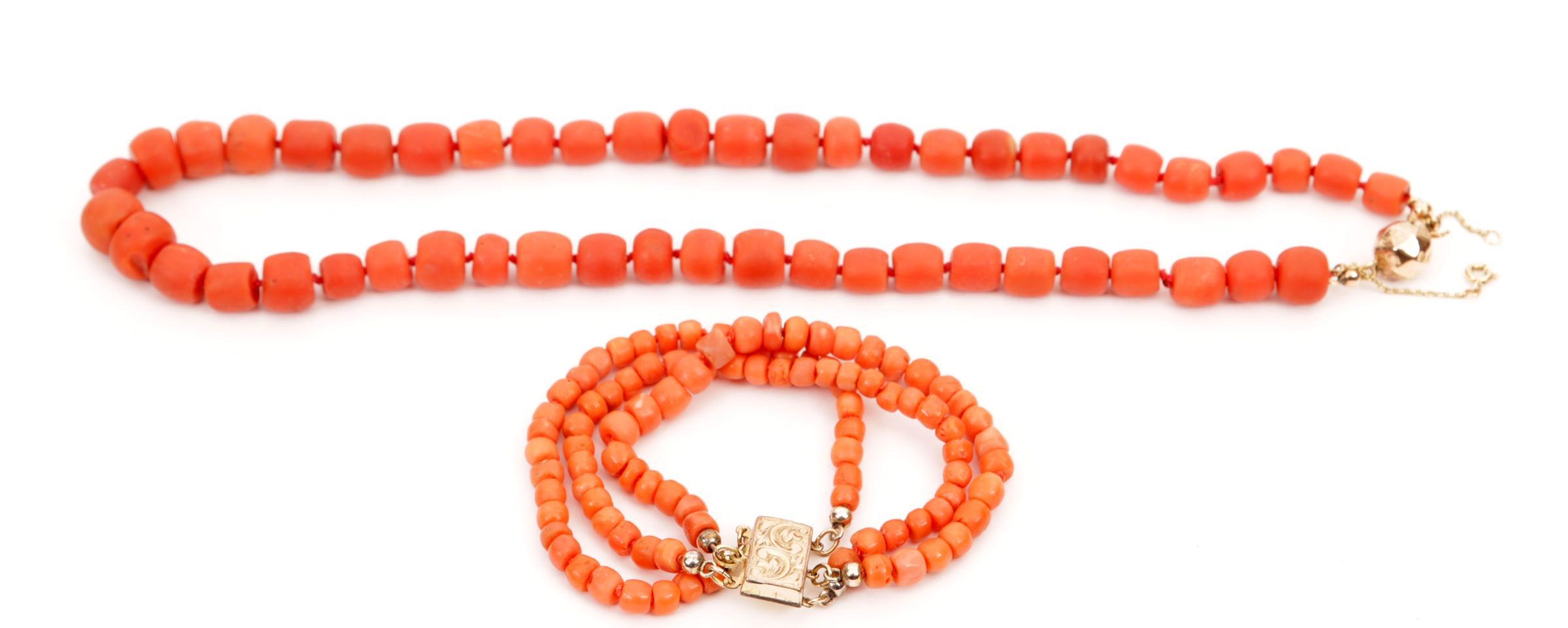Bloedkoralen collier met gouden slot en een 3-strengs armband met goudkleurig slot