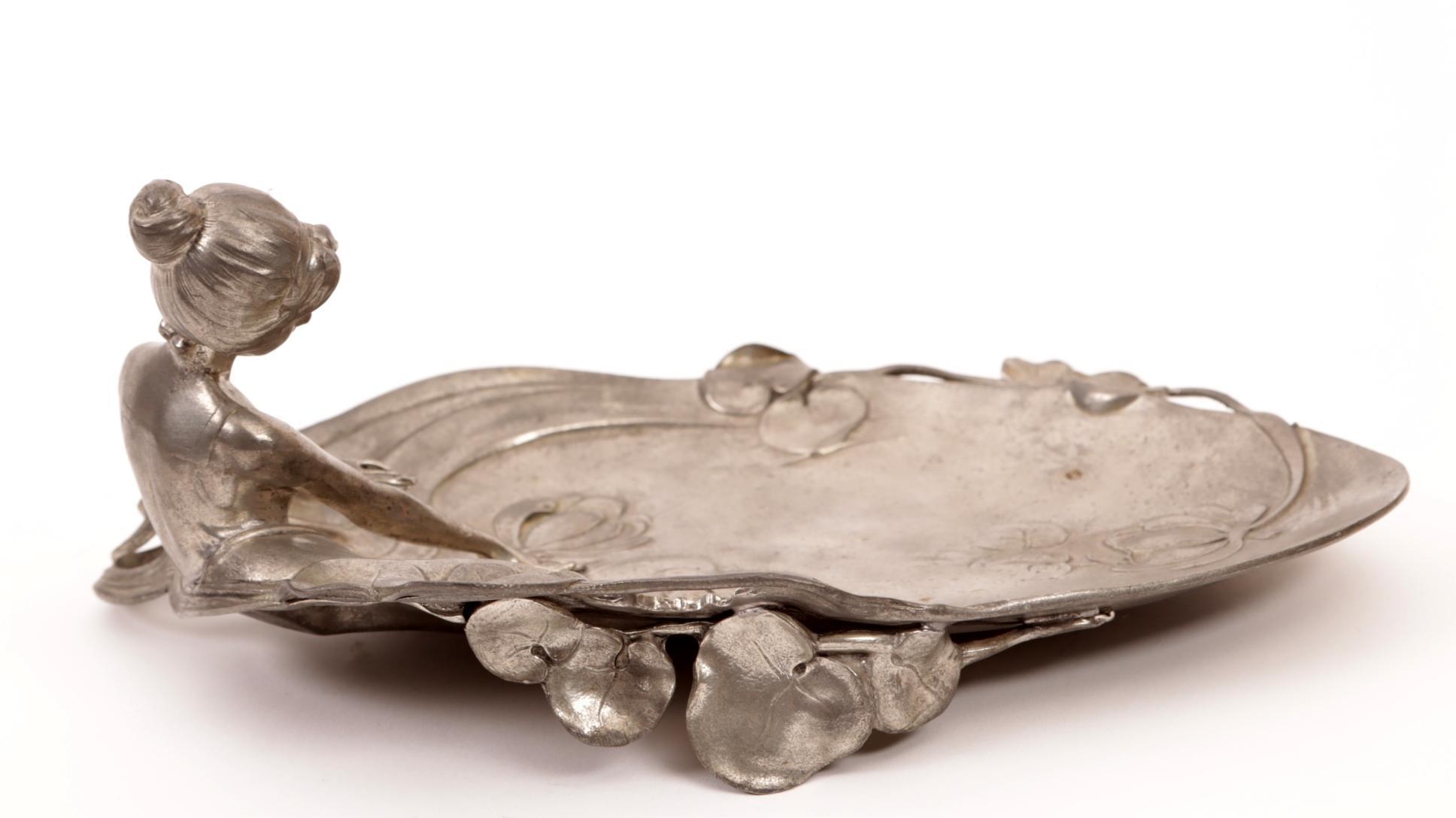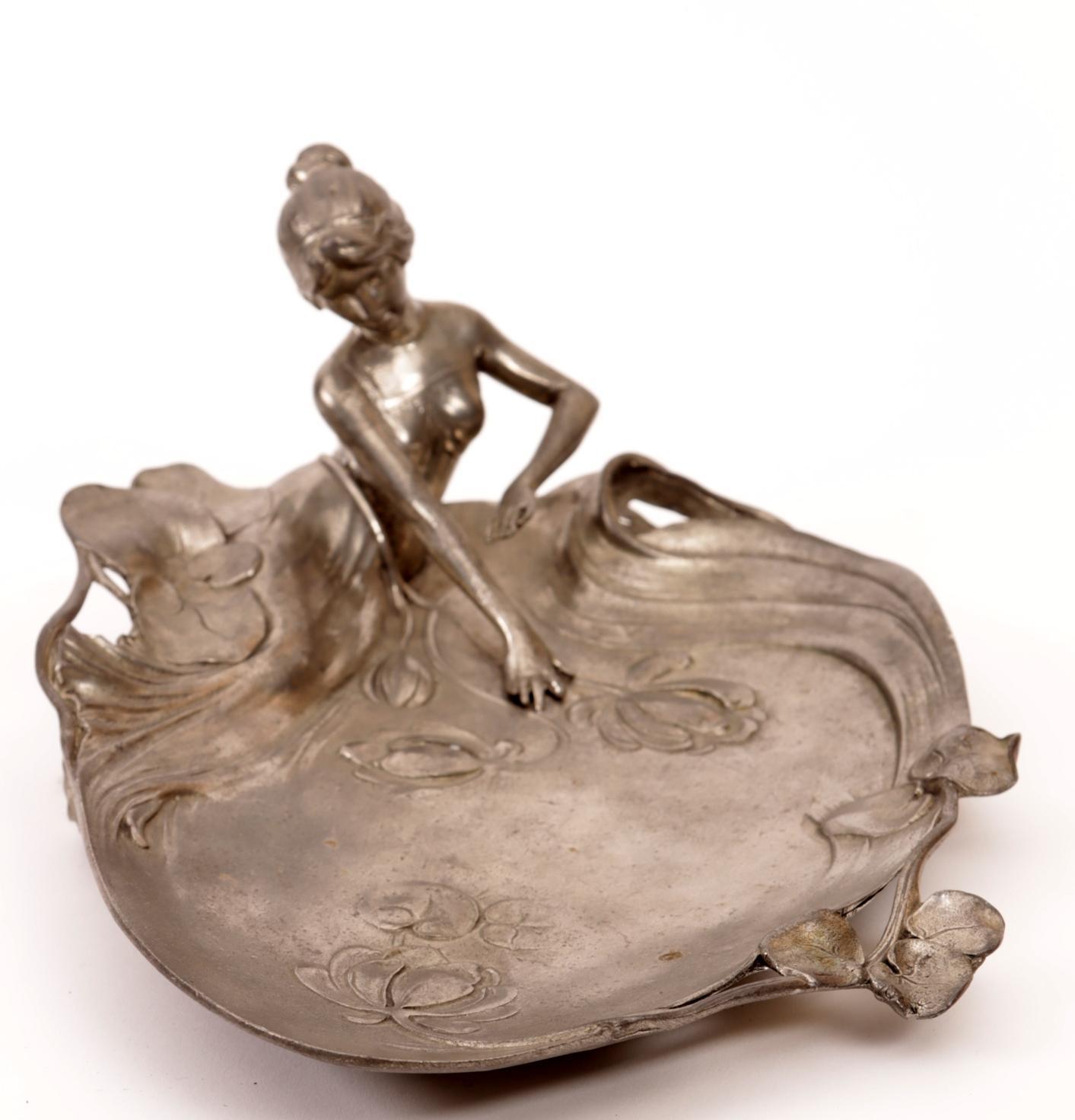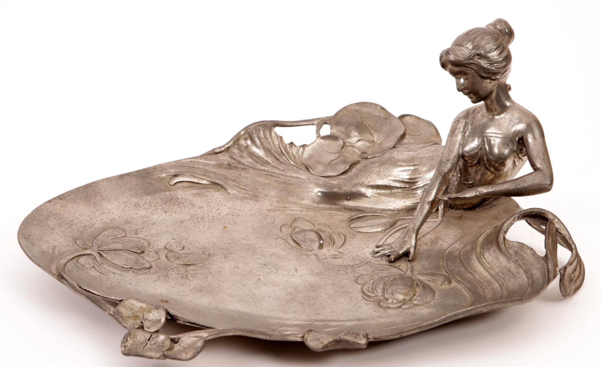 Tinnen Jugendstil-stijl schaal met liggende vrouw, h.11 x b.26 x d. 19 cm.