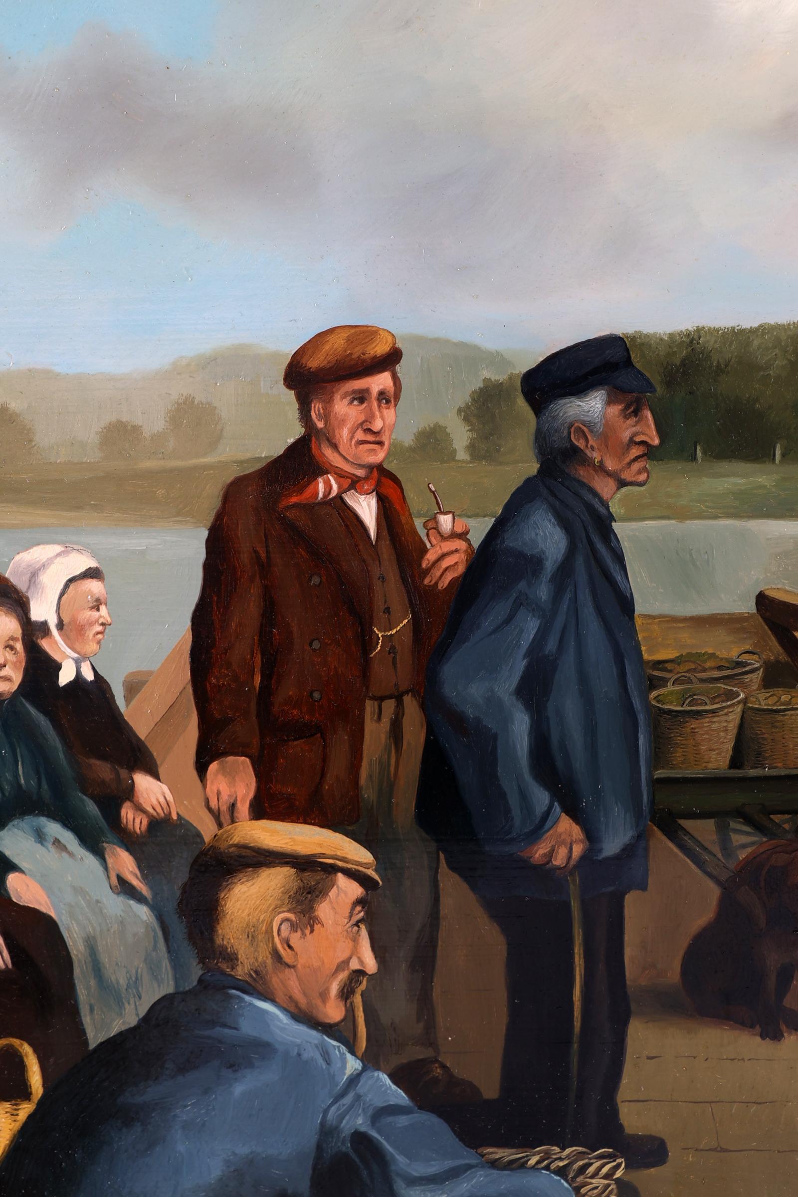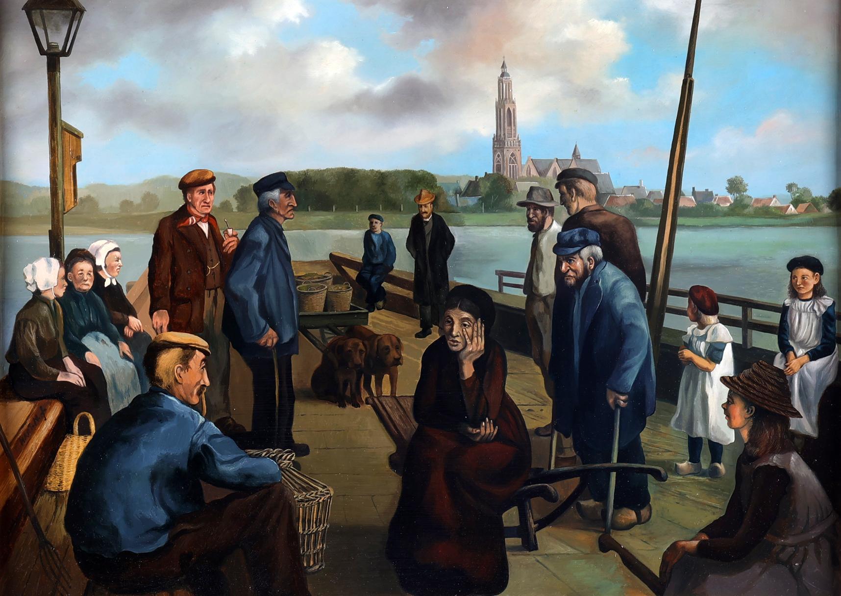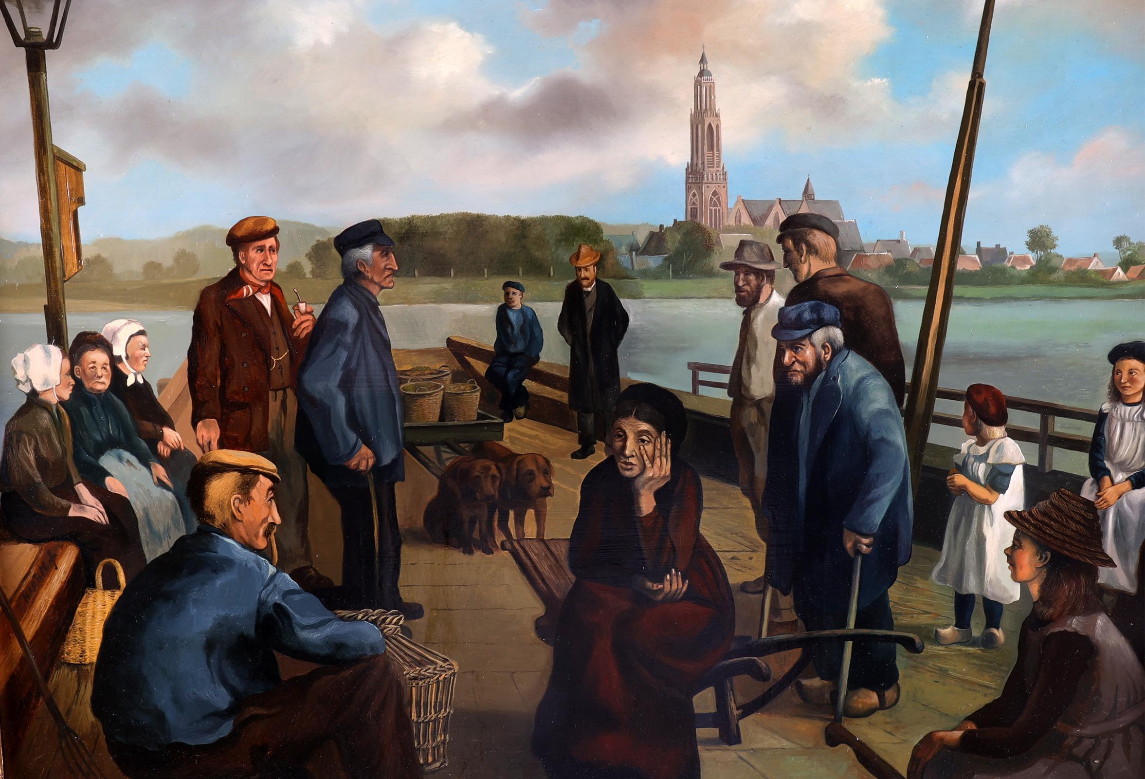 E. Hart, Personen op de pont, olieverf op paneel, 55 x 40 cm.