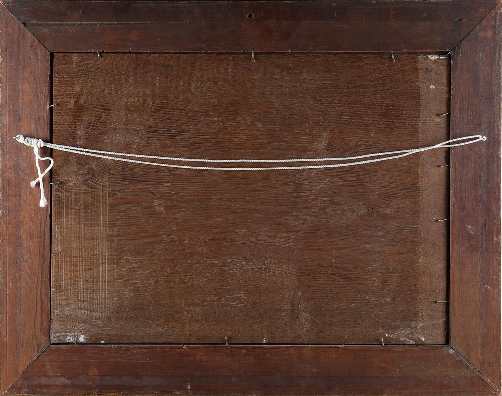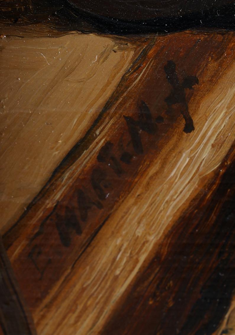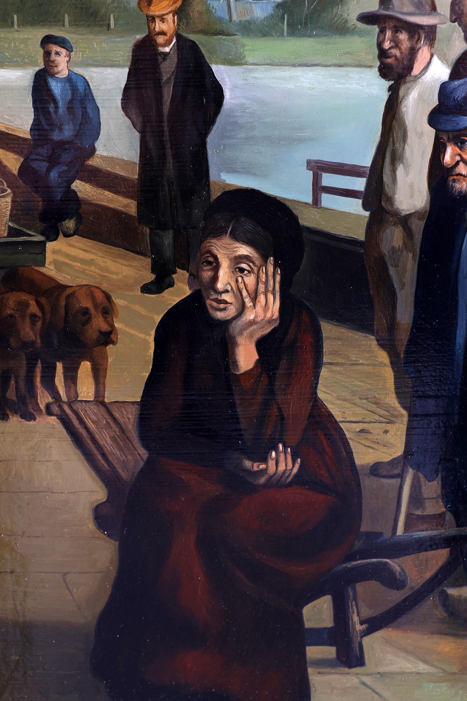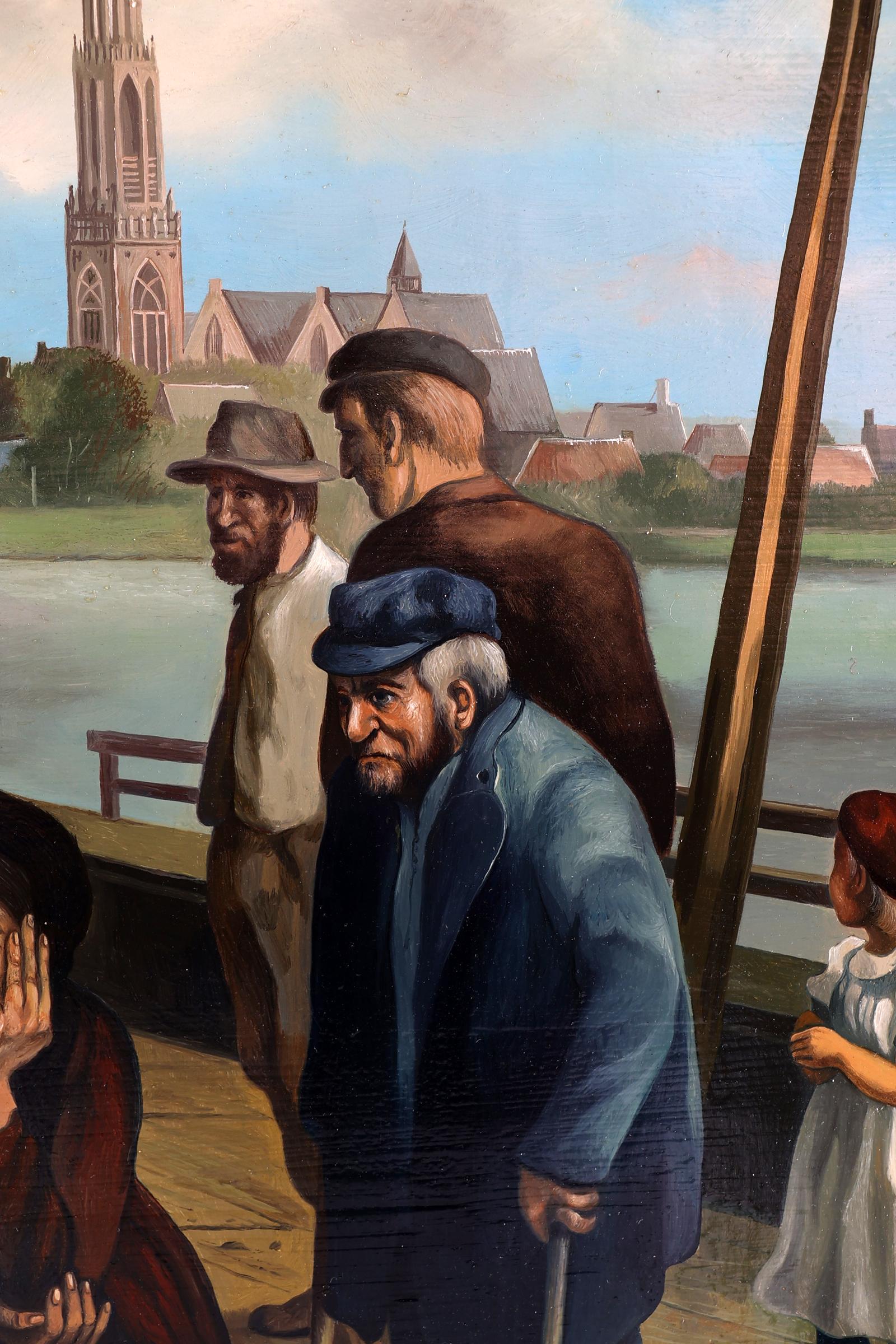 E. Hart, Personen op de pont, olieverf op paneel, 55 x 40 cm.
