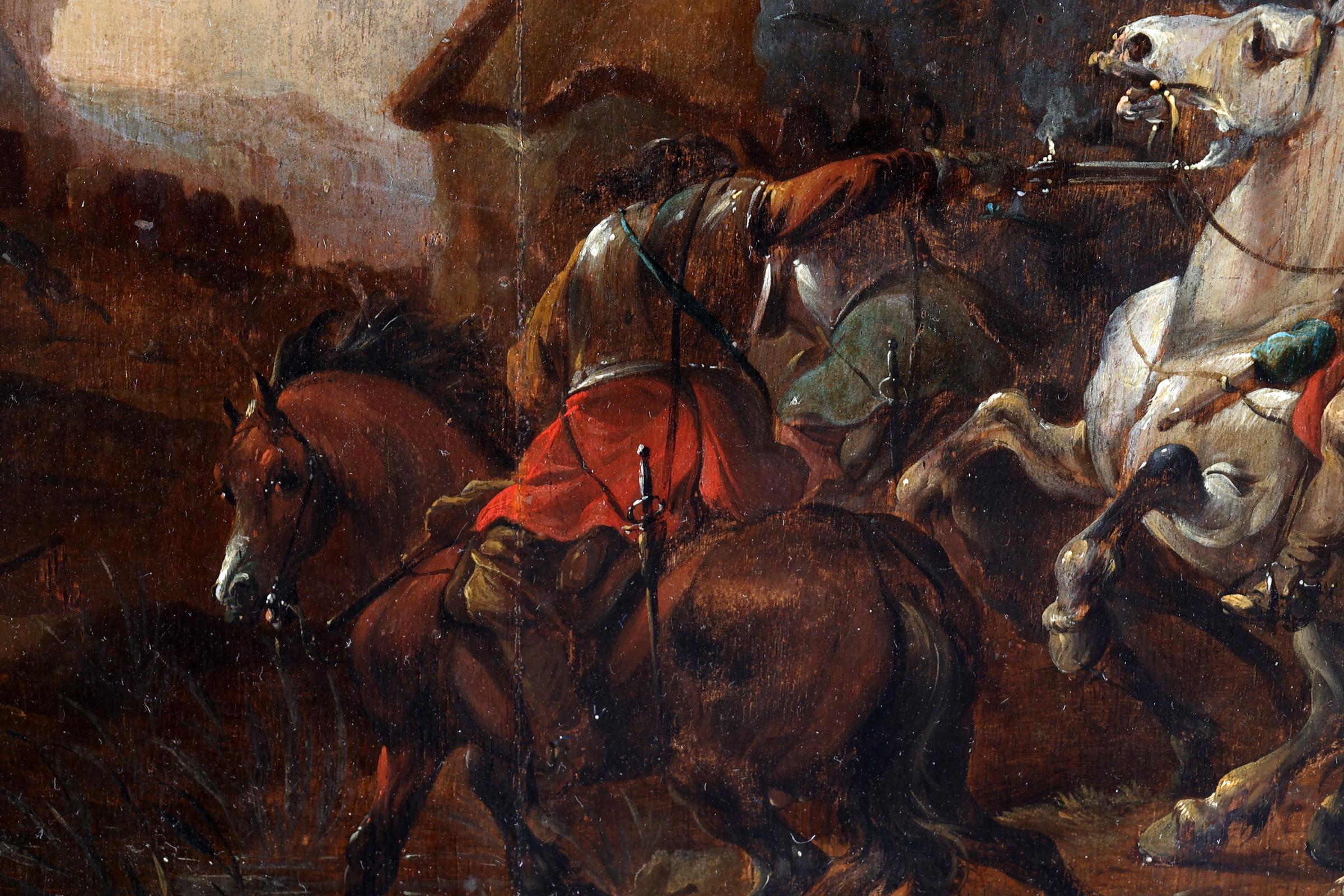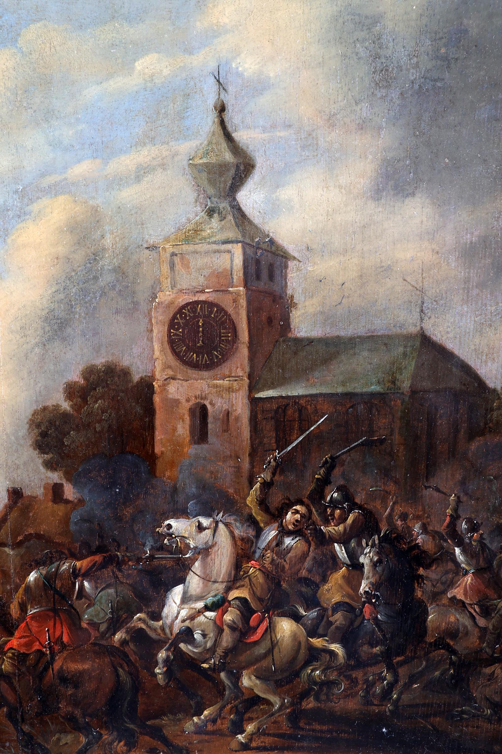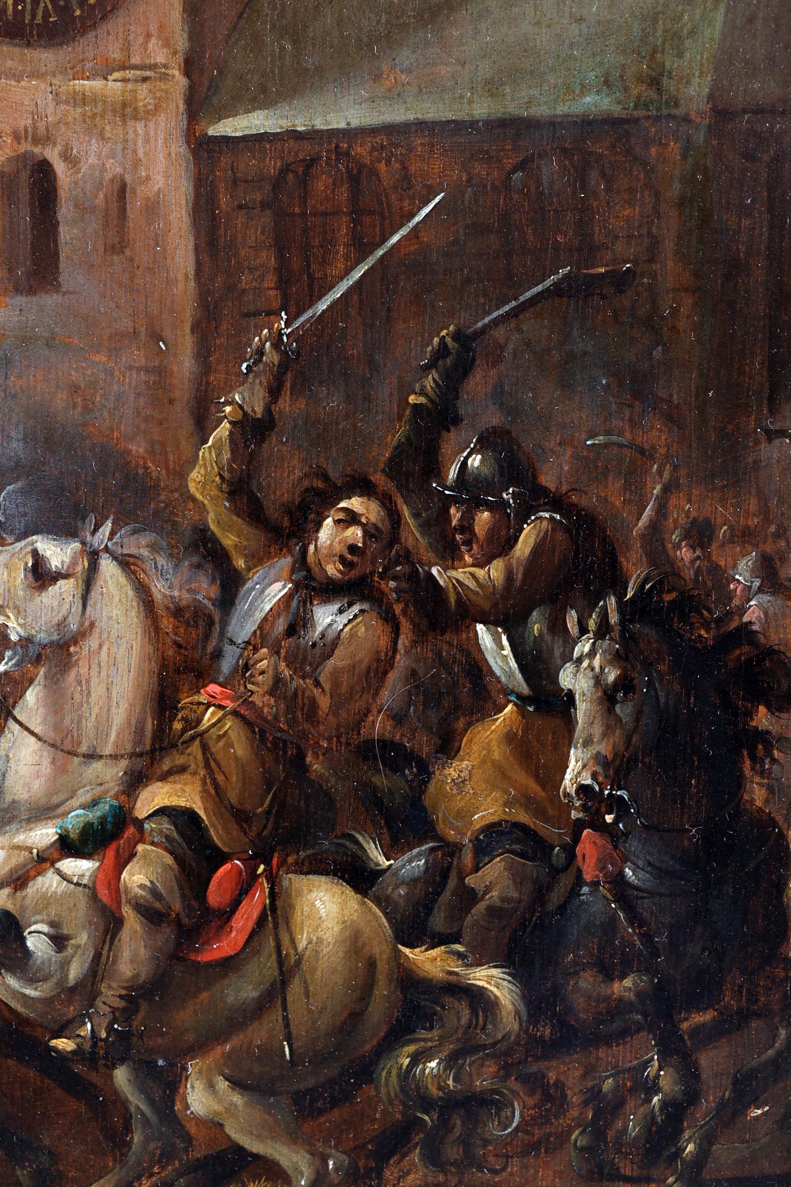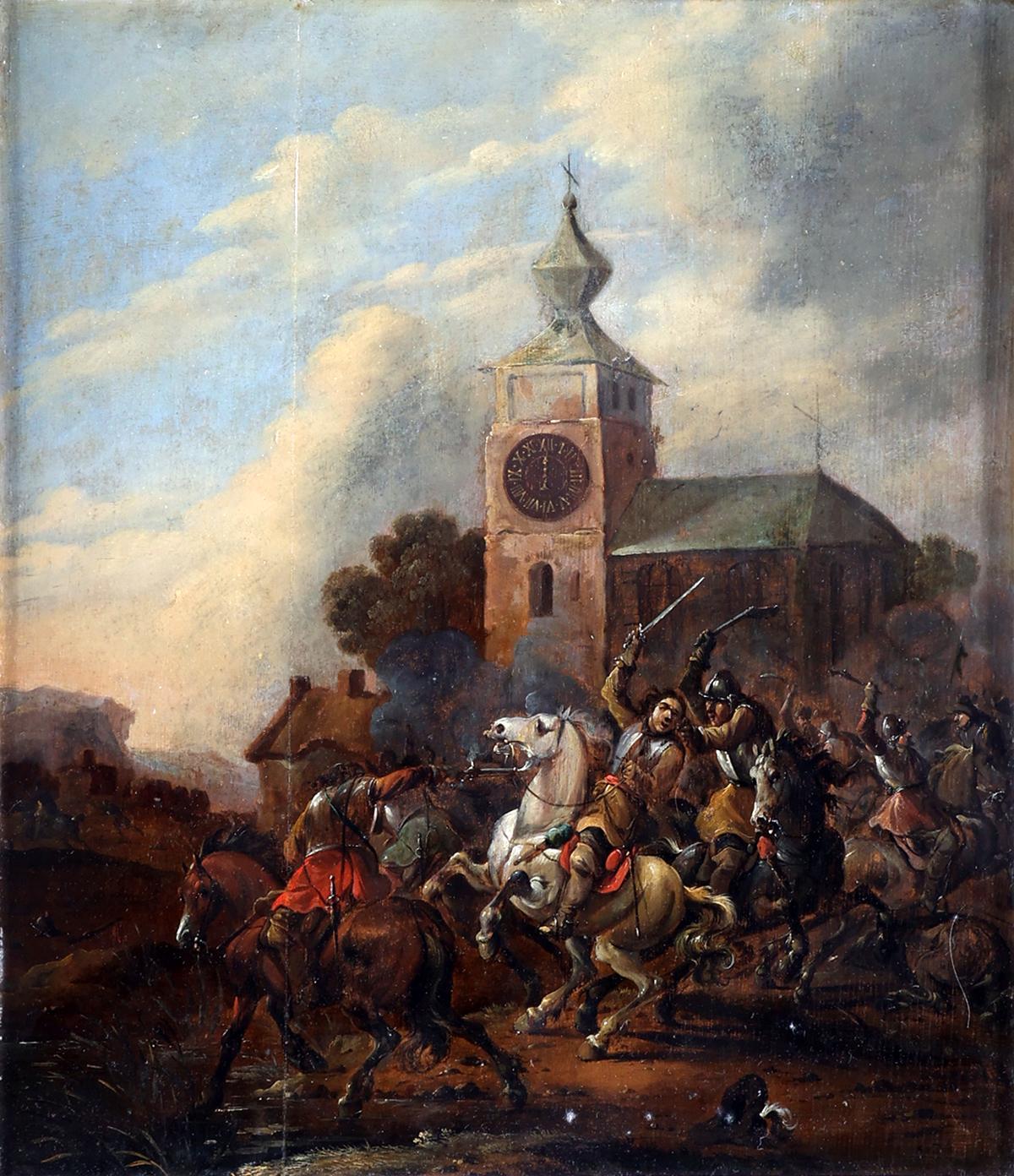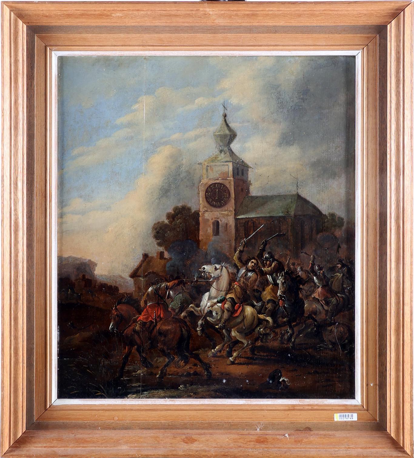 Omgeving Simon Johannes van Dauw, Strijdende personen voor kerk, olieverf op paneel, 51 x 44 cm., provenance particuliere collectie