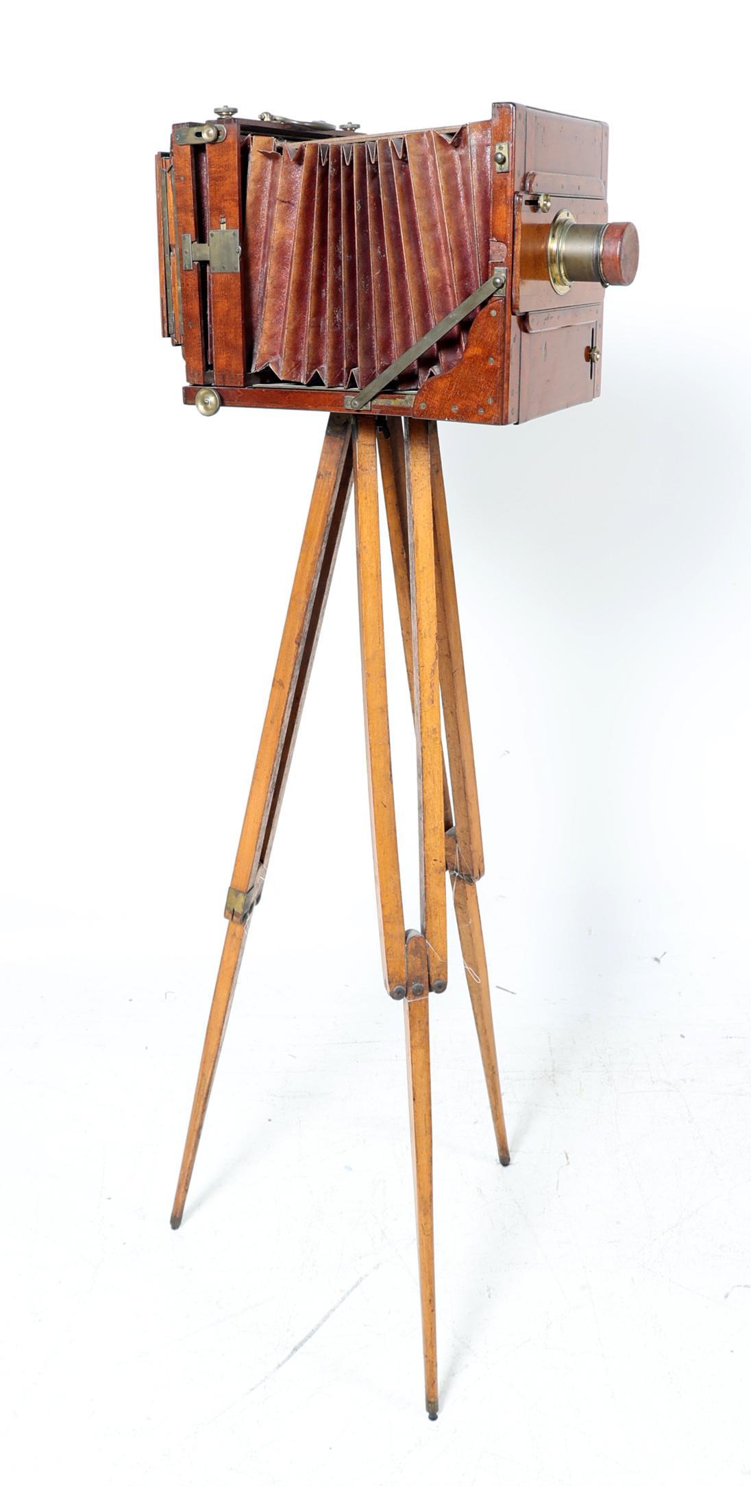 J.H. (John Henry) Dallmeyer, London, Antieke fotocamera op statief en een klassiek dry-plate Engels tailboard ontwerp, Dallmeyer begon zijn zaak rond 1860. Hij werdt een bekende opticien en camera maker. Dallmeyer maakte mooie 'wet plate' camera's in de tweede helft van de 19e eeuw, maar het maken van zijn 'dry plate' camera's begon pas rond 1886.