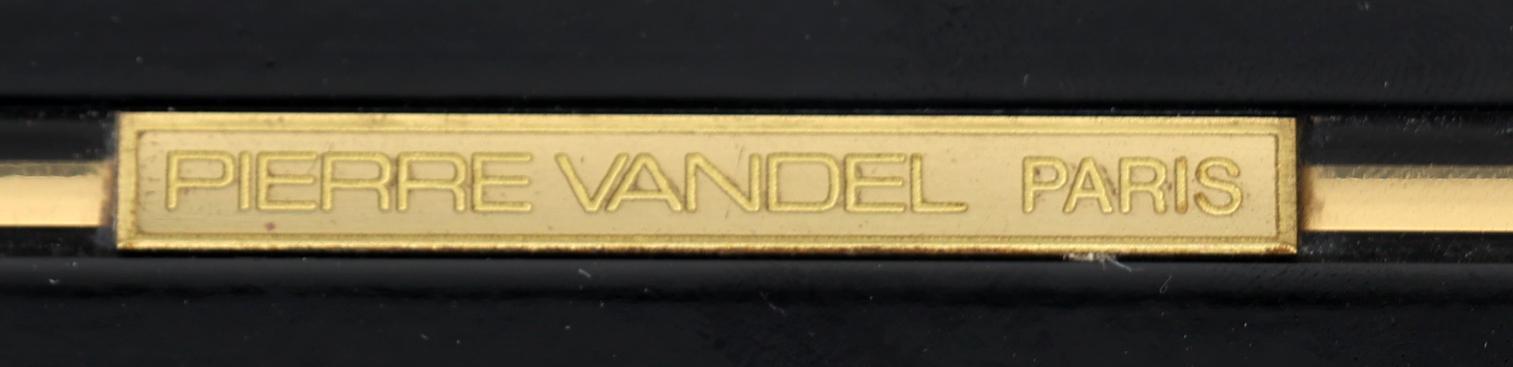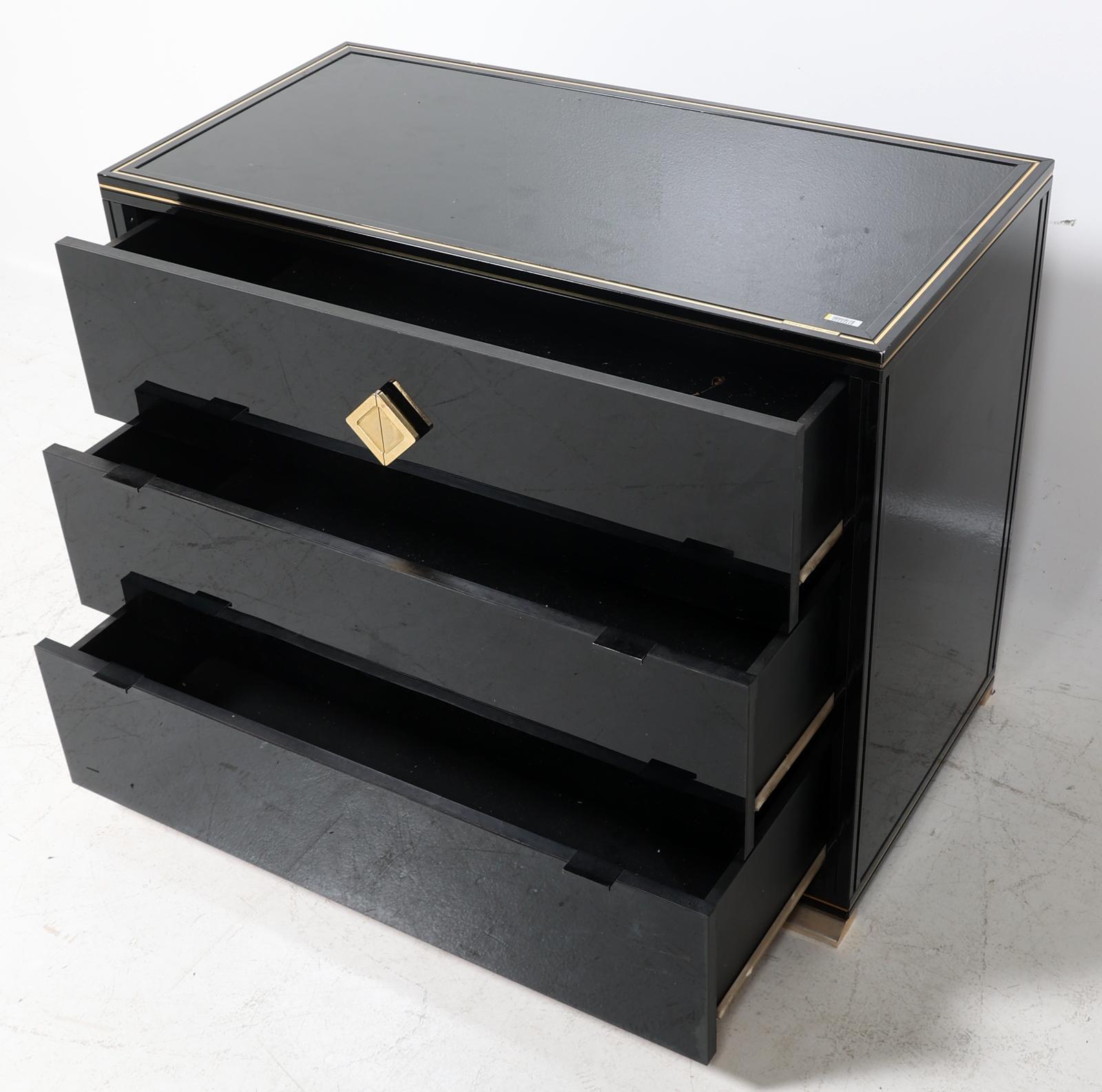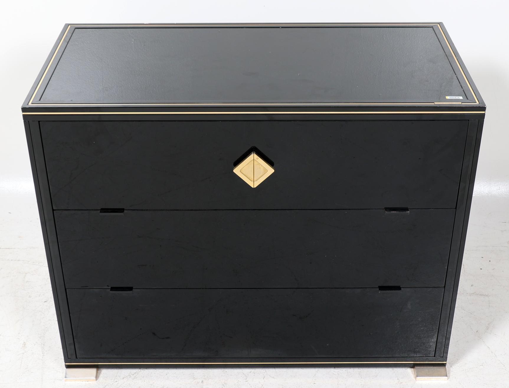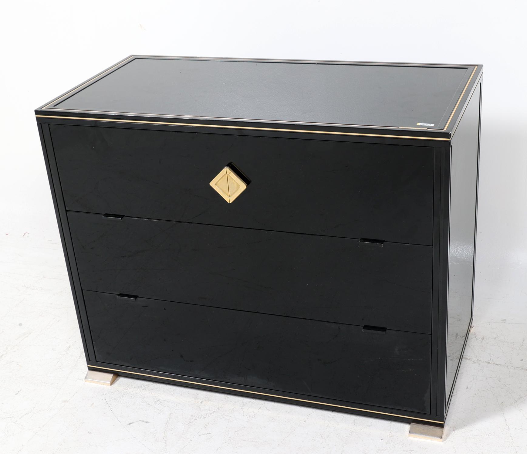 Pierre Vandel, Paris, vintage zwarte hoogglans 3-laden commode met goudkleurige accenten, h.72 x b.91 x d.45 cm.