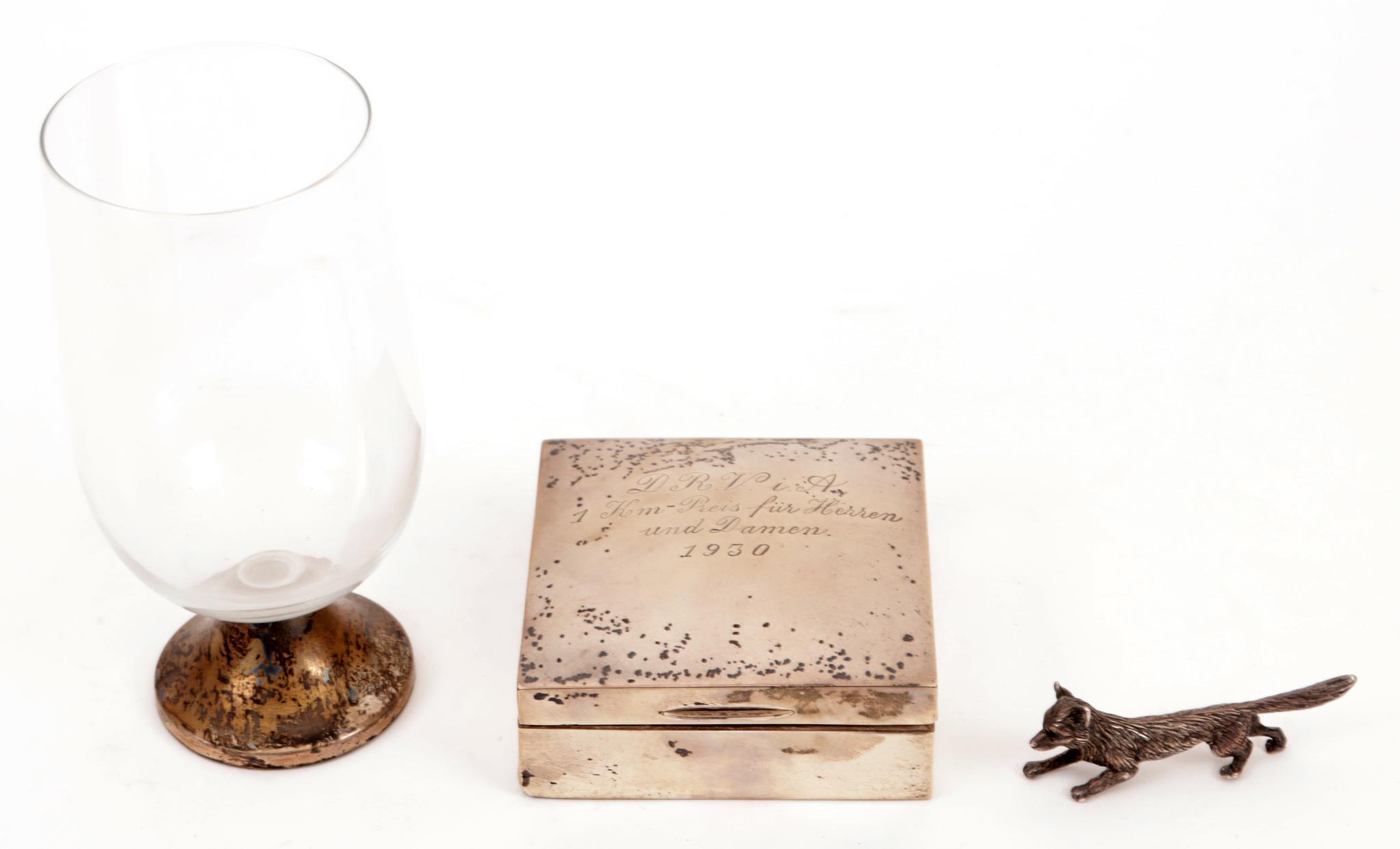Zilveren dekseldoos, glas met zilveren voetstuk en een zilveren miniatuur vos