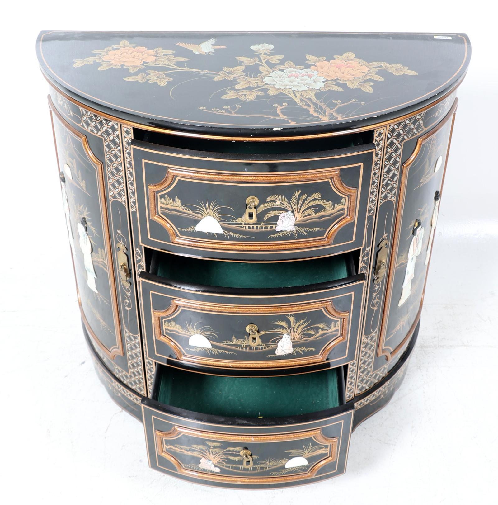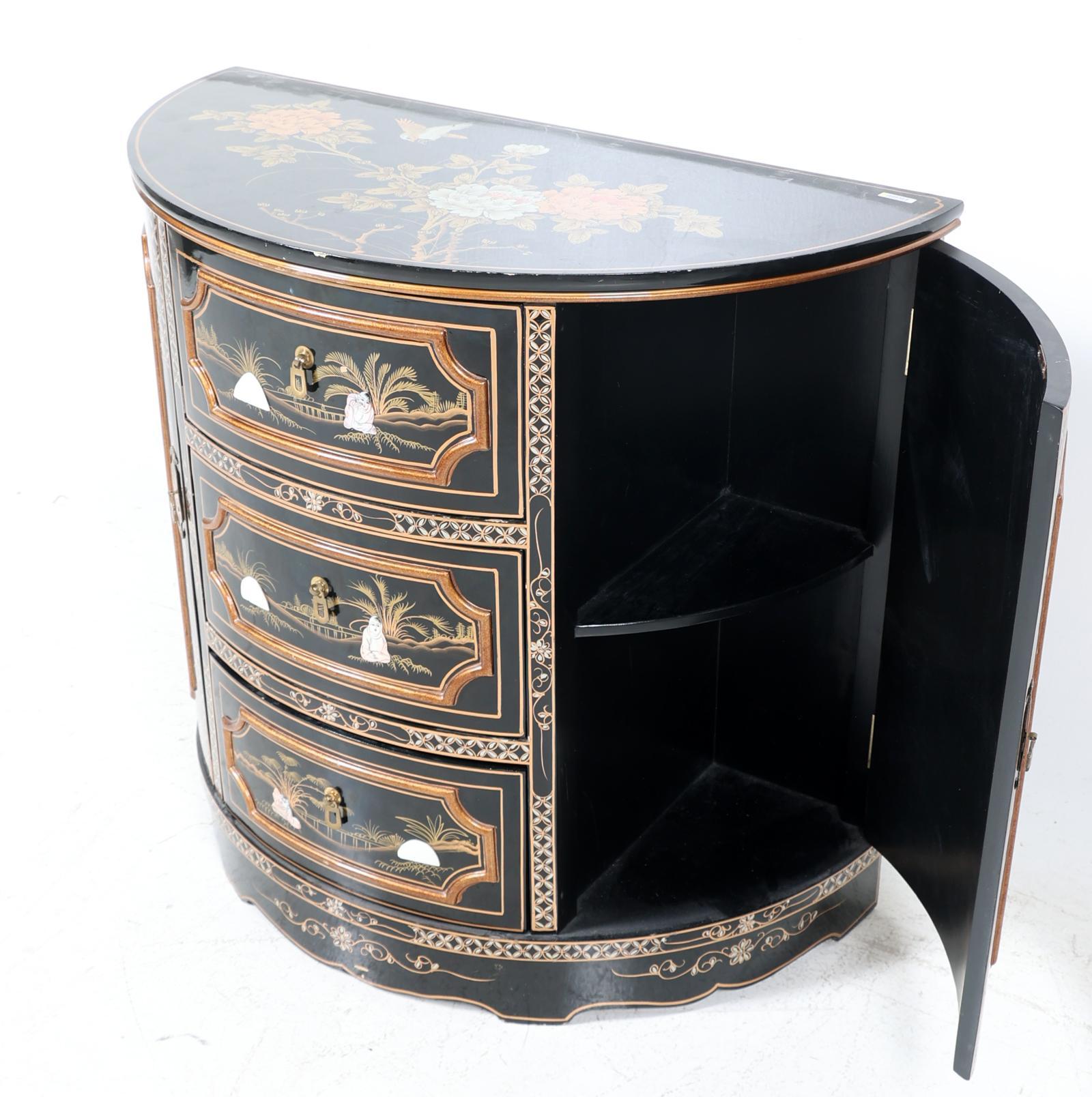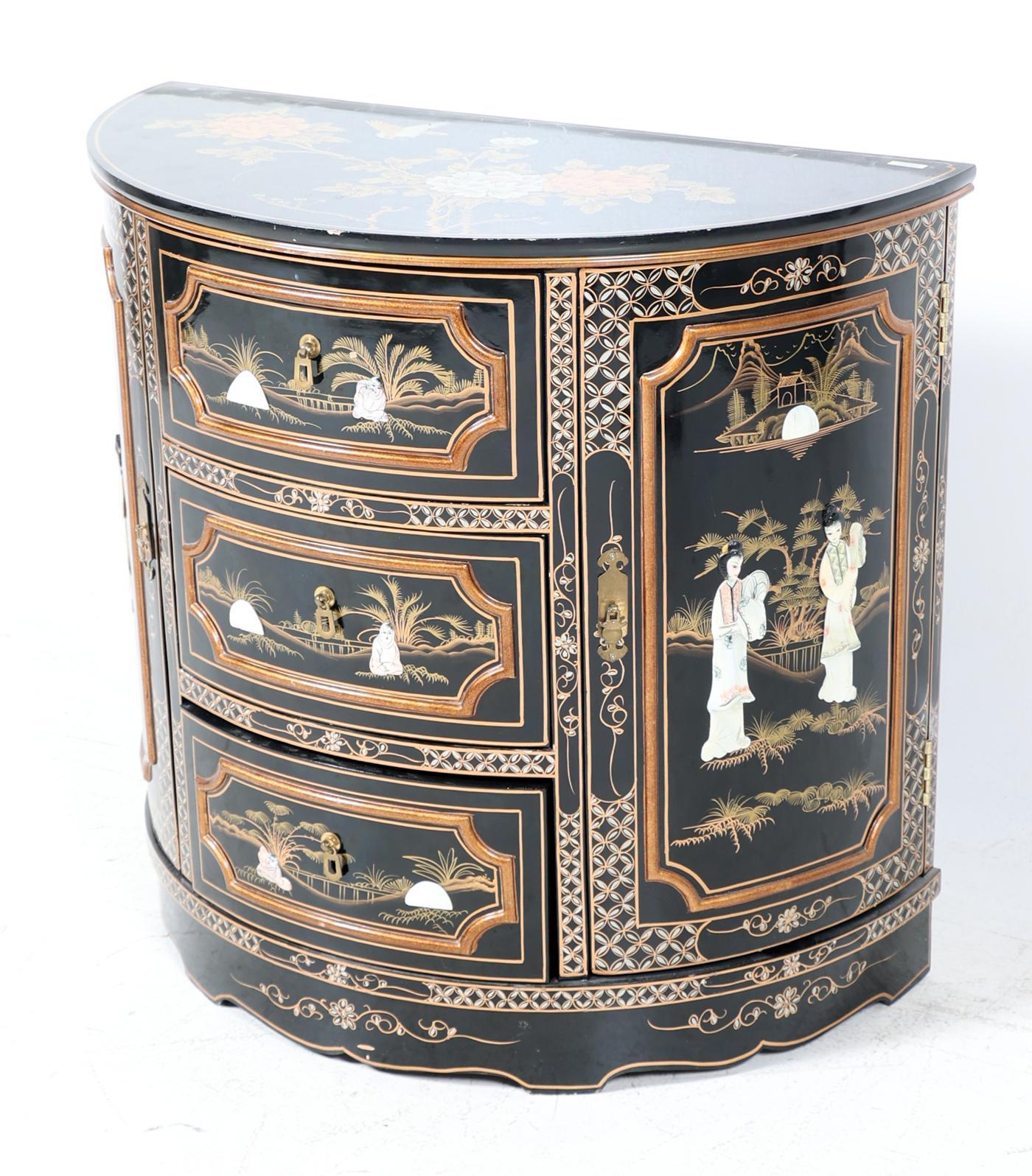 Chinees lakwerk half ronde 3-laden commode met 2 deuren aan de zijkant, met decor van personen en landschappen, h.77 x b.82 x d.40 cm.
