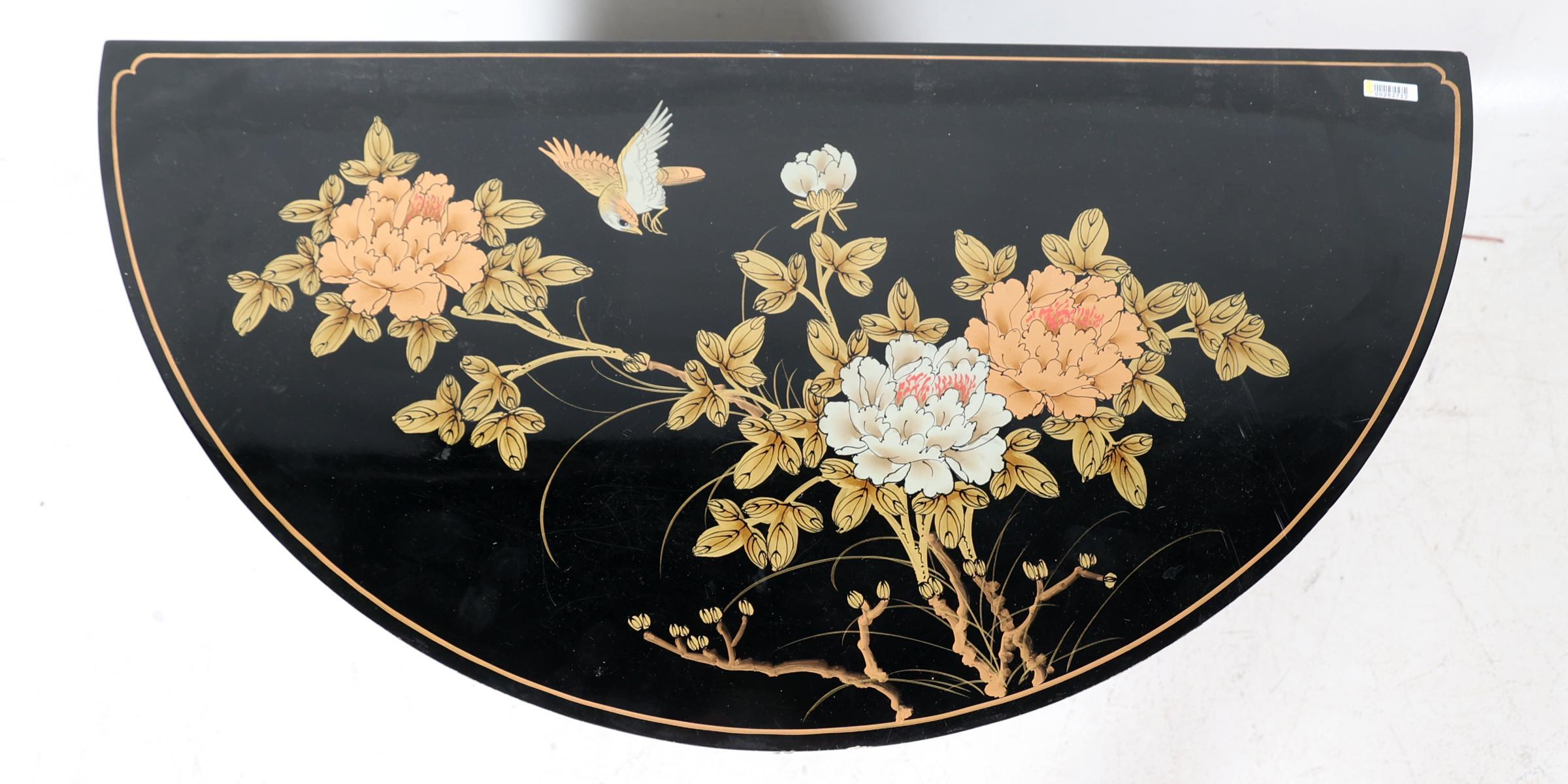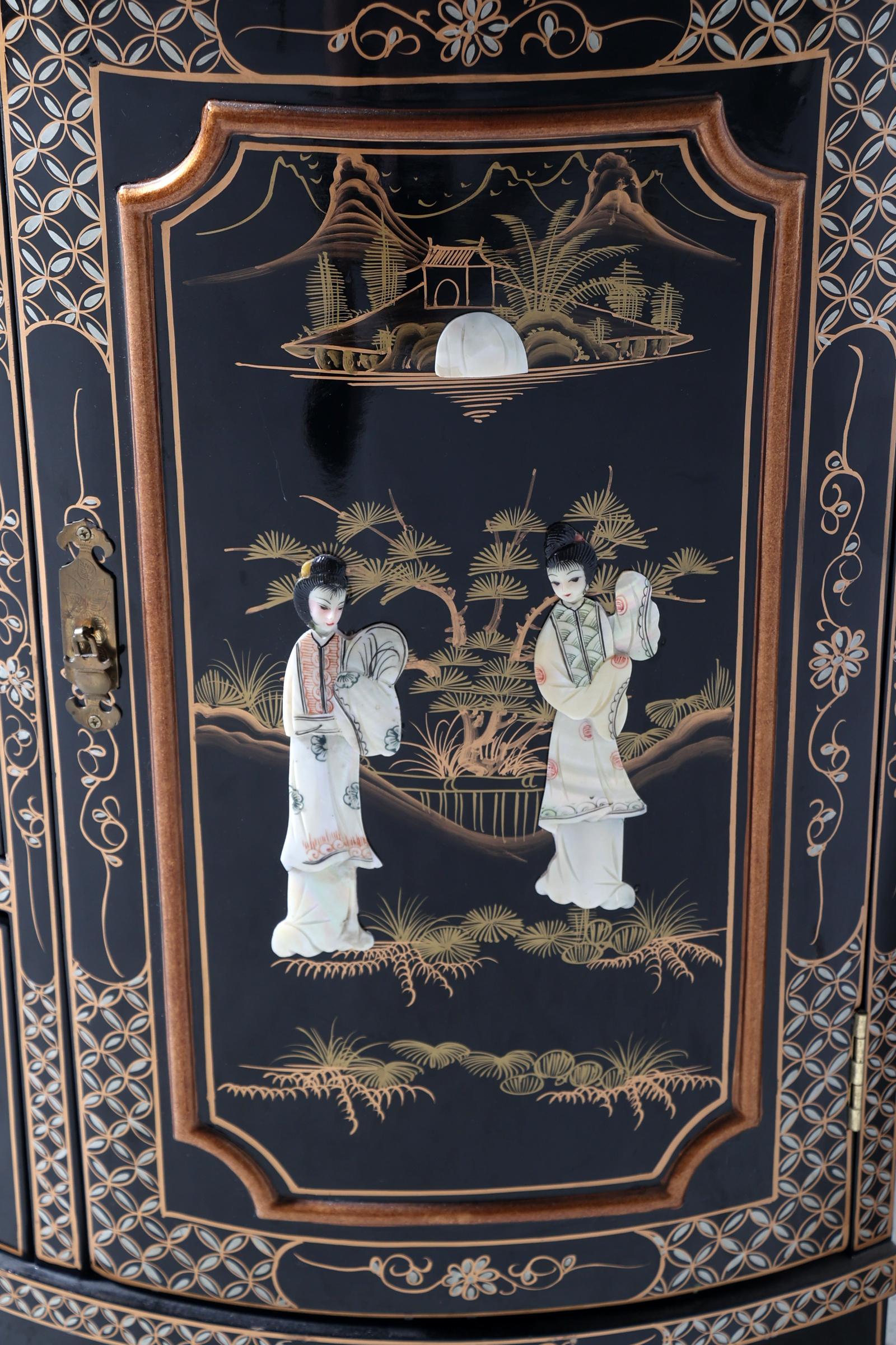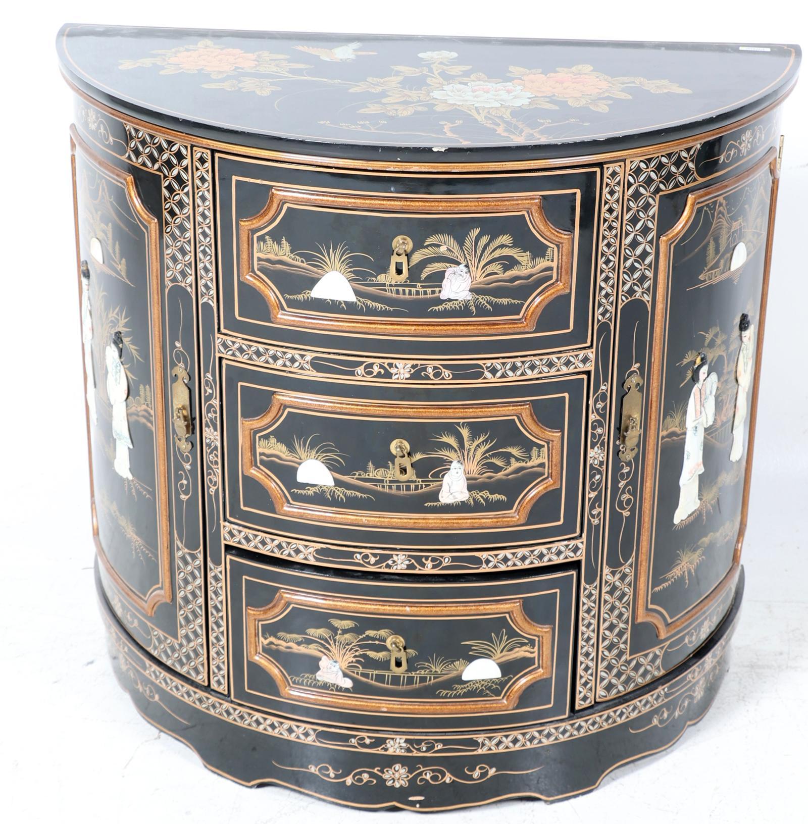 Chinees lakwerk half ronde 3-laden commode met 2 deuren aan de zijkant, met decor van personen en landschappen, h.77 x b.82 x d.40 cm.