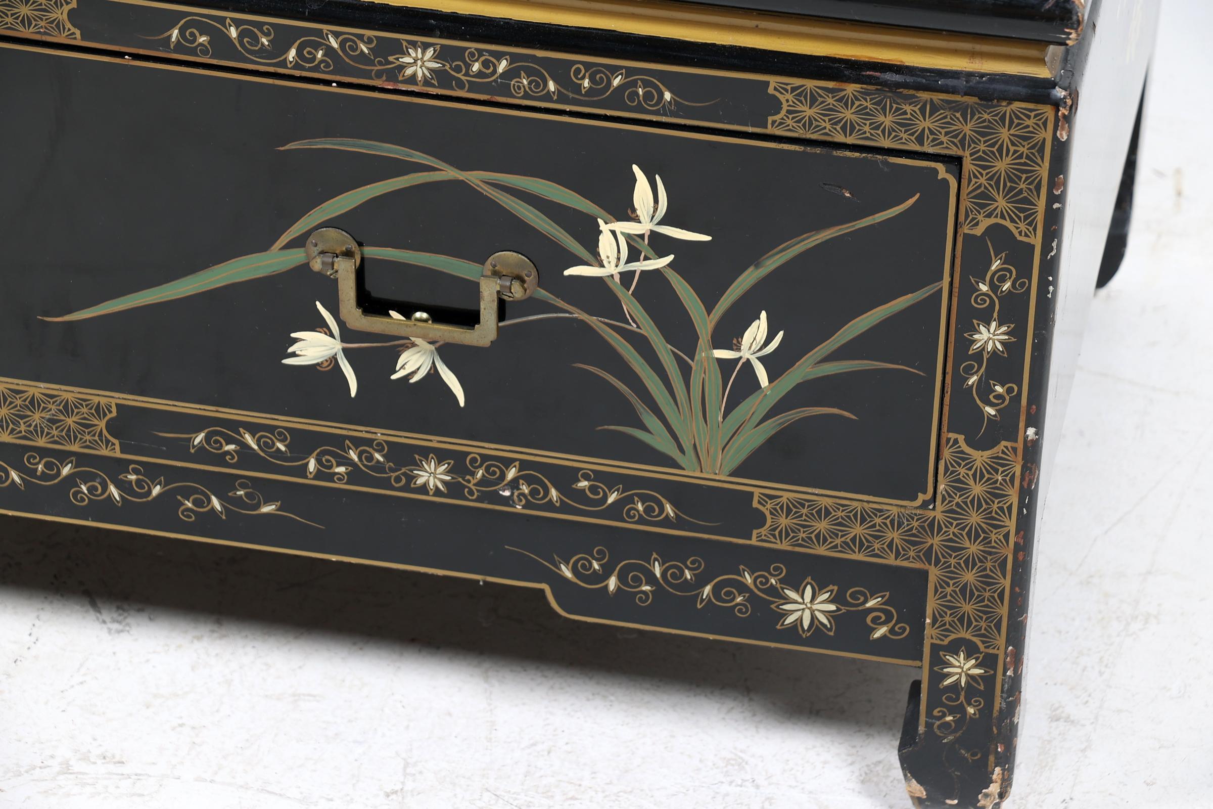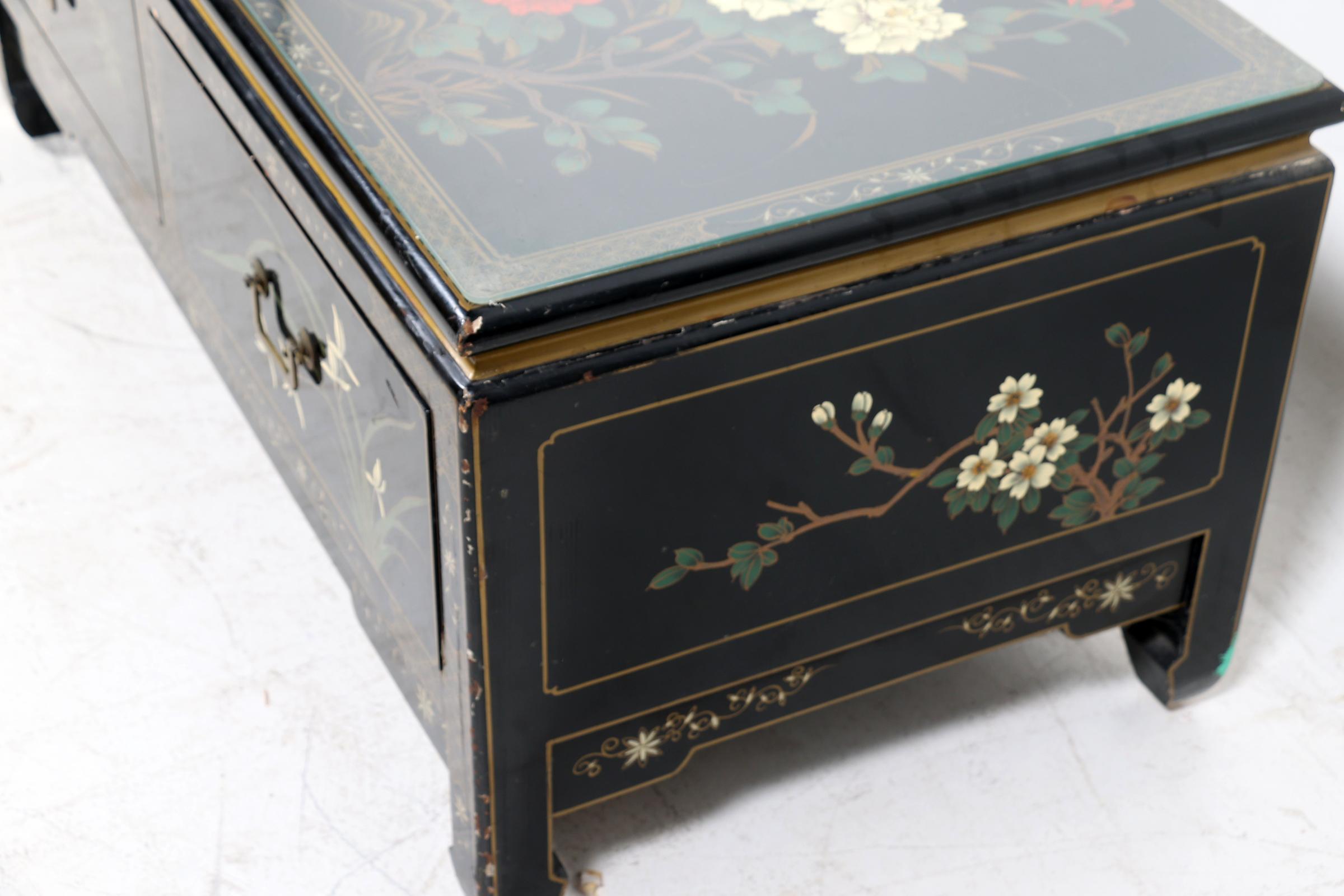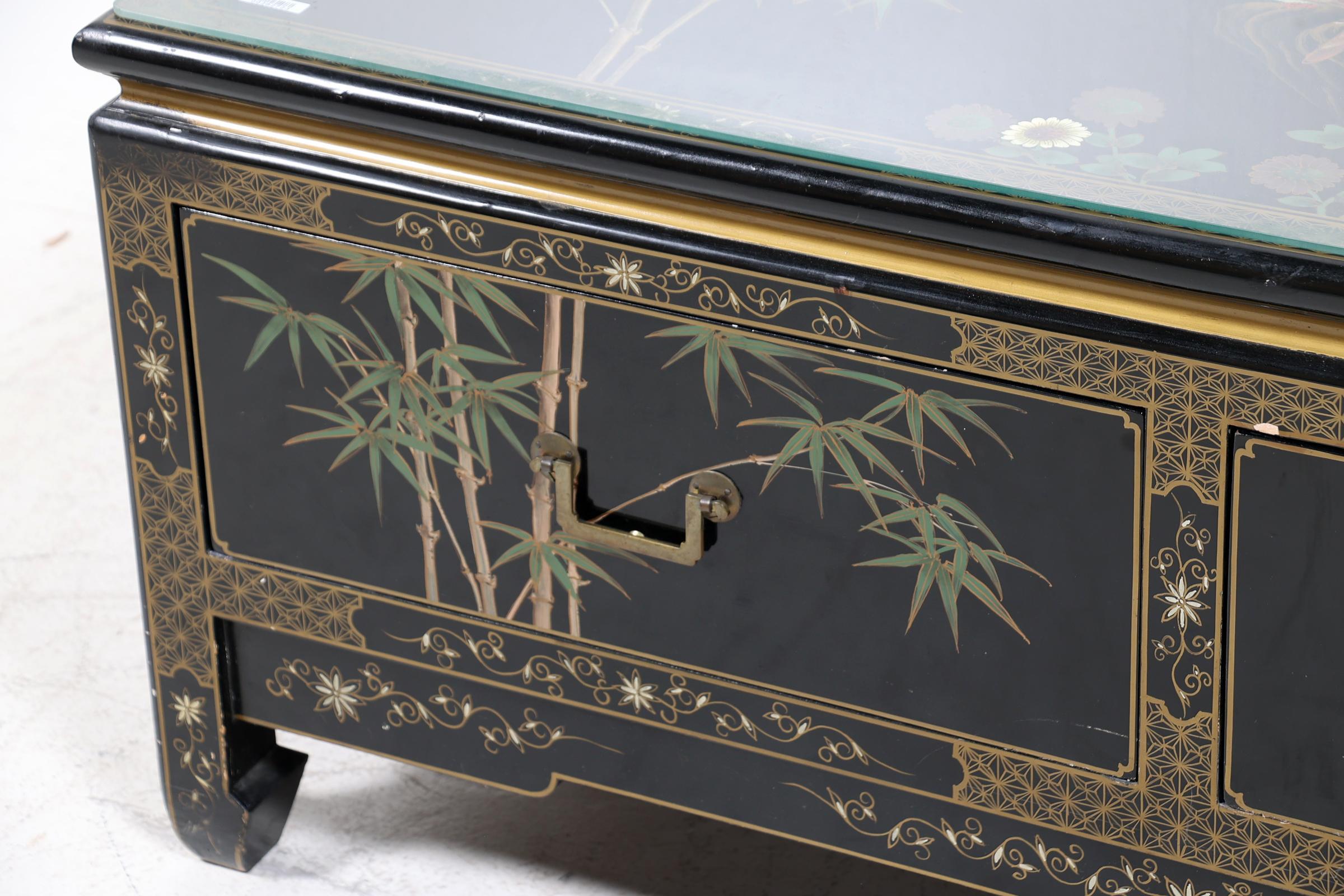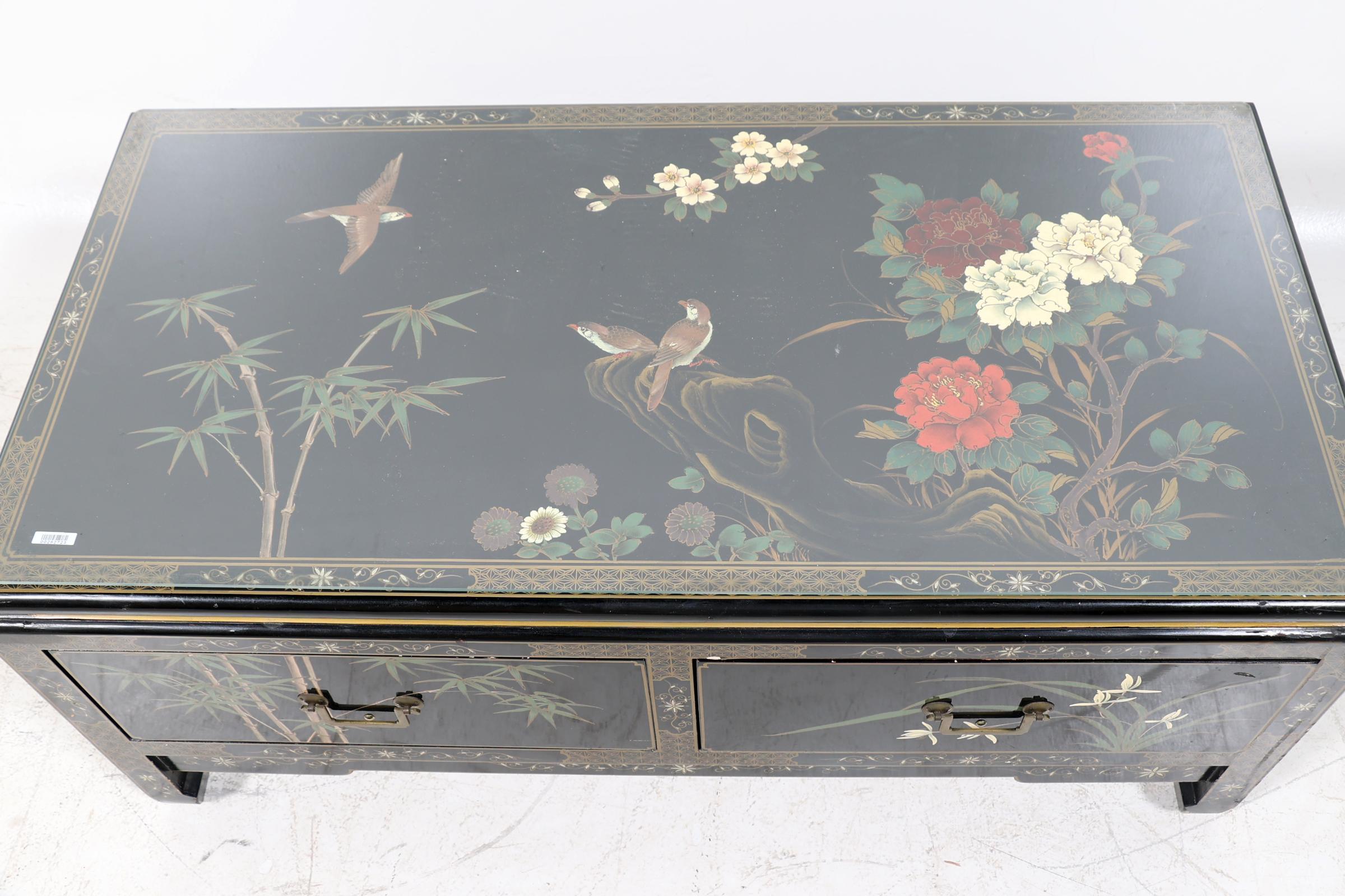 Chinese lakwerk salontafel met 2 laden en decor van bloemen en vogels, h.46 x b.107 x d.53 cm.