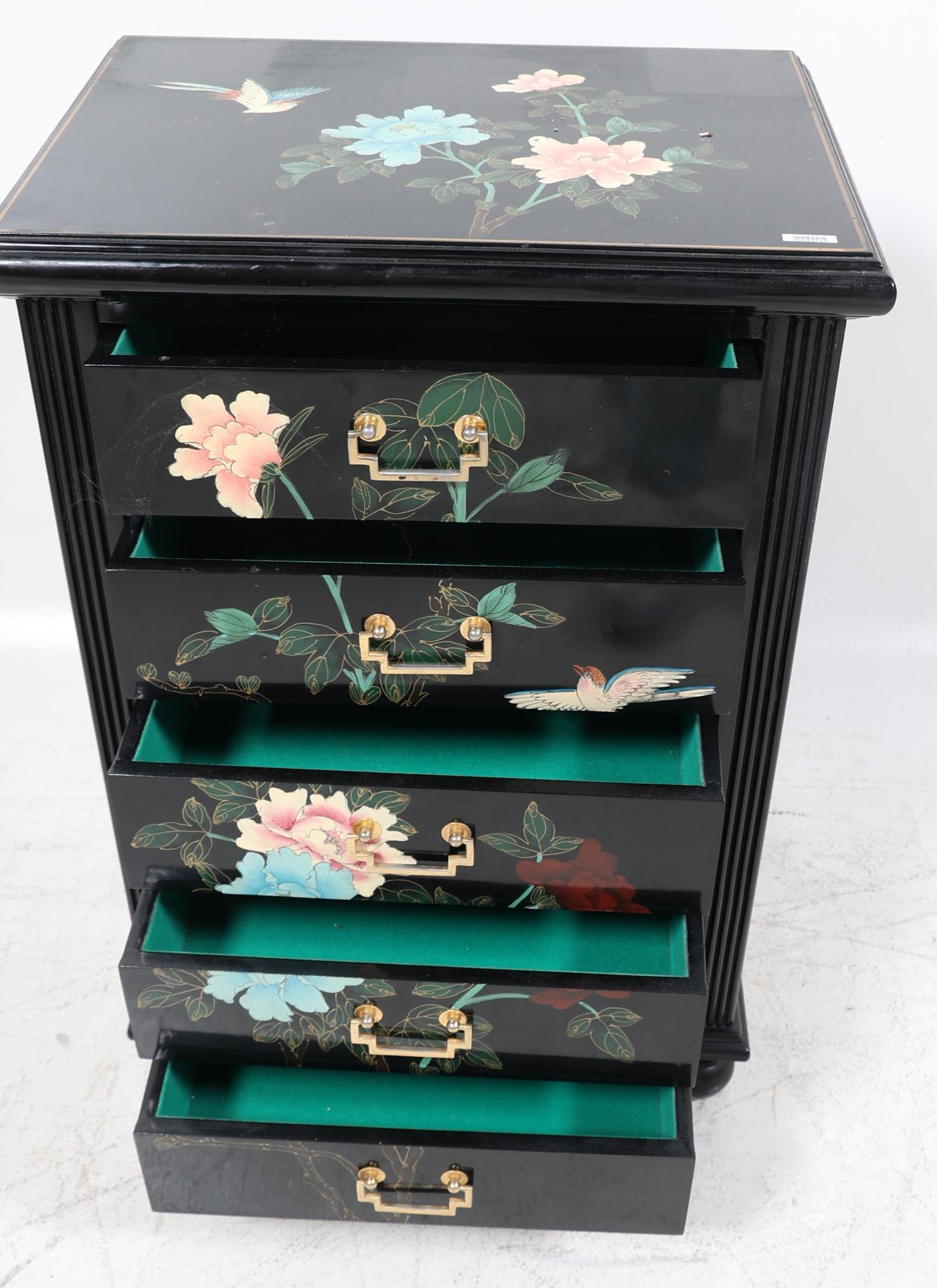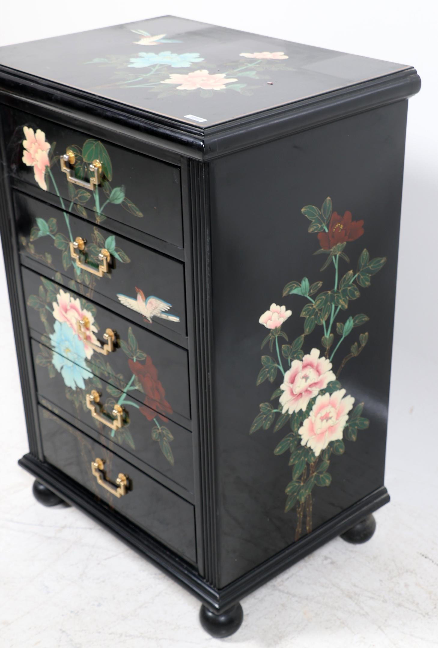 Chinees lakwerk ladenkast met 5 laden en florale motieven, h.82 x b.56 x 41 cm.