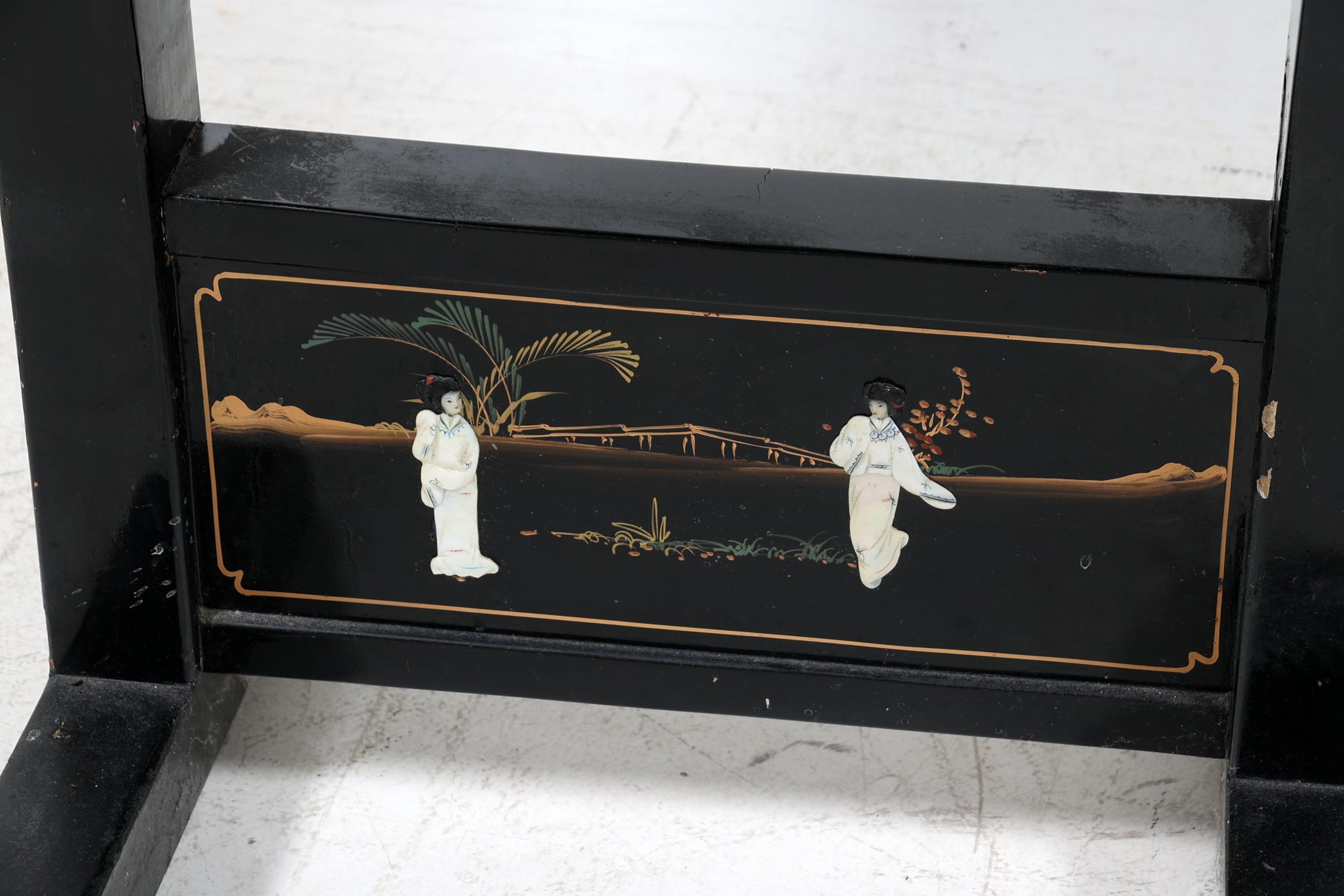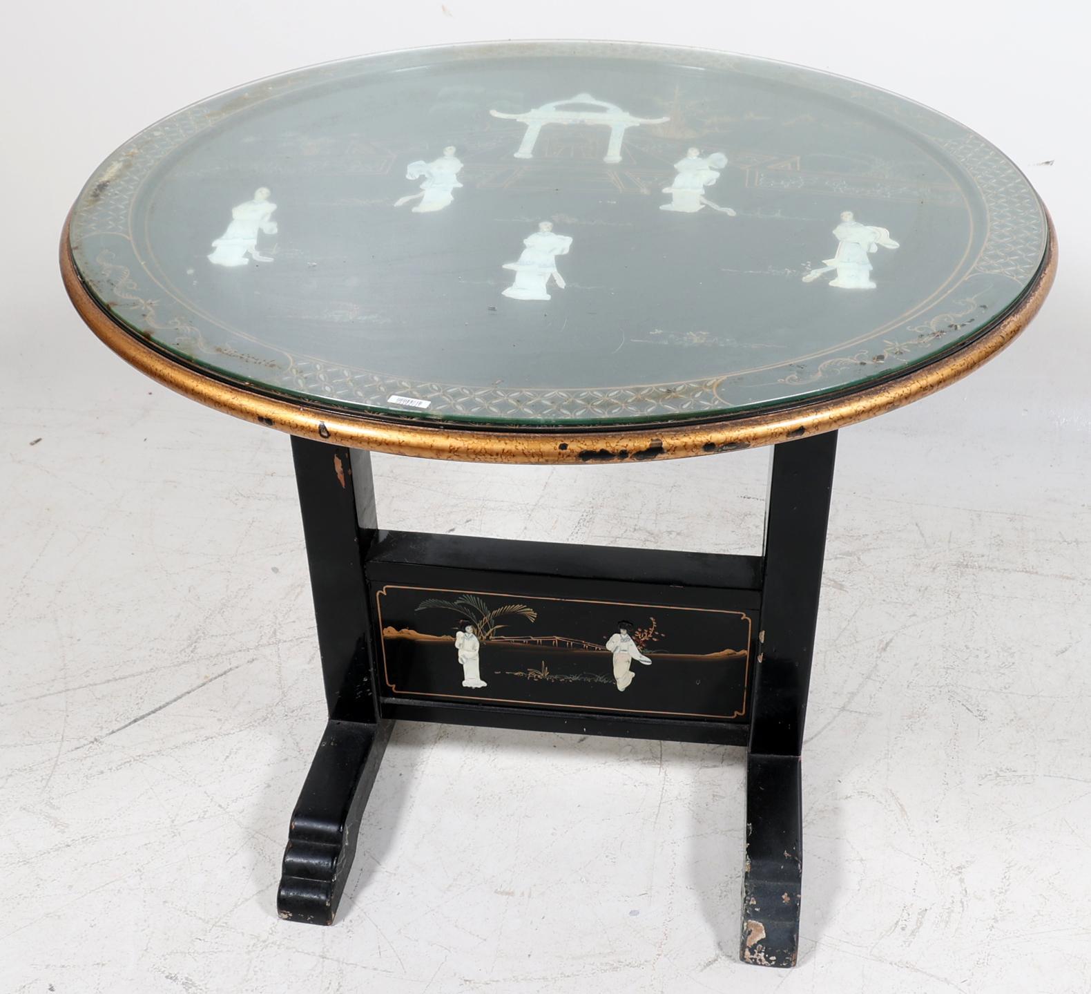 Chinees lakwerk tafel met decor van personen bij een tempel, h.84 x diam.100 cm.