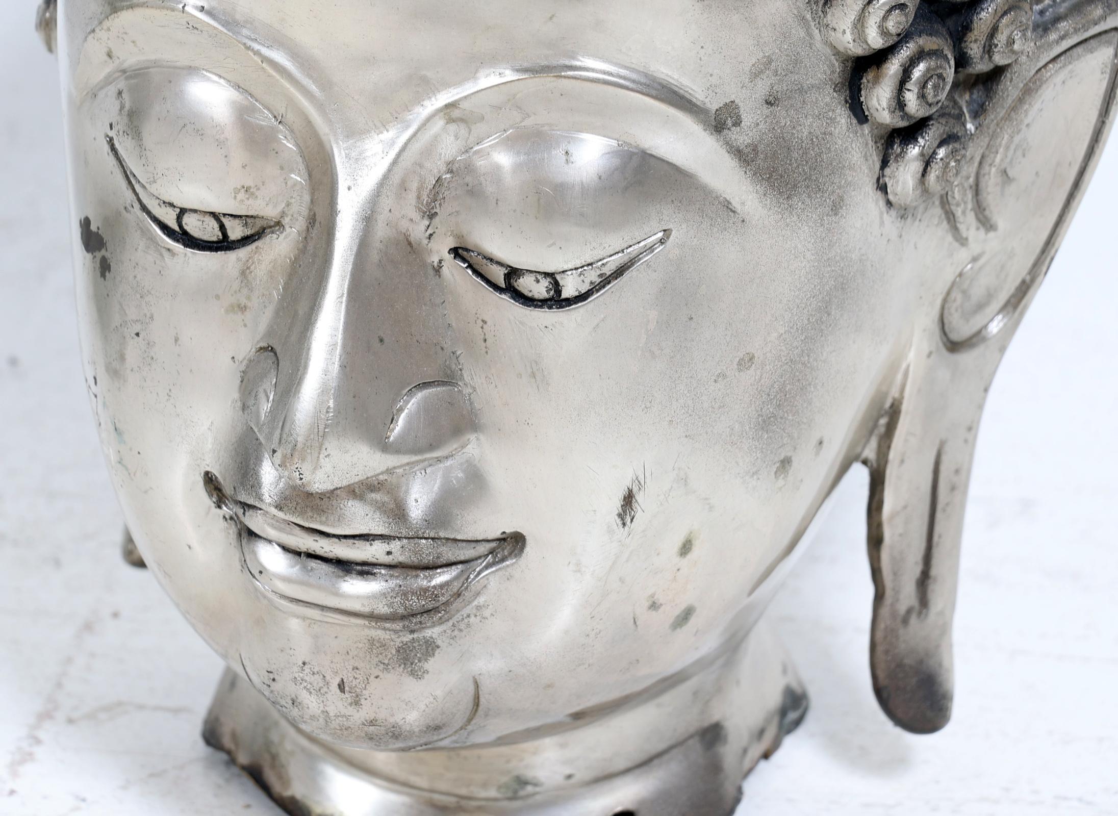 Zilverkleurig Boeddha hoofd, h.40 cm.