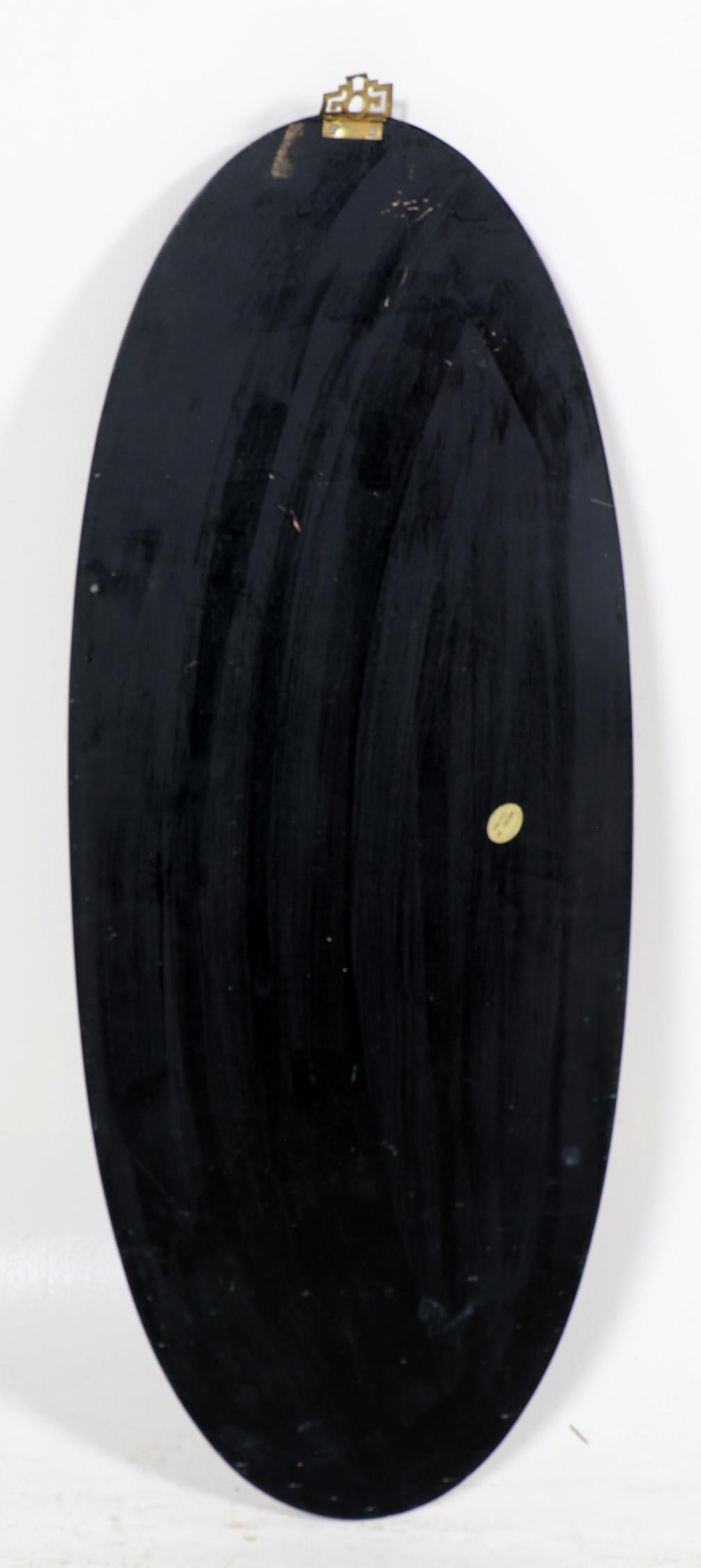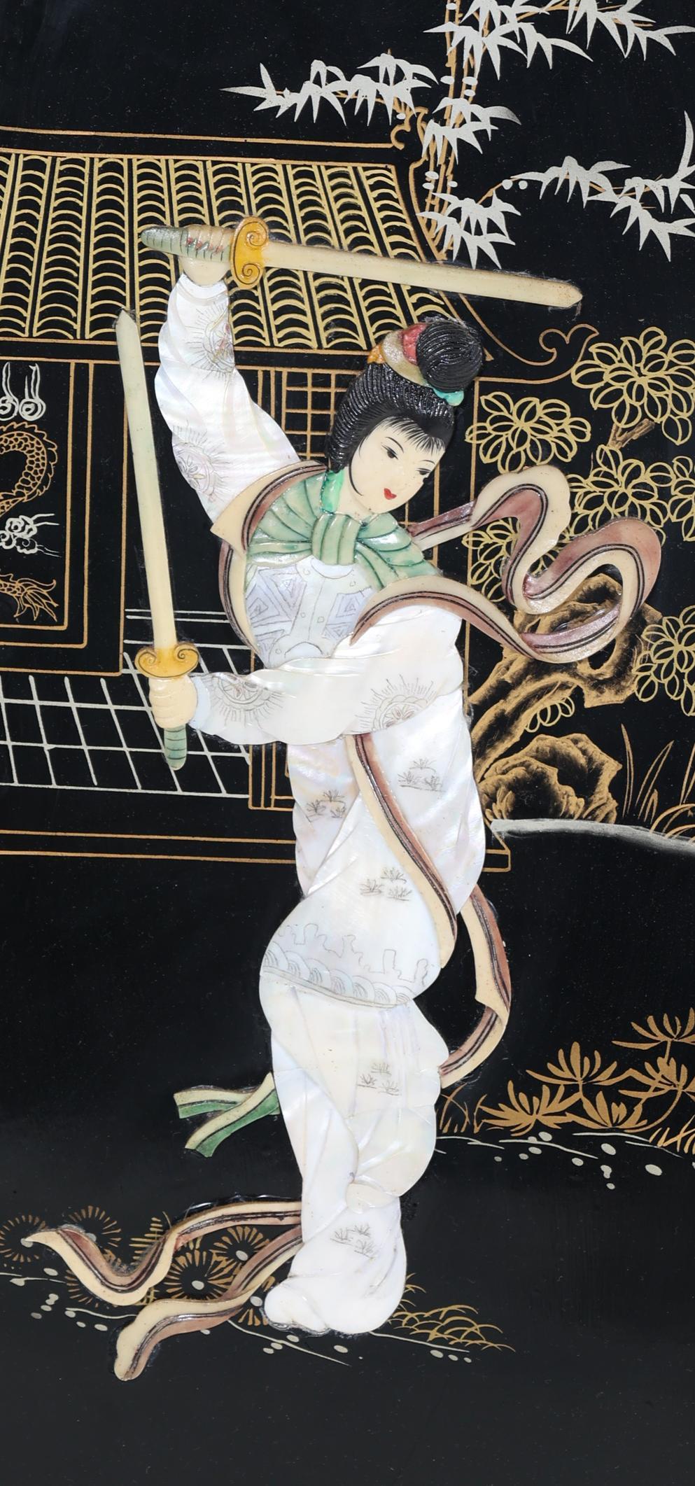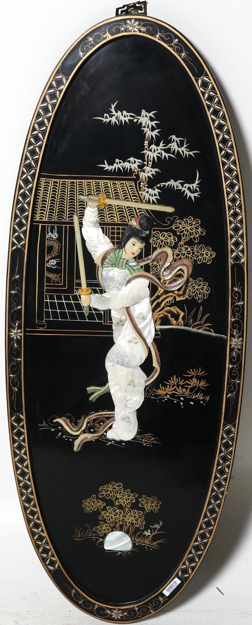 Lakwerk paneel met voorstelling van een dame met zwaarden, 91 x 35 cm.