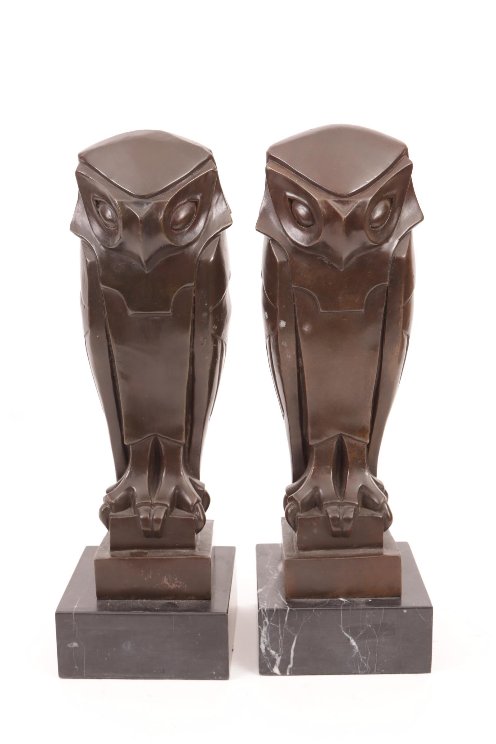 2 Art Deco-stijl boekensteunen i.v.v. uilen rustend op marmeren voetstuk, h.38 cm,.