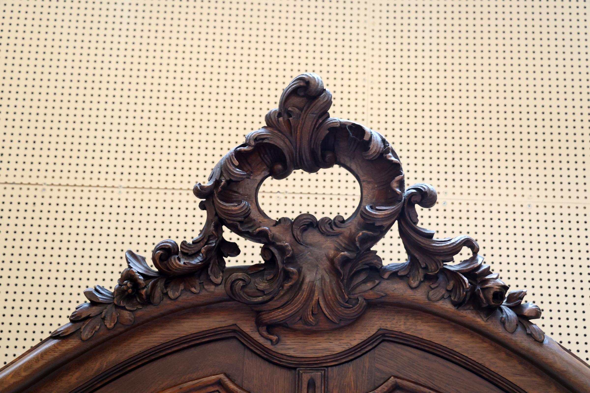 Oude rijkbewerkte eikenhouten 2-deurs kuifvitrinekast rustend op open onderstel, h.244 x b.142 x d.43 cm.