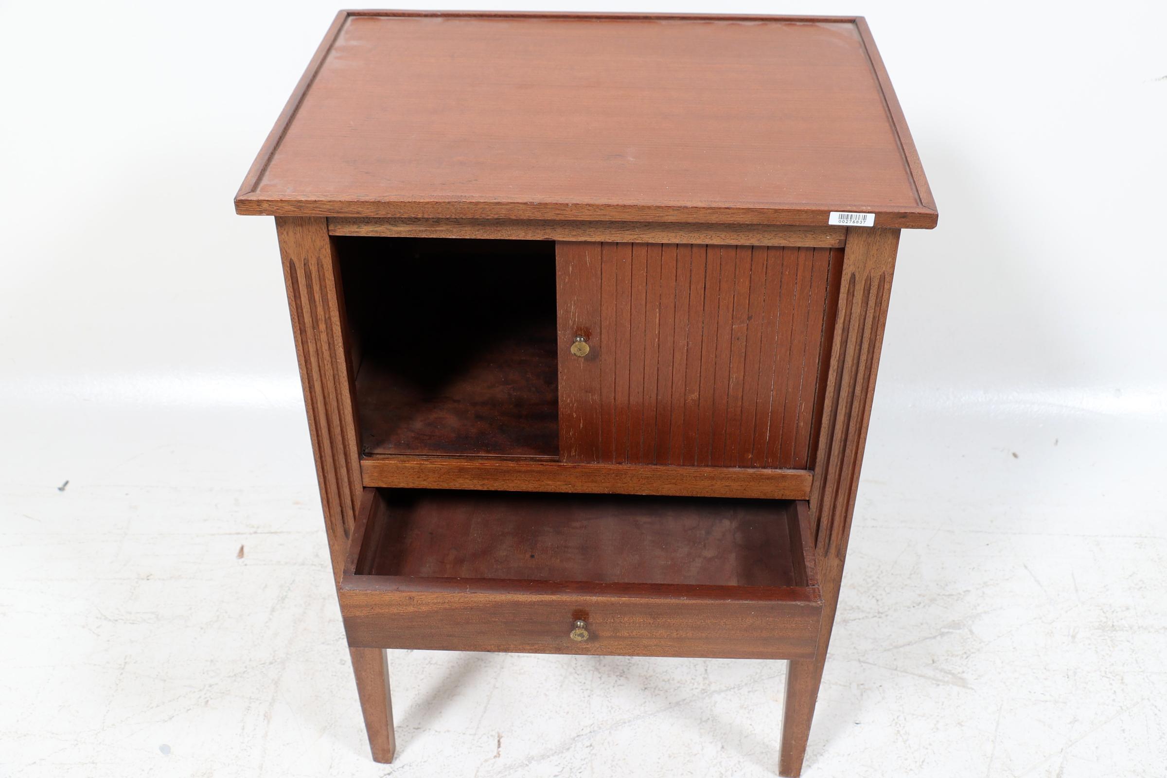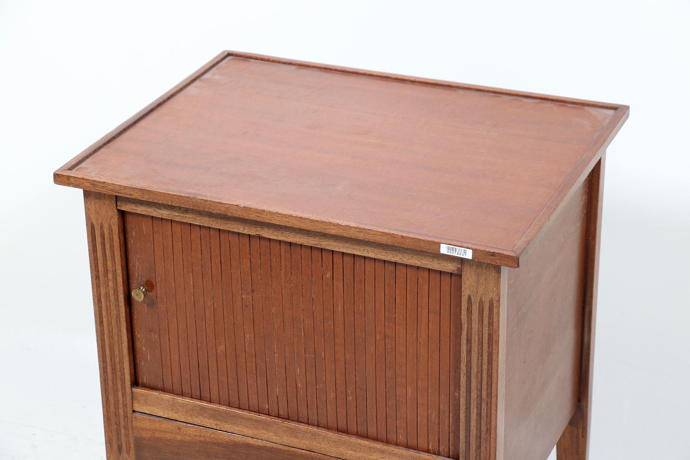 Mahoniehouten pottenkastje met jaloeziedeur, h.68 x b.51 x d.40 cm.