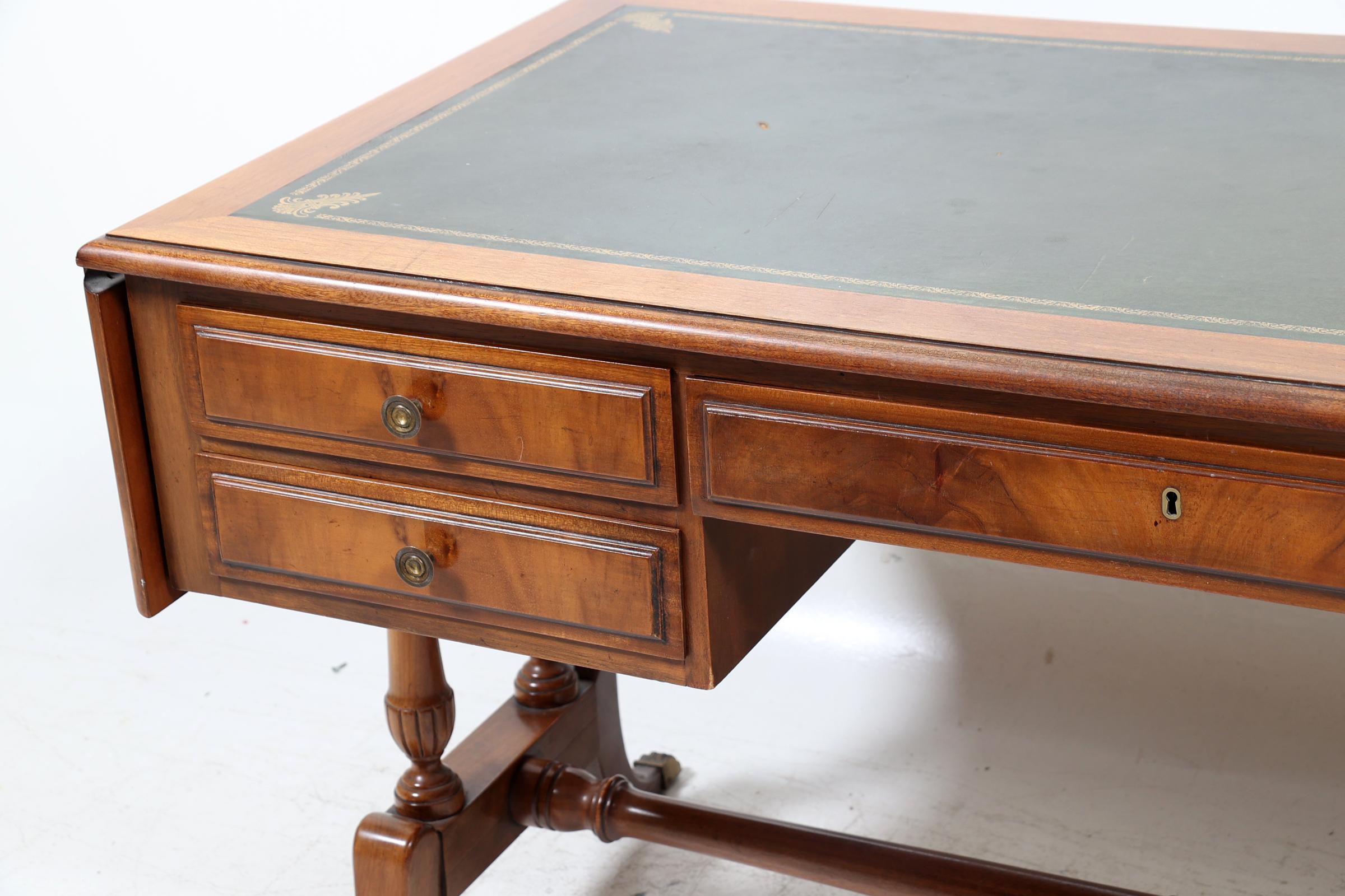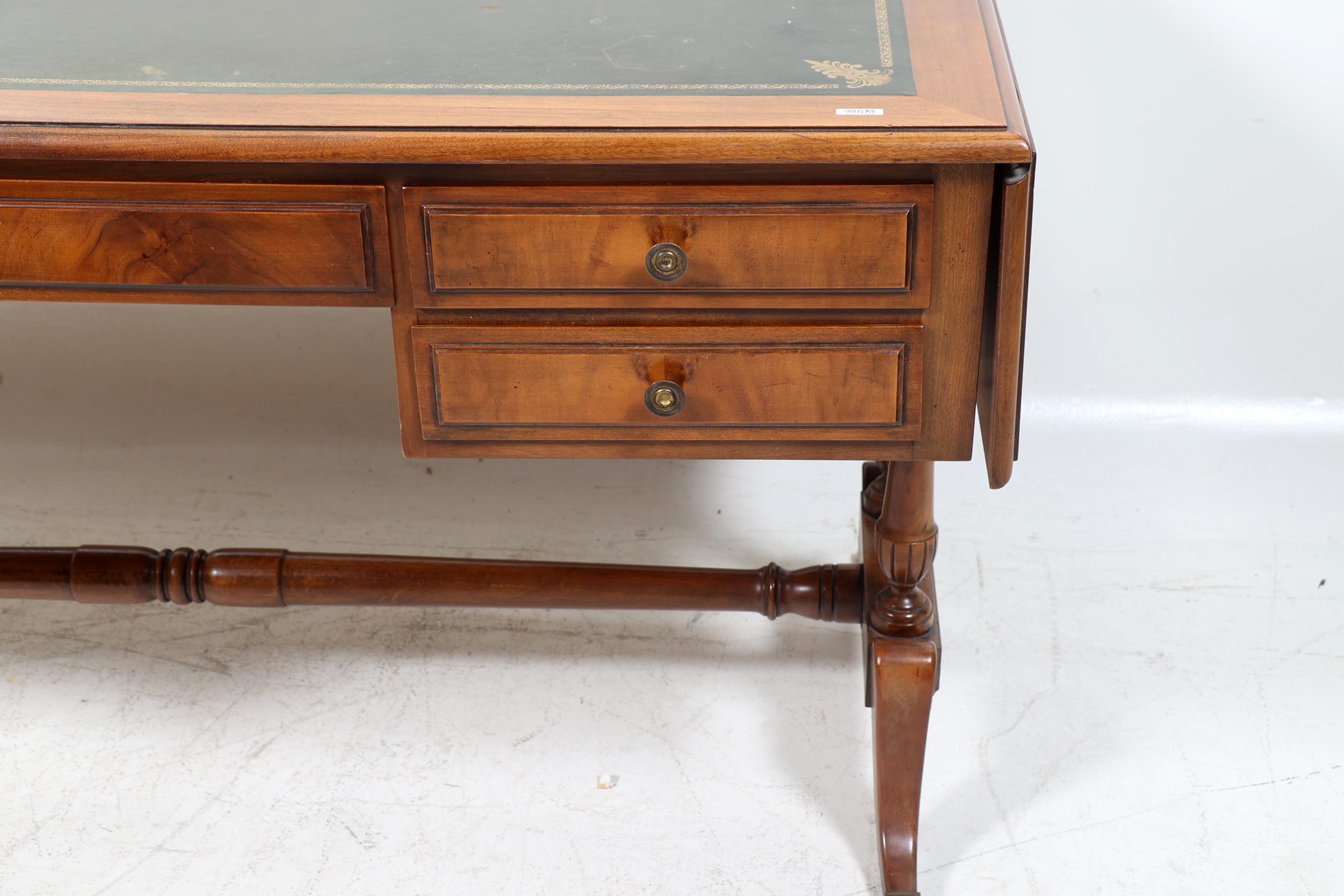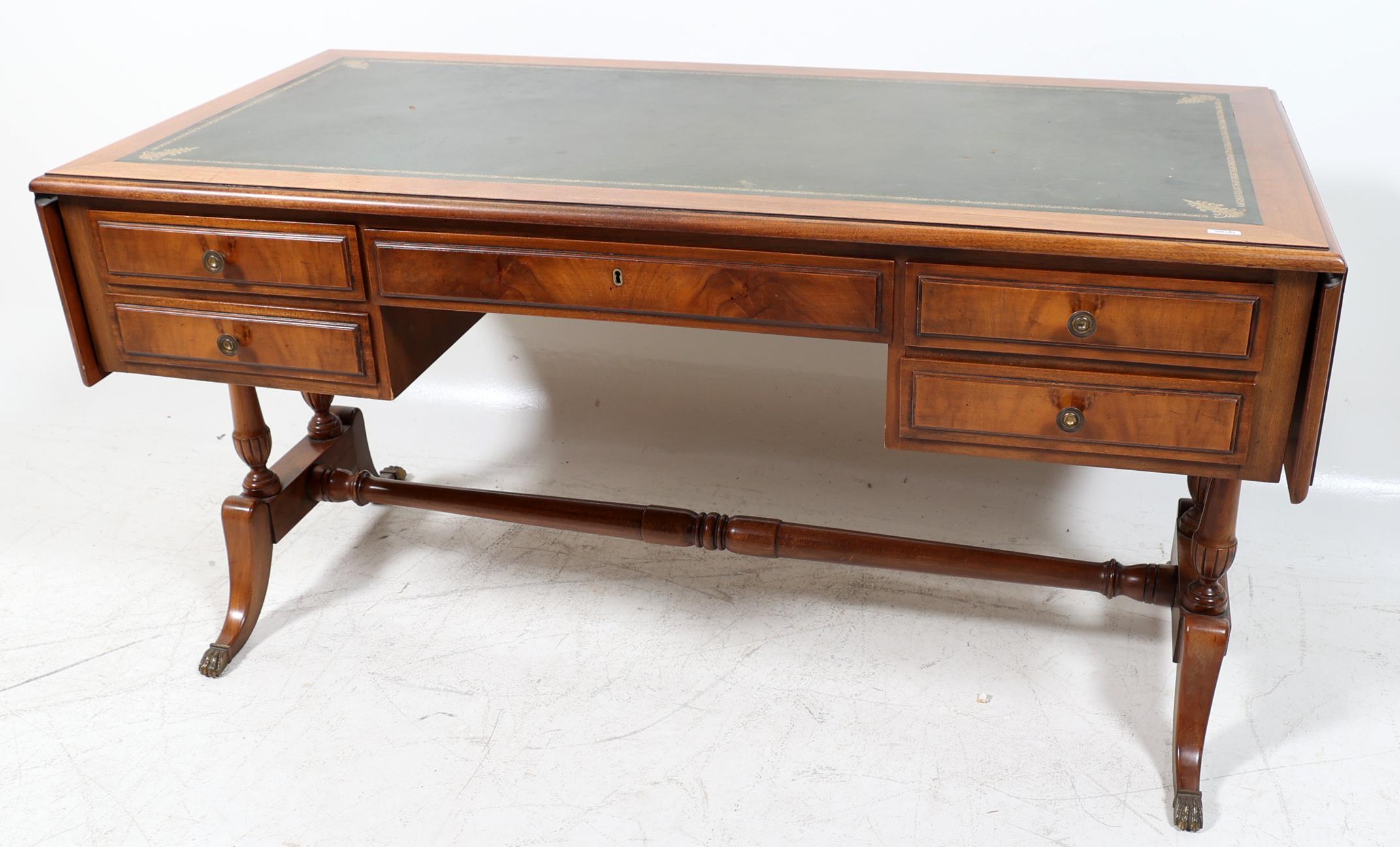 Notenhouten plat bureau met groen lederen blad rustend op klauwpoten, h.79 x d.73 x L.150 of 202 cm.