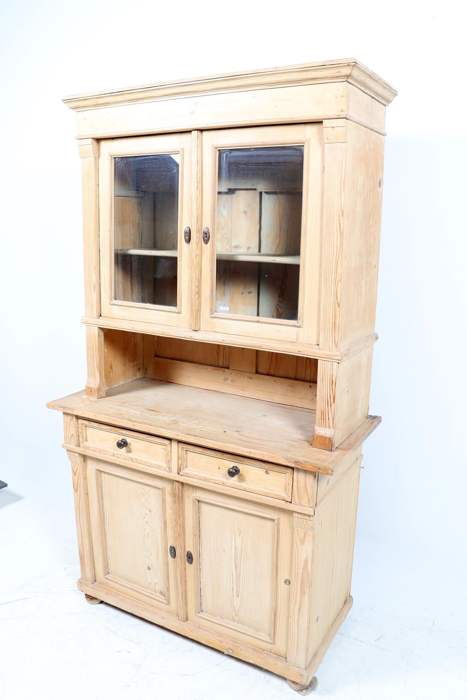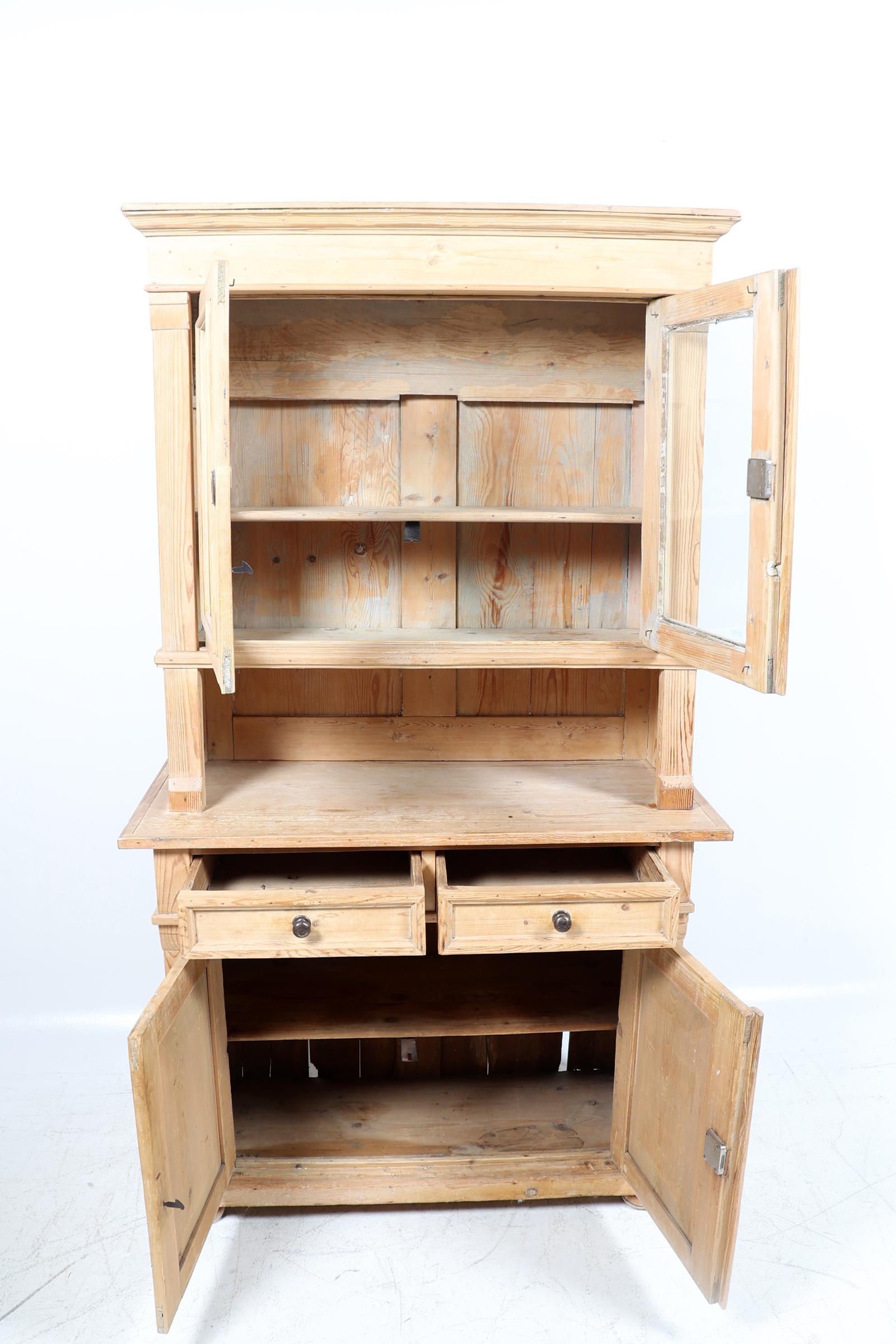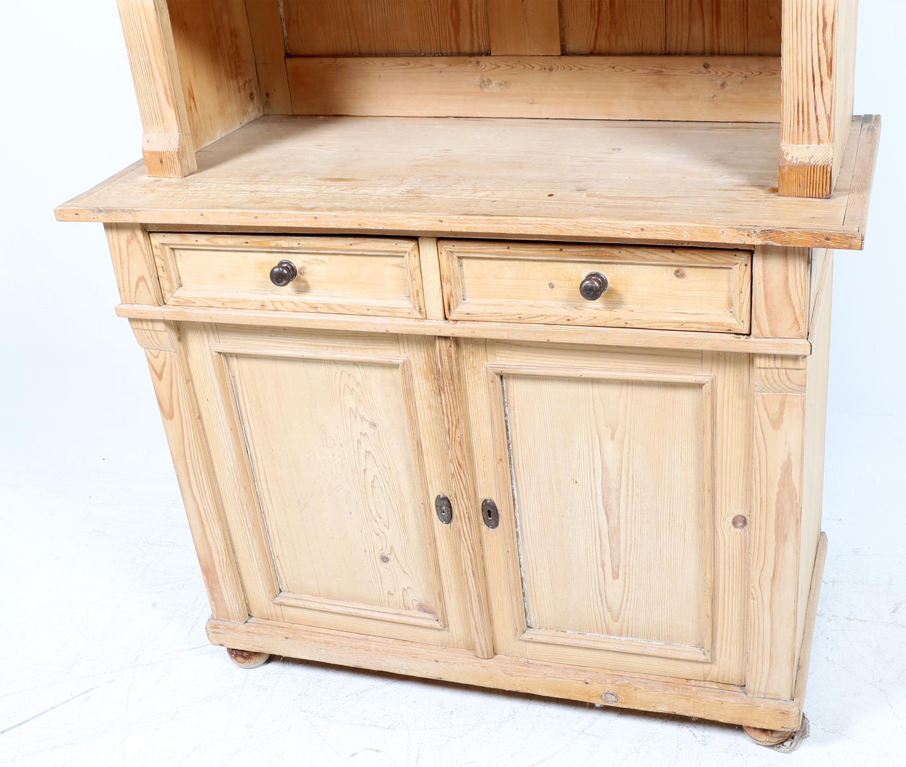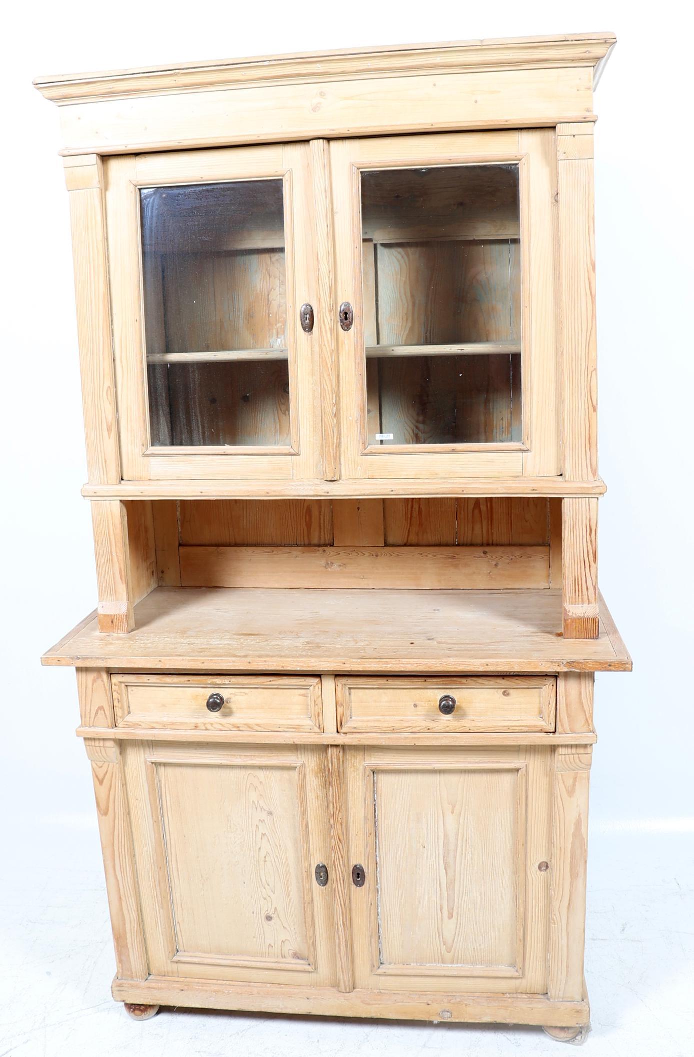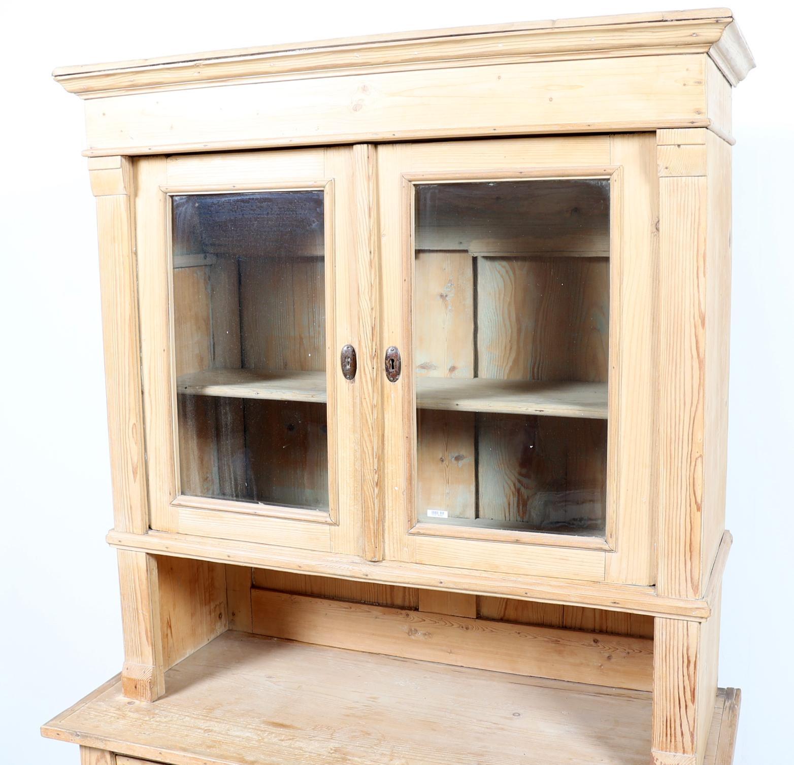 Antieke grenenhouten buffetkast met 2-deurs vitrine-opstand, h.96 x b.110 x d.50 cm.