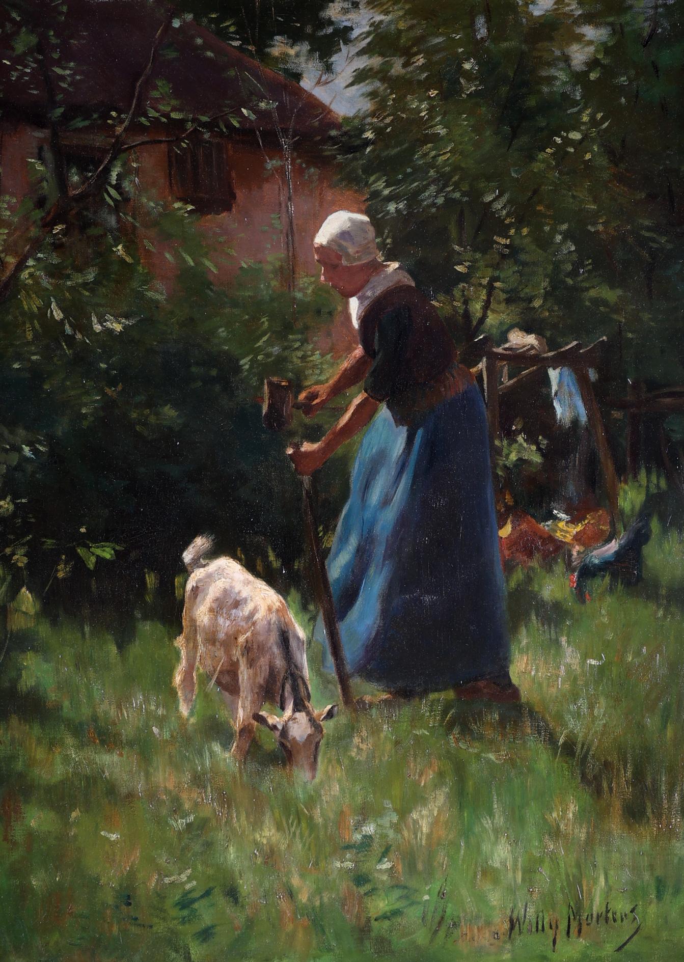 Willy Martens (1856-1927), Boerin met geit in landschap, olieverf op doek, 74 x 53 cm.