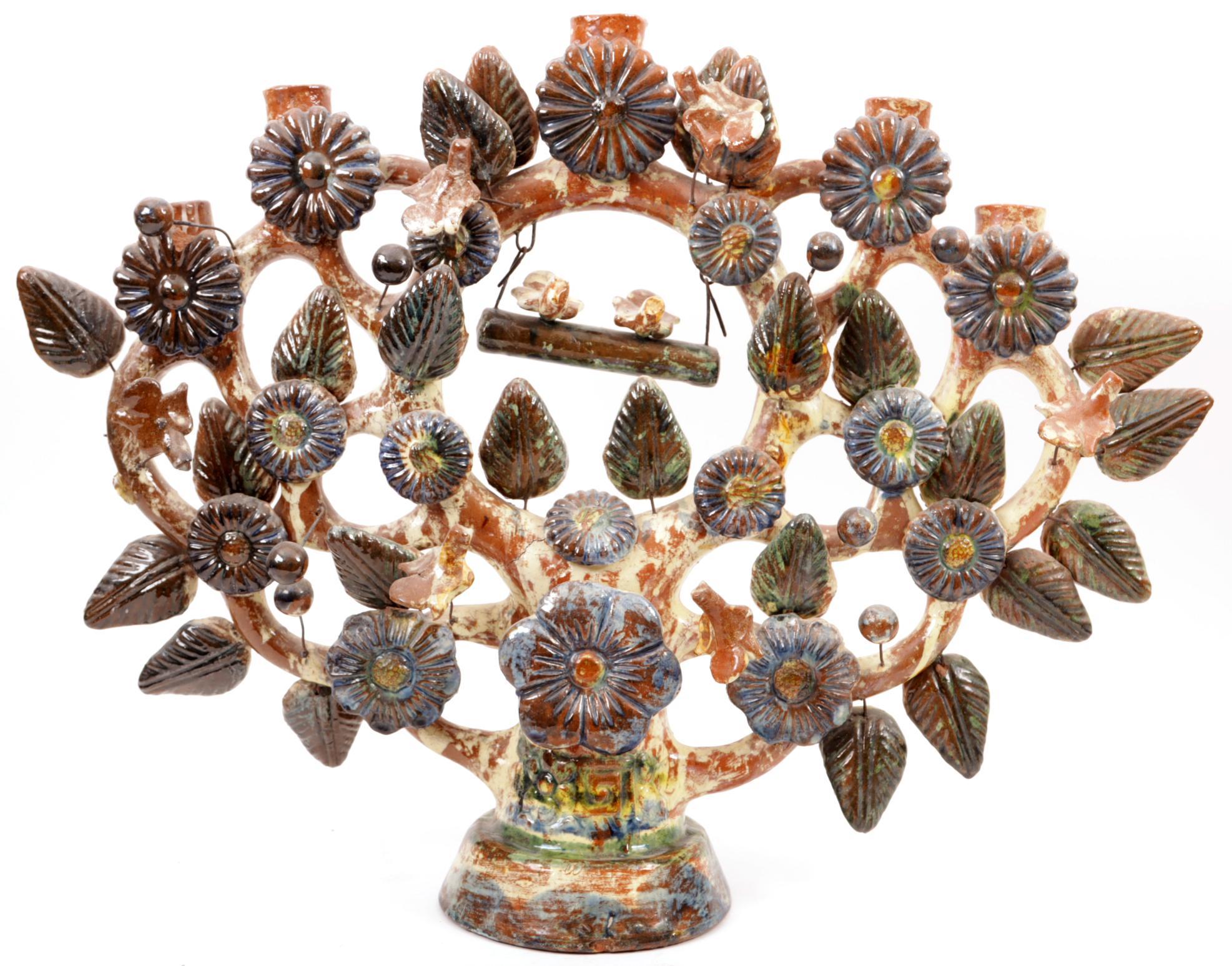 Gepolychromeerde aardewerken 5-lichts kandelaar, h.45 x b.60 cm.