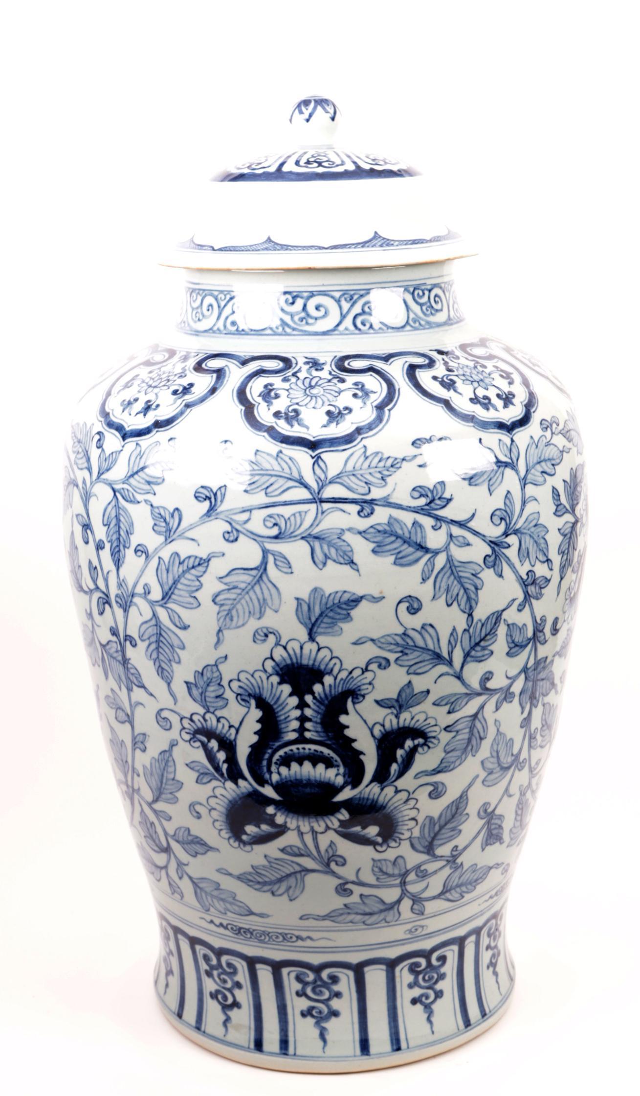 Blauw/wit gedecoreerde Chinees porseleinen dekselvaas, h.65 cm.
