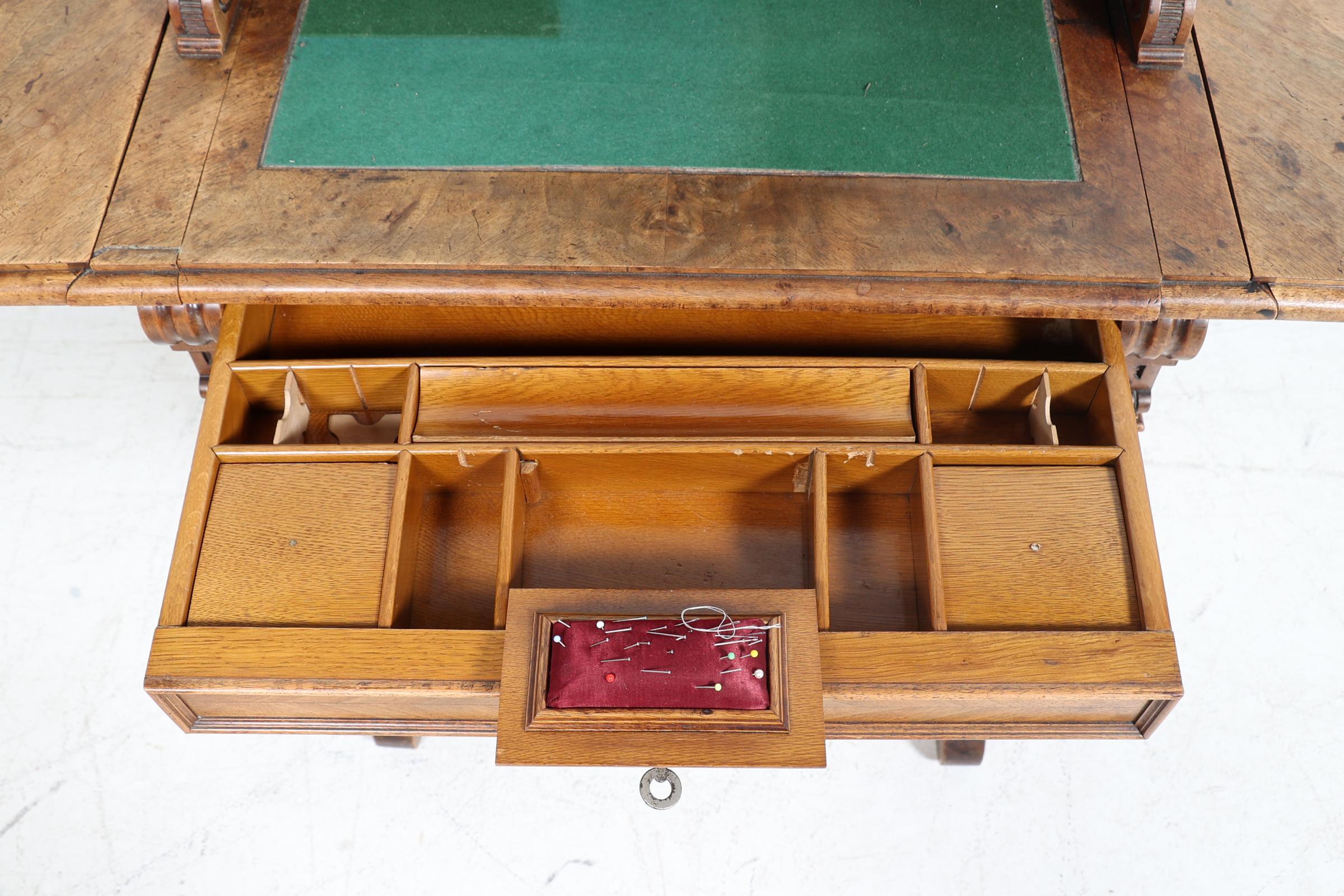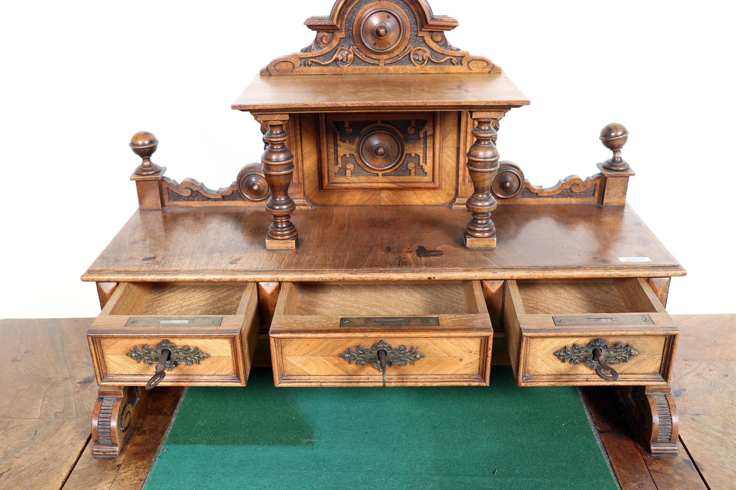 Antiek Duitse notenhouten werktafel met opstand en uitklapbare bladen, h.120 x b.66 of 116 x d.48 cm.