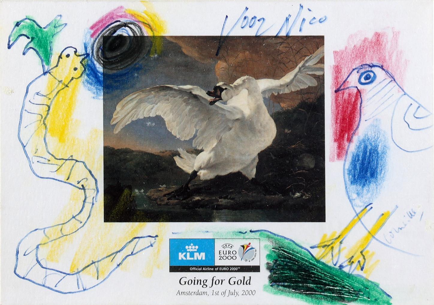 'Corneille', alias van Cornelis Guillaume van Beverloo, (1922- 2010), KLM official Airline of EURO 2000, ter gelegenheid voor het Europees Kampioenschap voetbal, door Corneille met de hand gedecoreerd "Voor Nico", 14,5 x 21 cm.