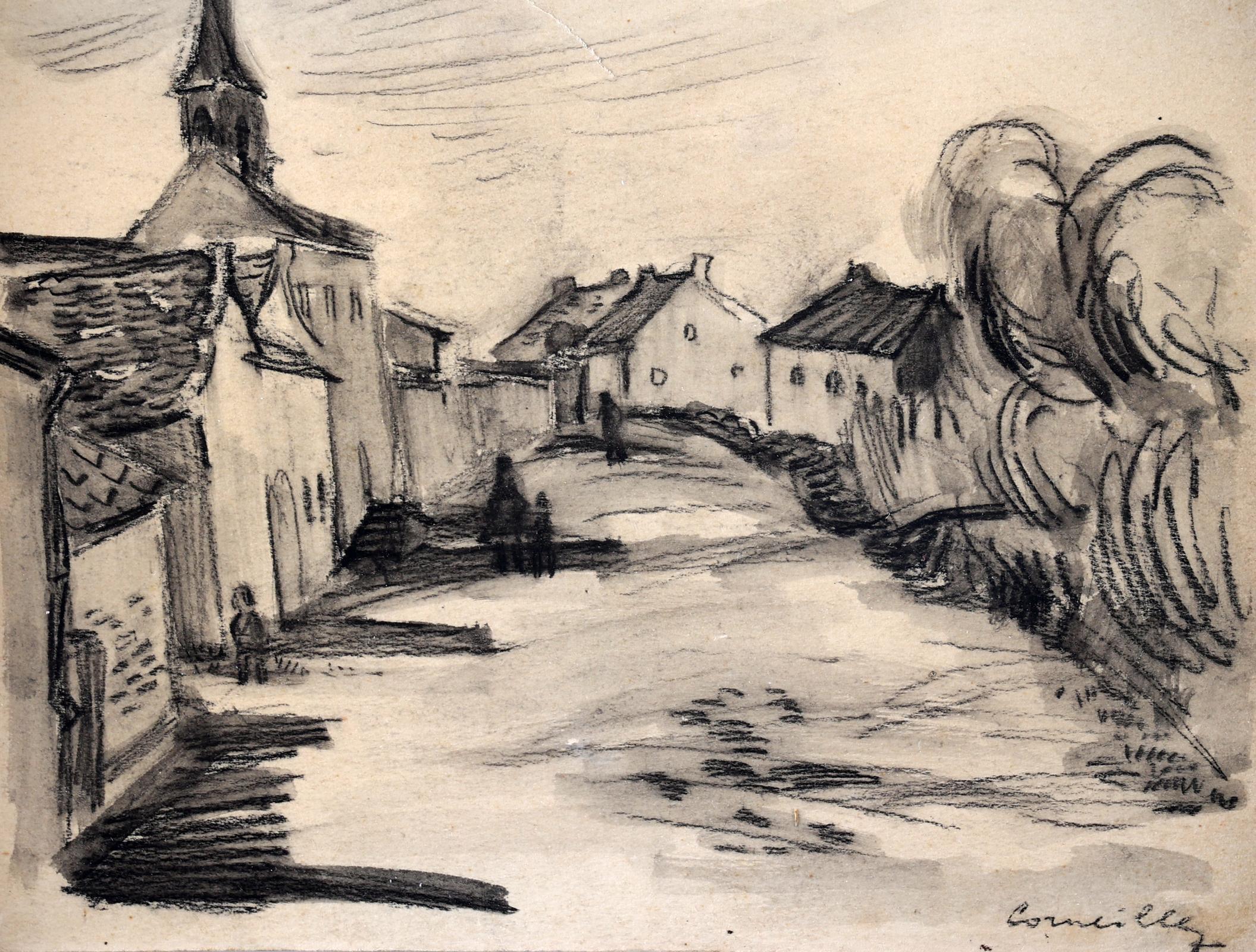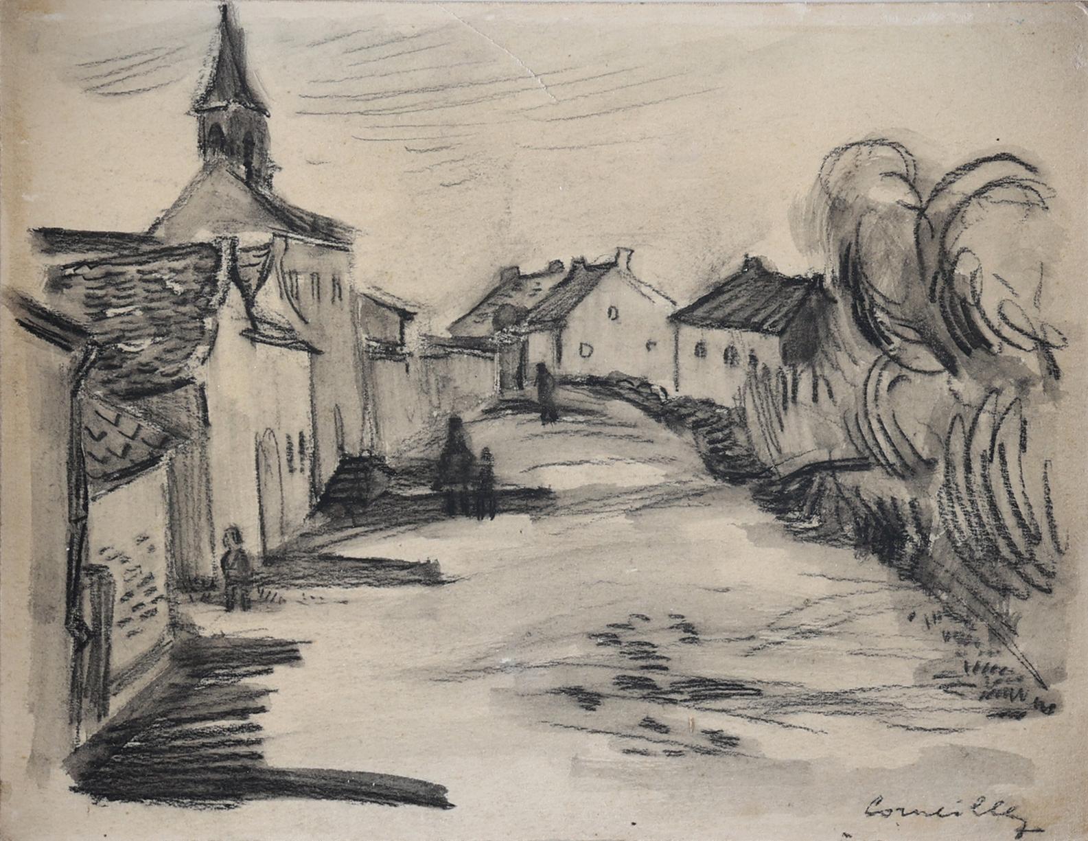 'Corneille', alias van Cornelis Guillaume van Beverloo, (1922- 2010), Dorpsgezicht met personen, houtskooltekening, 17,5 x 22 cm.