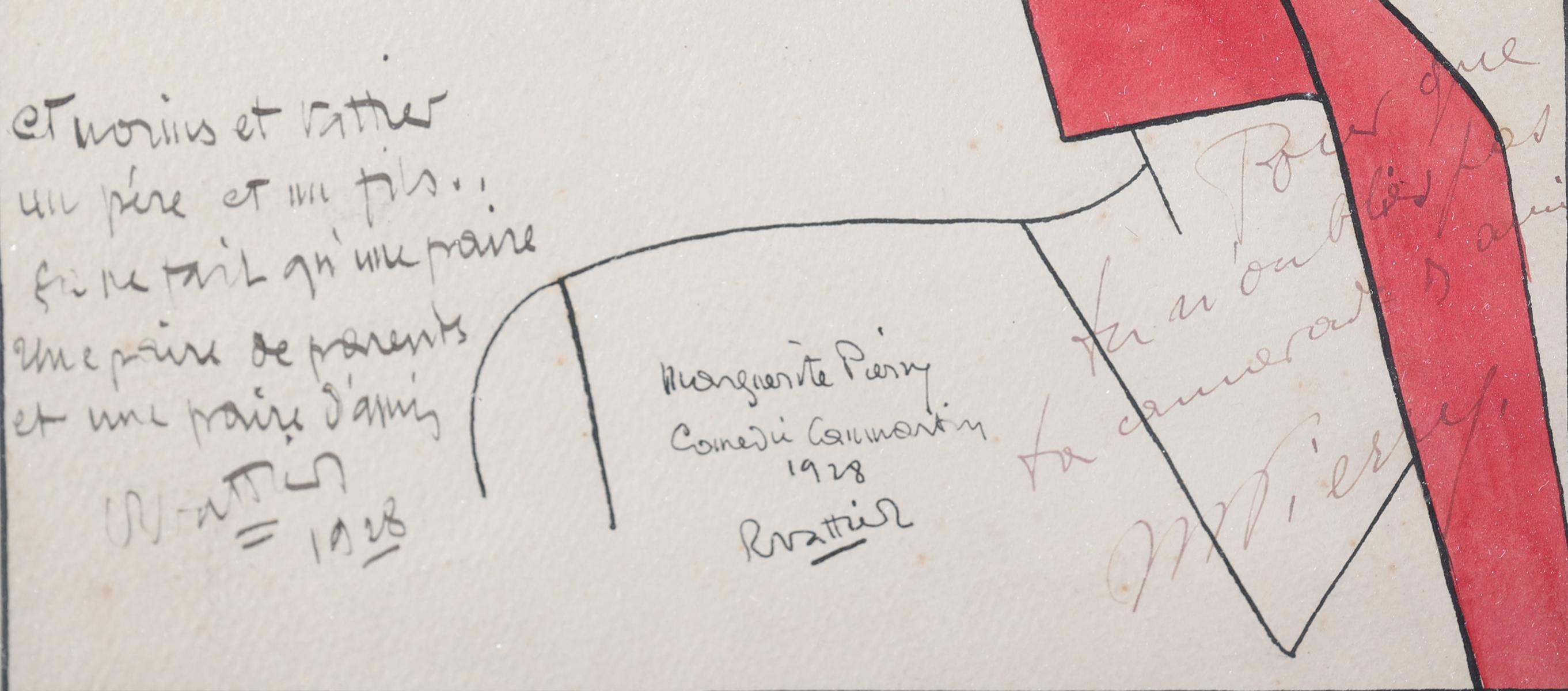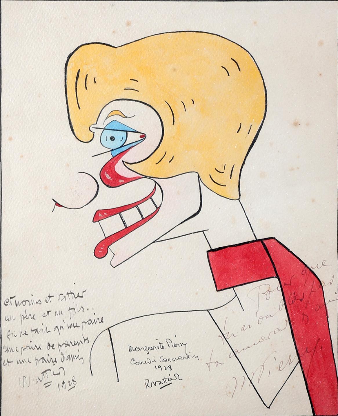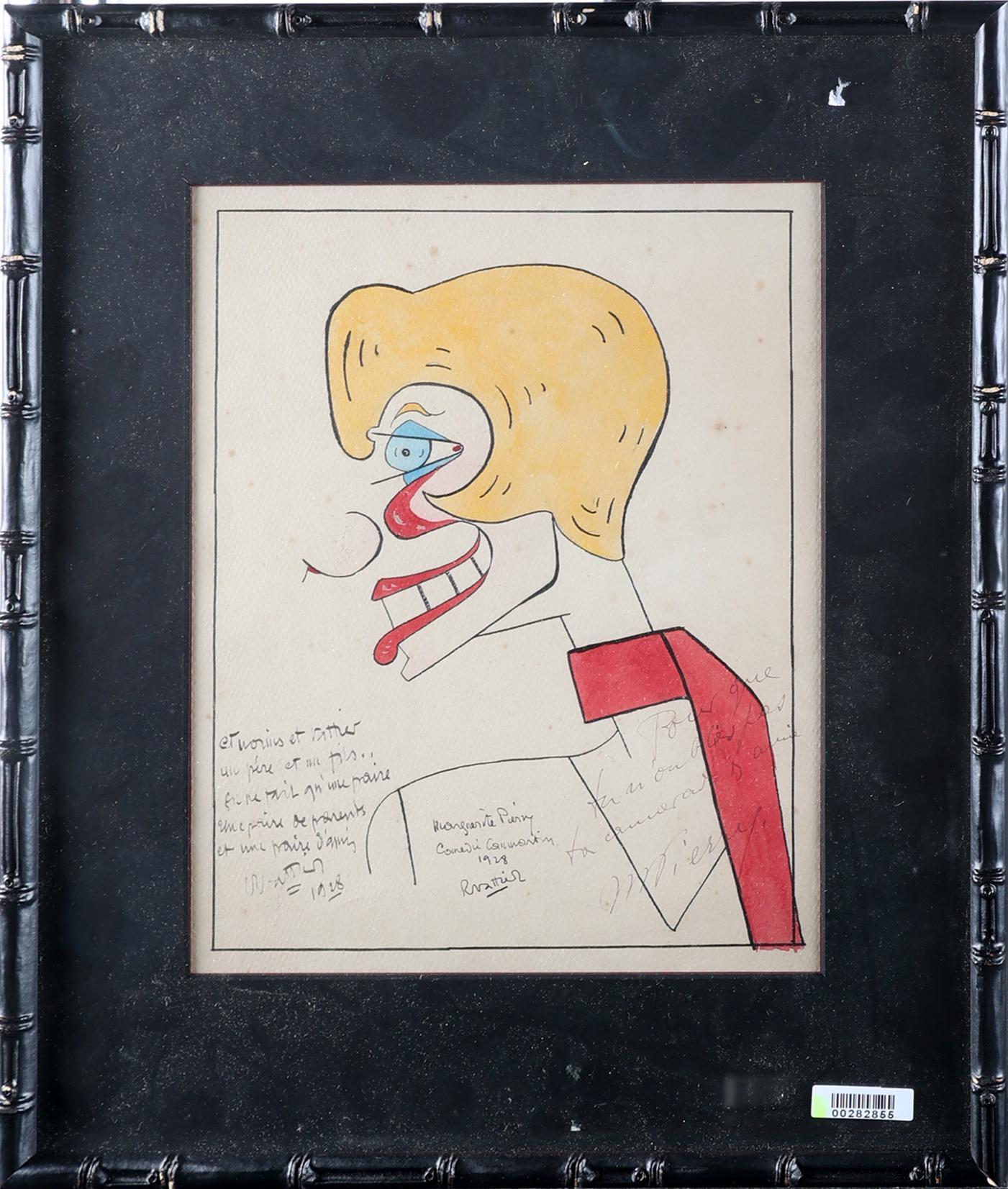 Robert Vattier (1906-1982), Karikatuur van Marguerite Pierry (1887-1963) met handgeschreven teksten, gedateerd 1928, 25,5 x 20 cm. note. Marguerite Pierry (1887-1963). Was actief in het komische genre en verscheen in de jaren dertig ook in films. Daarvoor speelde ze in het theater, waaronder klaarblijkelijk ook Comedie-Caumartin (gesloten in 2019), waar in 1928 waarschijnlijk deze tekening is gemaakt door, vermoedelijk de acteur Robert Vattier (1906-1982). Vattier werd eveneens bekend door komische rollen, ook in de film.