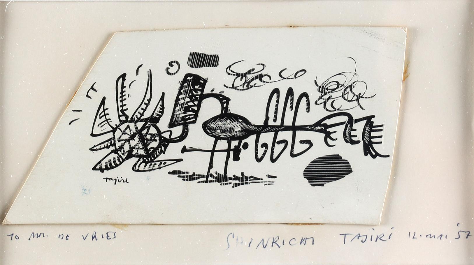 Shinkichi Tajiri (1923 - 2009), inkttekening op scraperboard, gedateerd 12 mei ´57, in opdracht van Mr. de Vries, 16,5 x 9 cm.