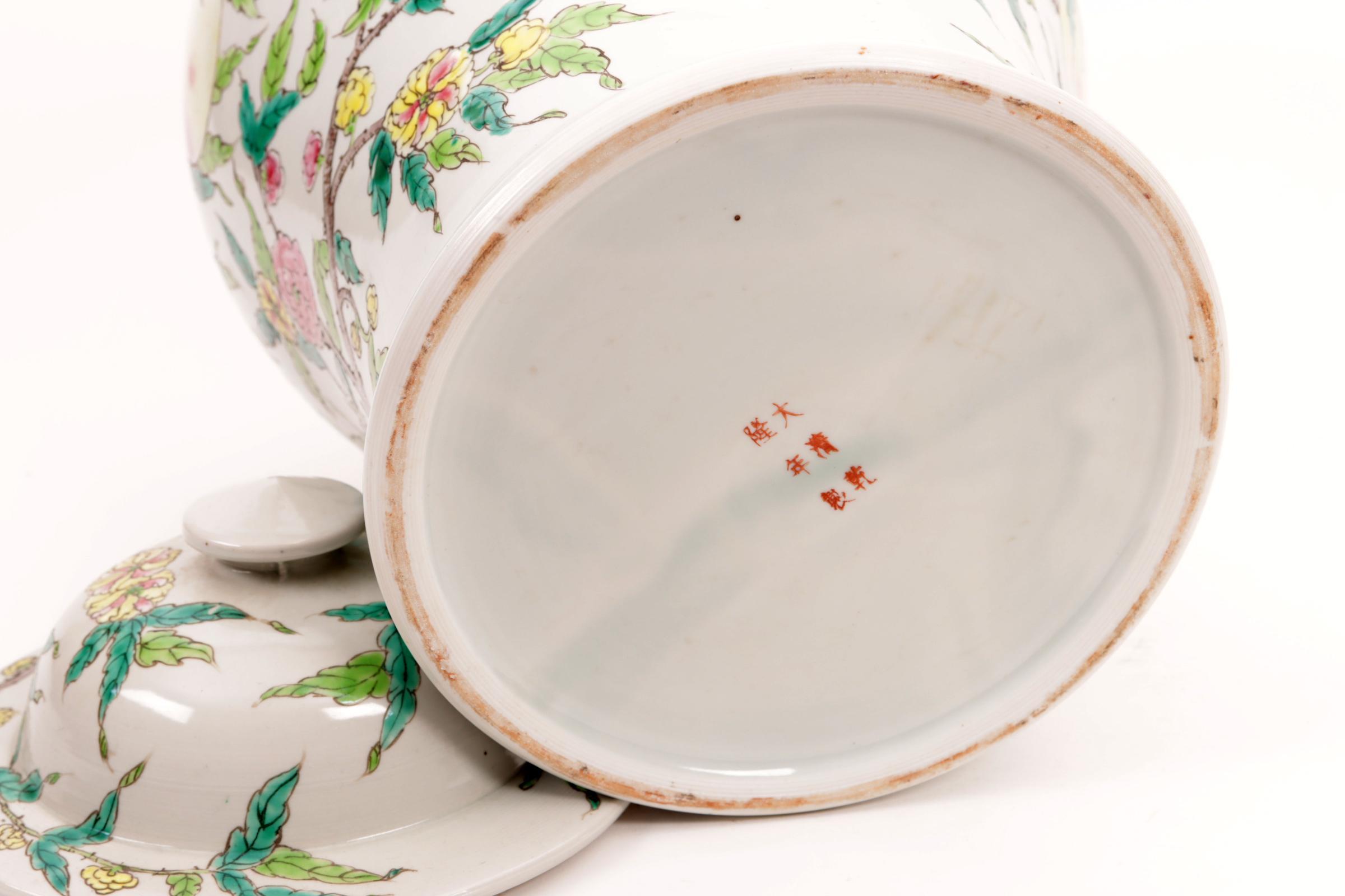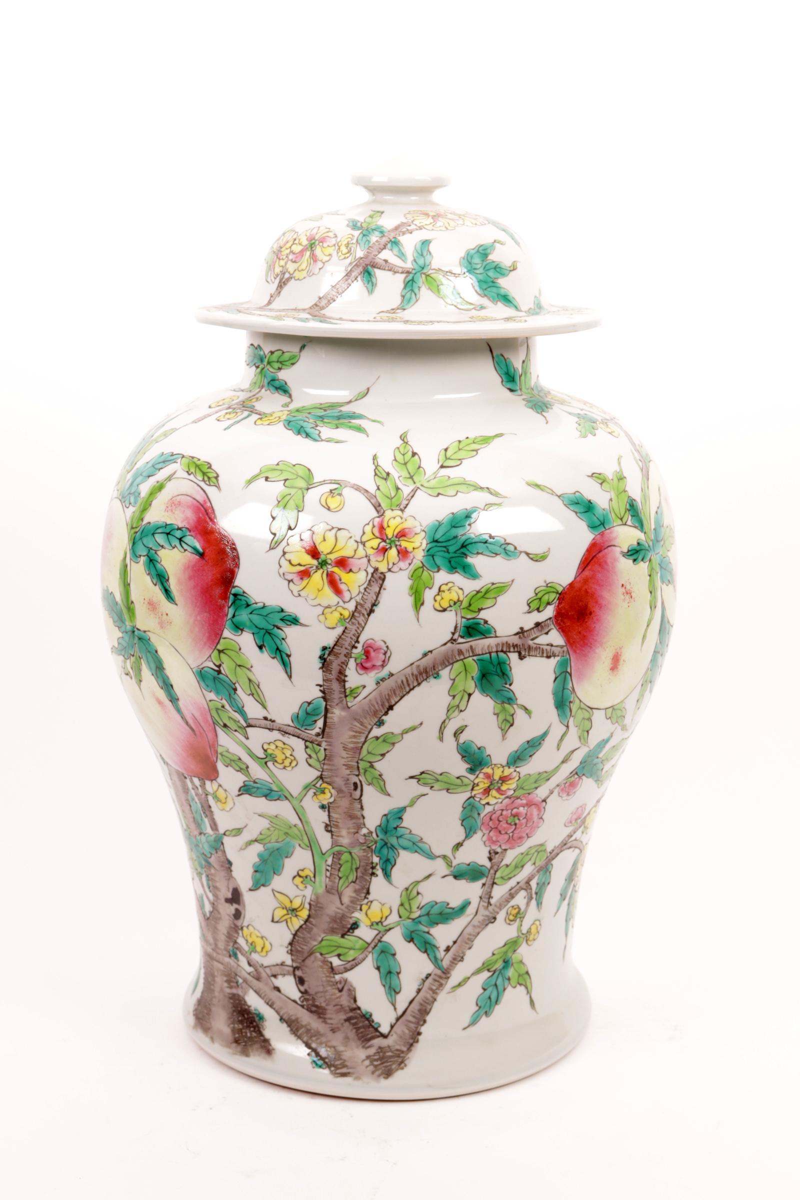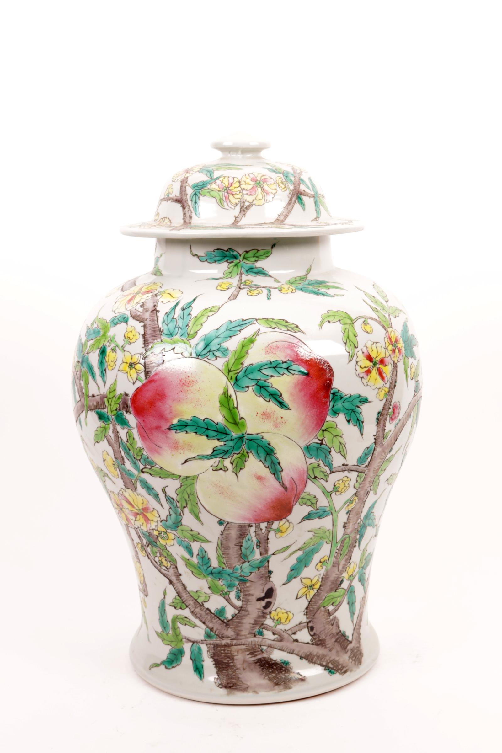 Met bloemen en vruchten gedecoreerde Chinees porseleinen deksepot, h.40 cm.