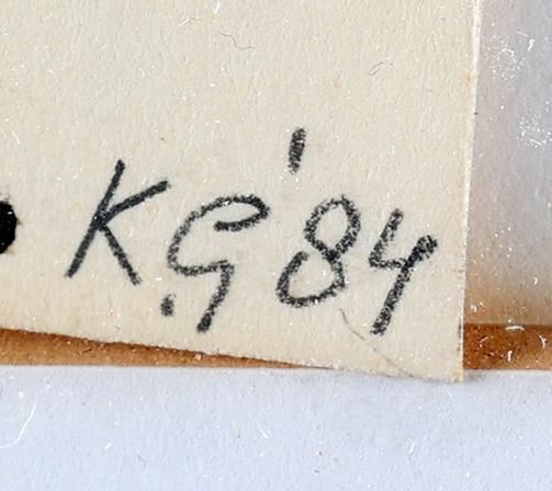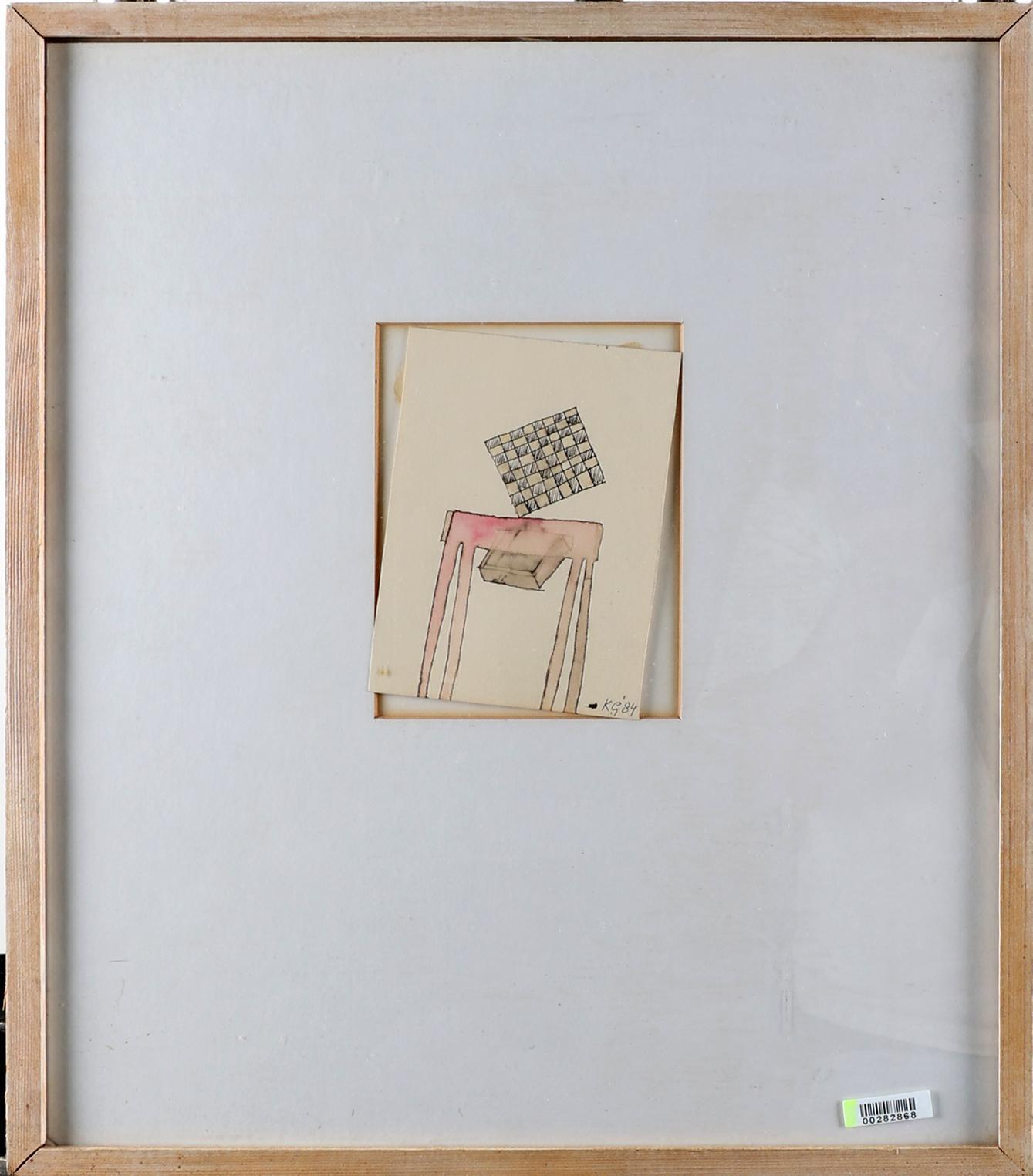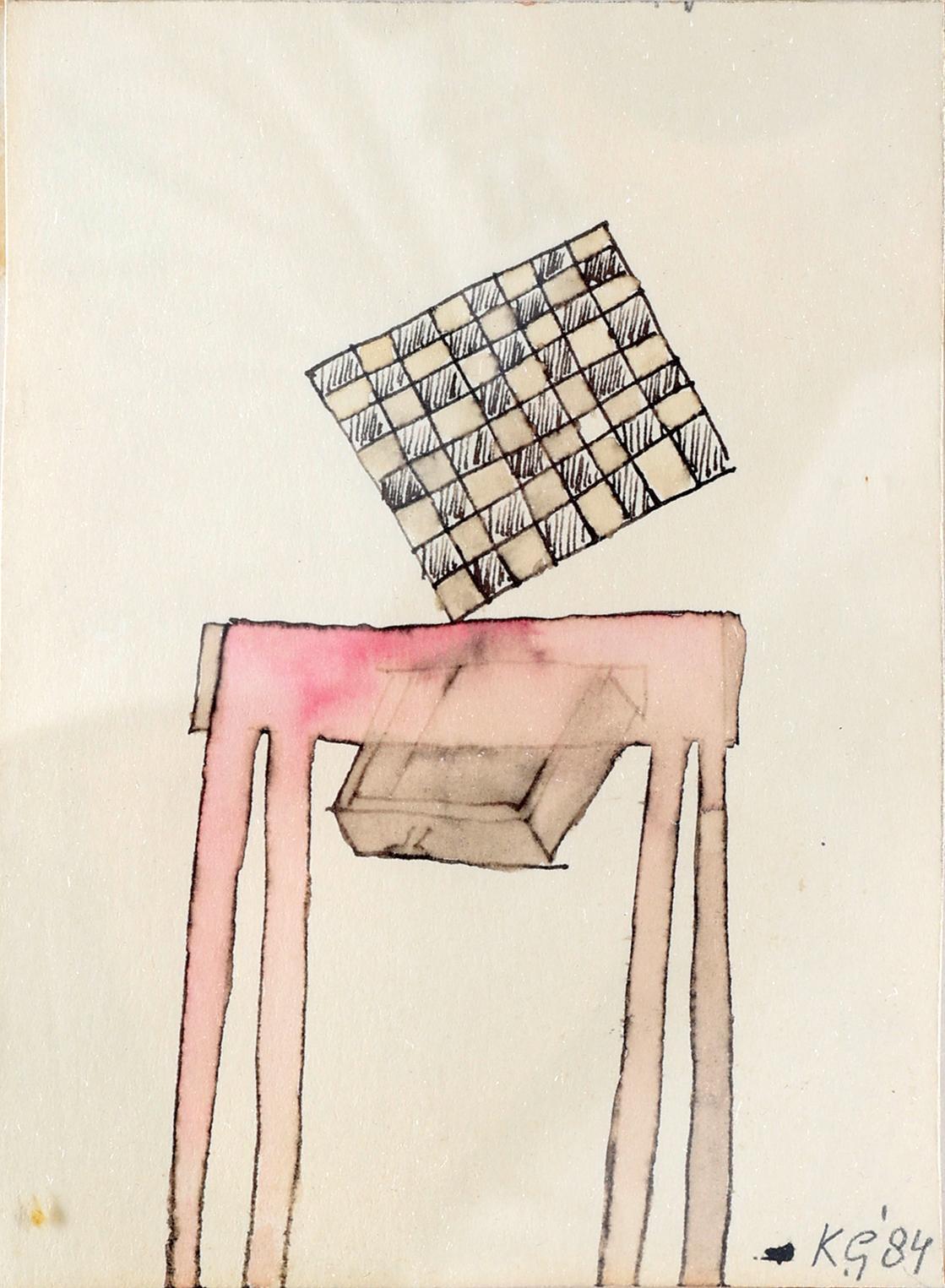Klaas Gubbels (1934), Schaakbord op rood tafeltje, aquarel op papier, gemonogrammeerd en gedateerd ´84, 15 x 11 cm.