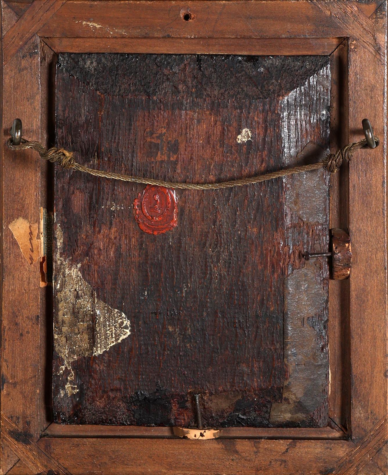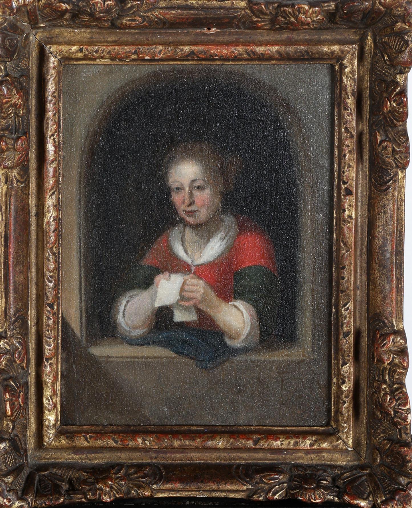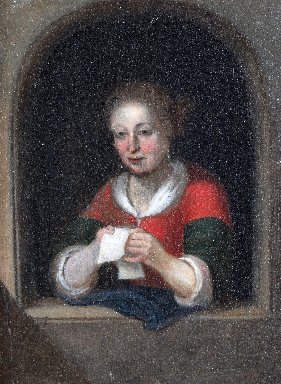 Omgeving Gerard Dou (1613-1675), Dame met een briefje in een stenen nis, olieverf op doek, 14 x 11 cm. met een lakstempel op de achterkant