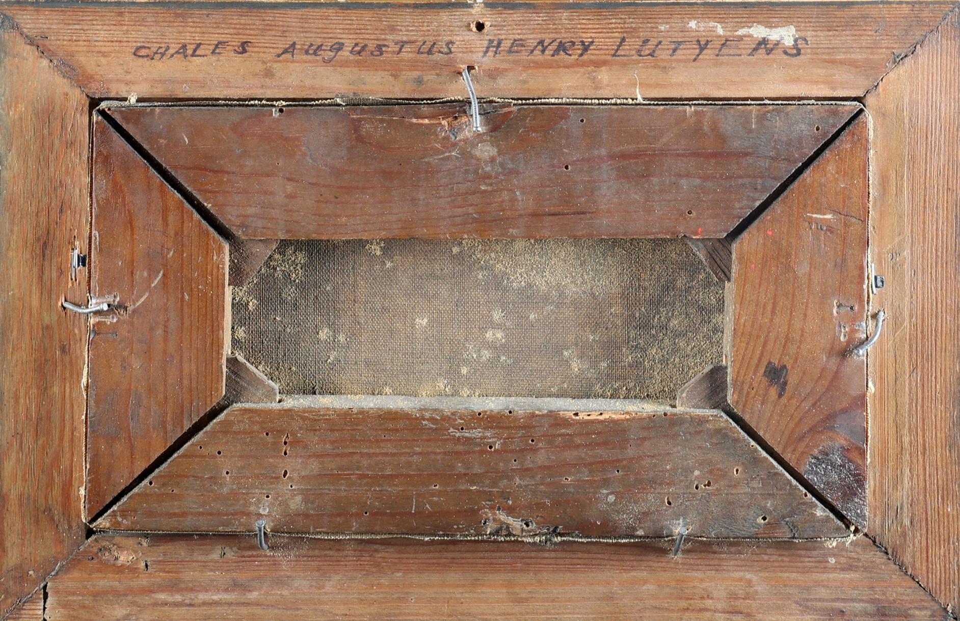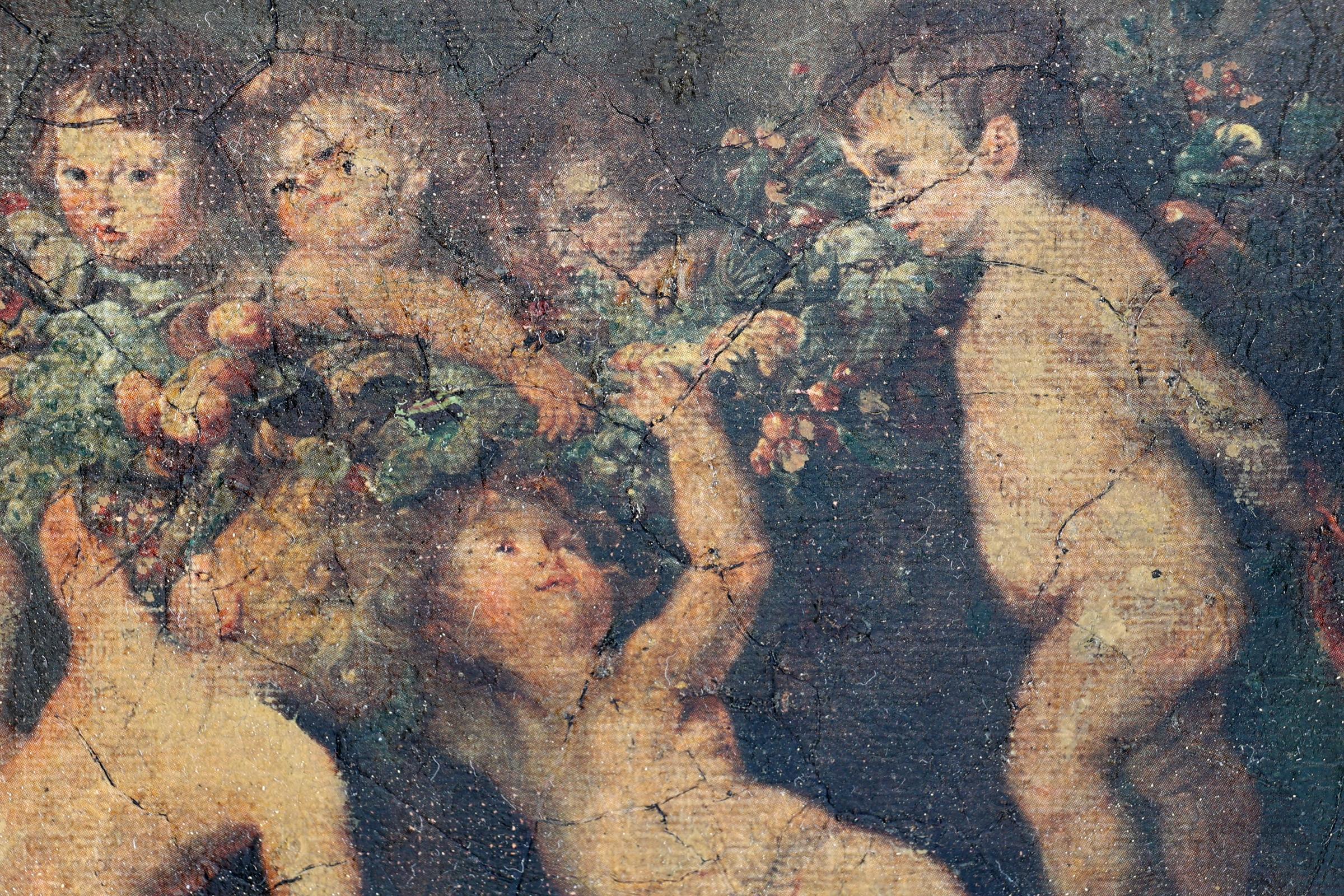 Onb.meester, Engeltjes met bloemetjeskrans, litho op doek, 25 x 15 cm.